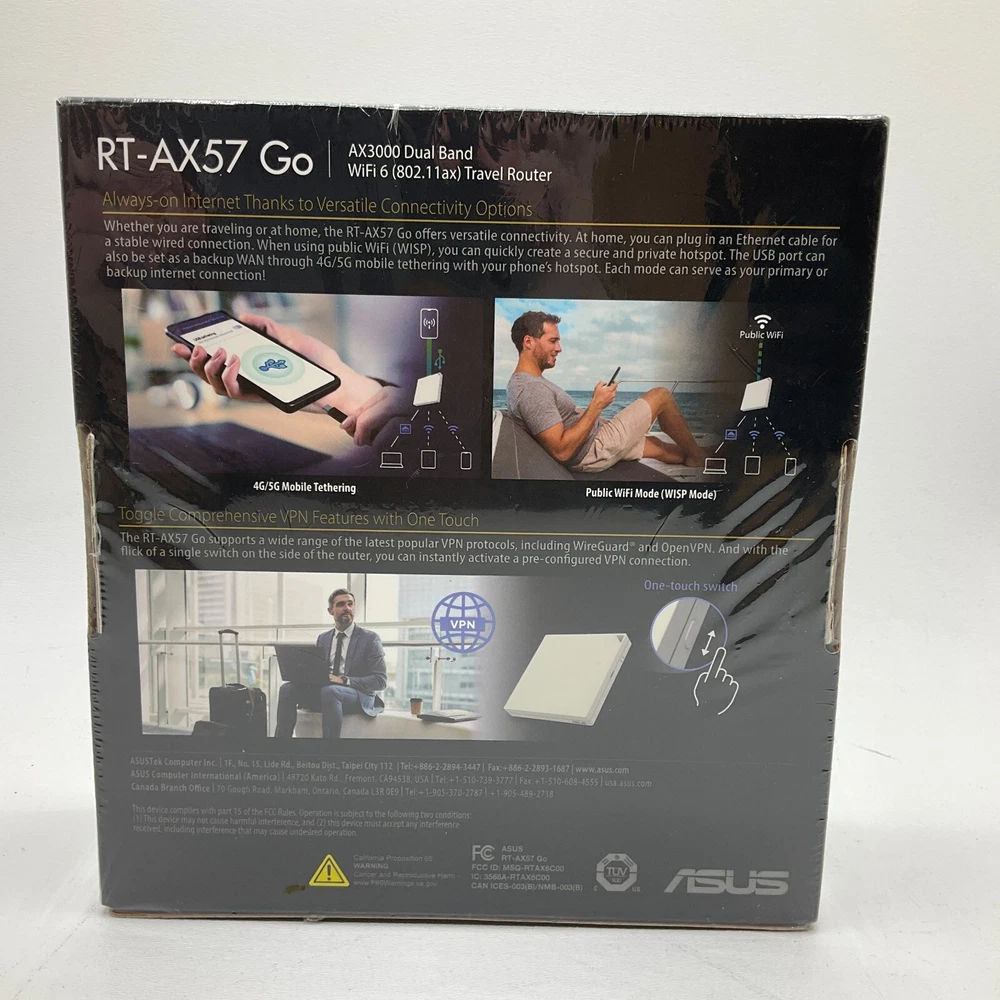 You are looking at a Asus RT-AX57 Go WiFi 6 Travel Router AX3000 Dual Band This item is brand new sealed in the box! Please see all pictures for details! About Us Customer service is our #1 priority! If for any reason you are dissatisfied with your purchase we offer a 30 day money back guarantee unless otherwise noted in the listing (AS-IS/For Parts - No returns.) We only accept items back in the condition that they were sent to you. Items that are listed AS-IS are not eligible for this money back guarantee. If you are unhappy with your purchase PLEASE contact us BEFORE leaving feedback or contacting eBay so we can work with you to resolve any problems. Shipping When we charge shipping to our customers we only pass on to our buyers exact shipping costs - no added fees. We offer combined shipping for multiple items purchased, so if you purchase more than 1 item from us, please wait for us to combine shipping costs. We require signature confirmation on all items that sell for $750.00 & more per eBay's selling policy. We also insurance all items that sell for $250.00 & more. PLEASE NOTE: WE DO NOT WORK/SHIP ON HOLIDAYS OR WEEKENDS! We use the eBay Global Shipping program for international shipping. DLLR License #991 Please note, we are not an authorized distributor or manufacture's representative of this item. *This product may contain a chemical known to the state of California to cause cancer and birth defects or other reproductive harm* Track Page Views With Auctiva's Counter