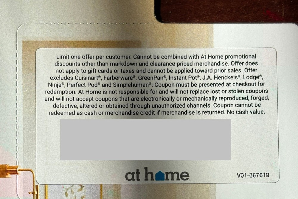 At Home 15% Off Coupon In Store And Online Full Priced Items EXPIRES 2/15/26 Limit one offer per customer. Cannot be combined with At Home promotional discounts other than markdown and clearance-priced merchandise. Offer does not apply to gift cards or taxes and cannot be applied toward prior sales. Offer excludes Cuisinart®, Farberware®, GreenPan®, Instant Pot®, J.A. Henckels®, Lodge®, Ninja®, Perfect Pod® and Simplehuman®. Coupon must be presented at checkout for redemption. At Home is not responsible for and will not replace lost or stolen coupons and will not accept coupons that are electronically or mechanically reproduced, forged, defective, altered or obtained through unauthorized channels. Coupon cannot be redeemed as cash or merchandise credit if merchandise is returned. No cash value. TO CLARIFY, THIS IS NOT JUST VALID ON ONE ITEM. IT’S VALID ON ALL FULL-PRICE ITEMS MADE IN ONE ENTIRE TRANSACTION! Below are just a few examples of how much this 15% off coupon could realistically be worth. The larger your purchase of regular priced items, obviously, the larger the savings amount. Amount spent. Amount saved with 15% Coupon. $100. $15 $300. $40 $500. $75 $1000. $150 $1500. $225. $2000. $300. Buyer pays shipping or I dm it to you for online shopping after purchase. Thanks and happy shopping!