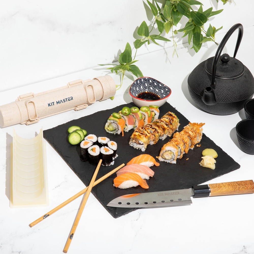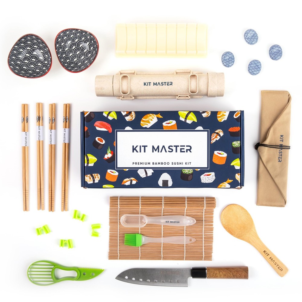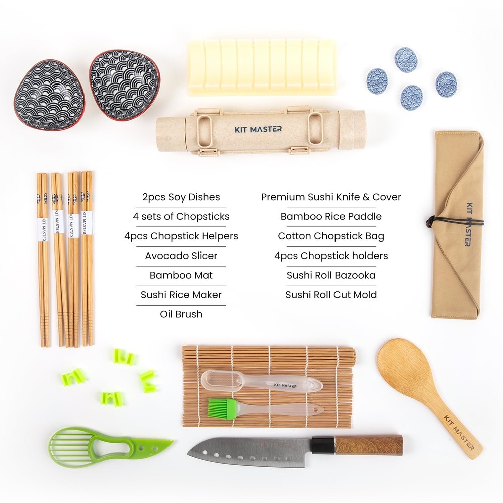 sushi-making kit includes a variety of tools to enhance your sushi-making experience. Make restaurant-quality sushi rolls from the comfort of your own home. Why waste time and money on expensive take-outs and dine-ins? When you can simply buy fresh ingredients and create your own delicious sushi and rolls. Do you have food allergies or a picky eater at home? No problem! With Sushi kit you can cater to restrictions or special requests. Everything you need is in this kit with additional tutorial videos on our website. ALL-INCLUSIVE KIT: ’s Sushi kit includes everything you need to make a great Sushi making experience. The kit includes a premium stainless-steel knife and knife cover for safety, a bamboo sushi mat, bamboo chopsticks, chopstick helpers, a roll Bazooka, a Nigiri rice mold, a bamboo rice paddle, two large soy dipping dishes, an avocado slicer, a Sushi maki cut mold, a brush and chopsticks holders. FUN AND EASY: This DIY kit is for both beginners and pros. Kit Mater's set makes making any of your favorite rolls or sushi easy. You can pick and choose all the healthy ingredients and avoid any allergies without the hassle of take-out mistakes. Don't waste your money on overpriced Sushi when you can enjoy a fun night with your children and friends creating tasty meals in the comfort of your home. SAFE AND DURABLE: All tools are easy to clean, dishwasher safe, and made with BPA-free, high-quality, durable materials. The kit includes a heavy-duty blade protector cover for your sushi knife for safe storage. A cloth bag to store away your bamboo chopsticks after usage. You can use the box to store all your tools when not in use. PERFECT GIFT: 's Sushi Set is a great gift for sushi lovers or sushi novices. This kit is great for date nights, family fun nights, special anniversaries, Birthday dinners, housewarming parties, and Holidays, or for anyone who wants to show off the chef in them. LIFETIME GUARANTEE: We pride ourselves in selling the highest quality, trustworthy products. If you are not satisfied, please reach out to us and we will be happy to assist with any concerns. Come and visit our website Kit-Master.com for more information. From one sushi fan to another, knives out! Let's get rolling!