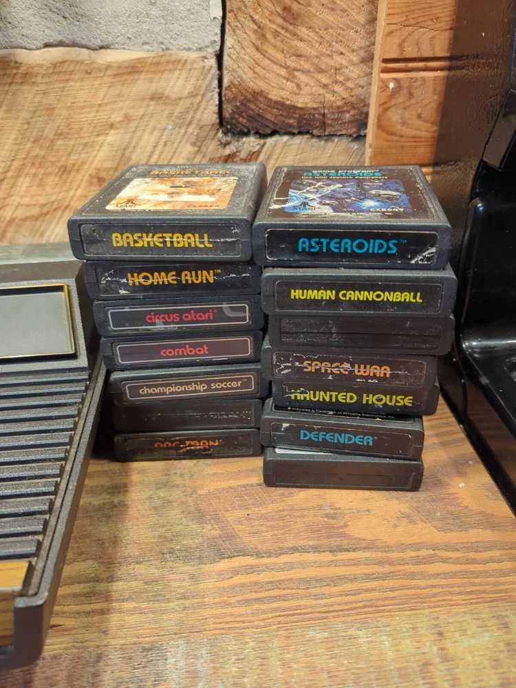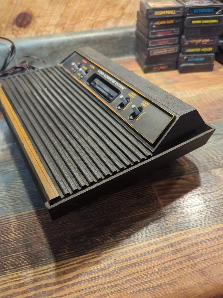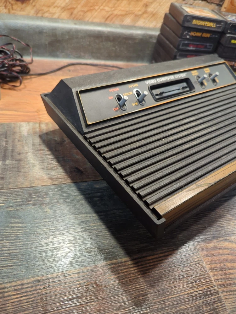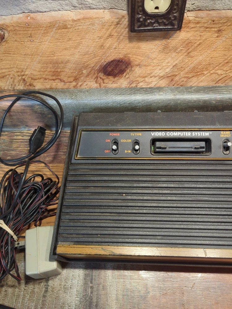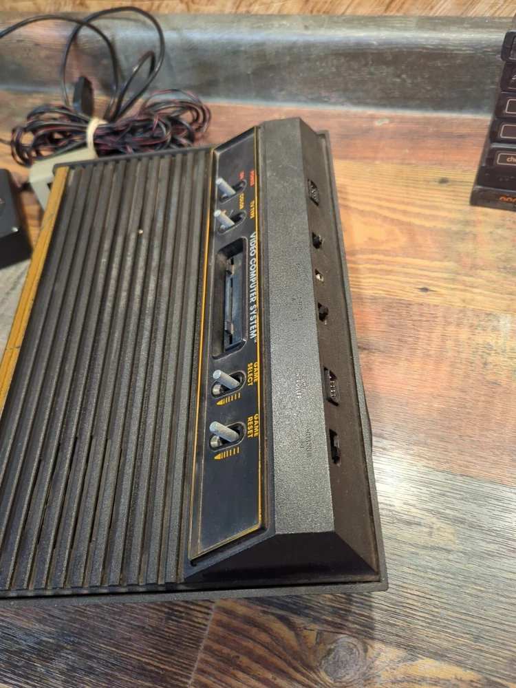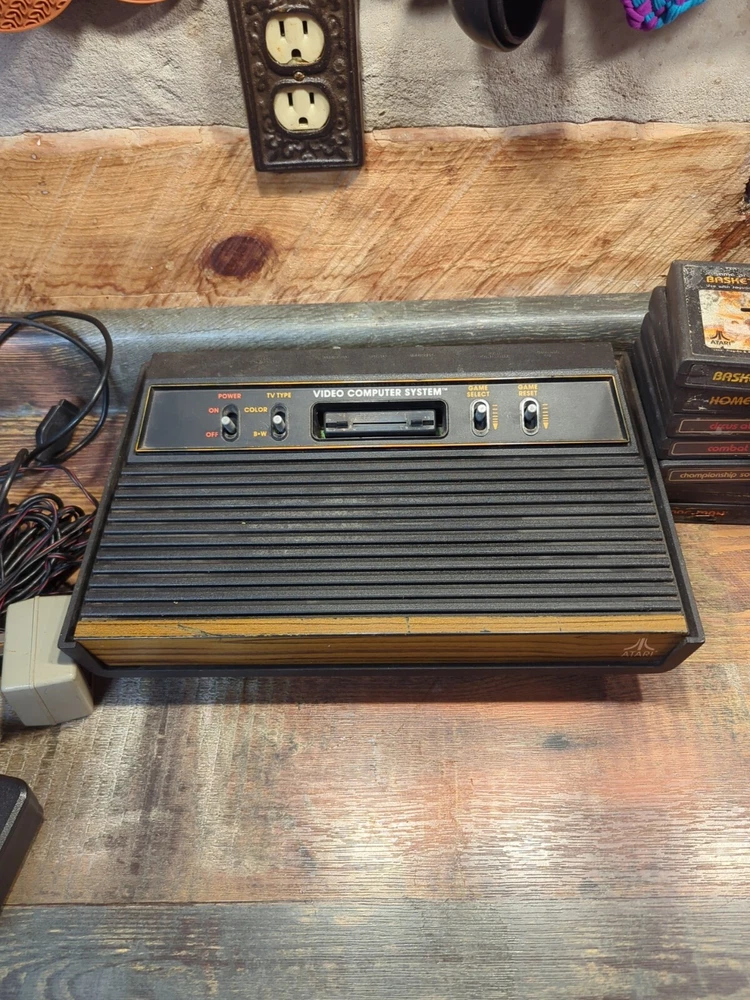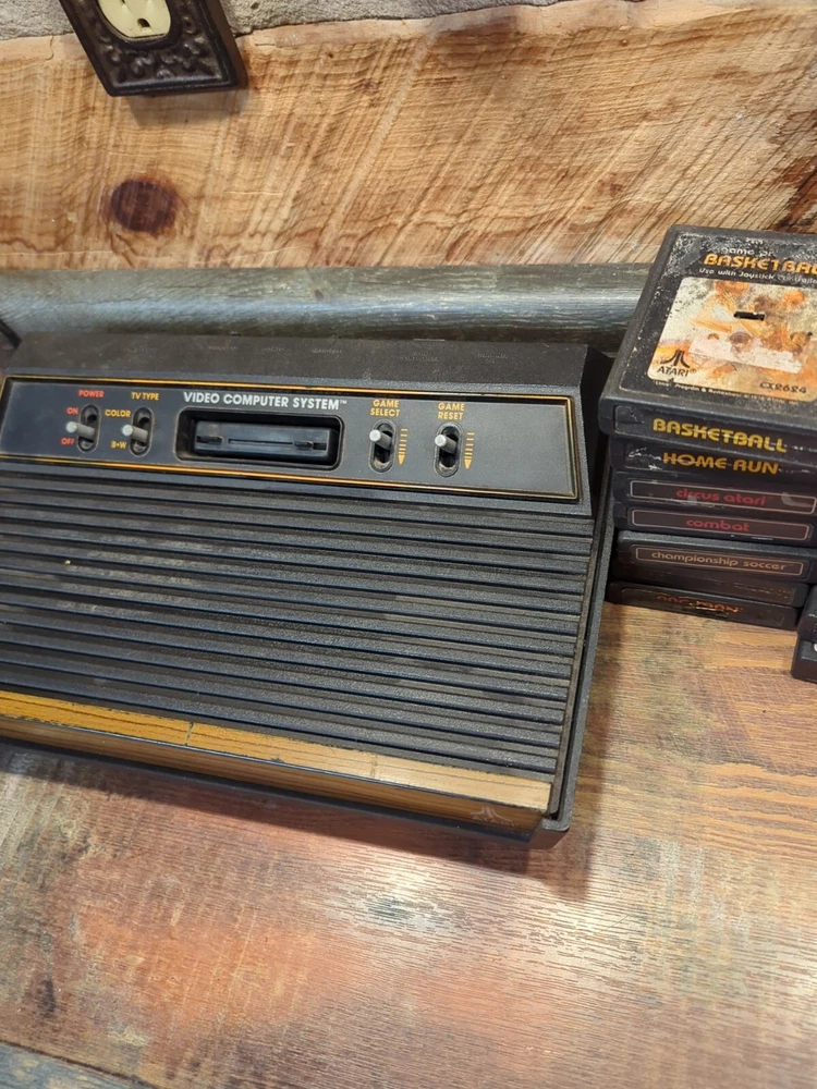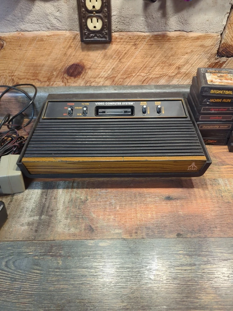 Selling as is Just how I found it estate sale Has 14 games OEM POWER CORD AND CONTROLLER JOYSTICK EVERYTHING IS UNTESTED NO RETURNS The product is an Atari 2600 4 Switch Woodgrain Console Bundle with games included. It is a brown-colored Atari 2600 console, NTSC region code, and falls under the Video Game Consoles category. The console is designed by Atari and is for the Atari 2600 platform. It is being sold as part of an estate sale and is being sold untested.