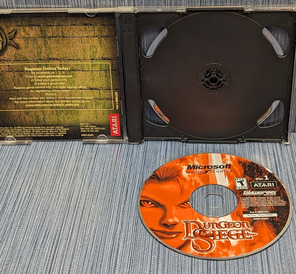 Atari / Microsoft Game Studios Dungeon Siege for PC 2004 RPG Chris Taylor UPC: 742725260610 Total Annihilation creator Chris Taylors' project entitled Dungeon Siege, an action fantasy role-playing game that combines elements of both role-playing and real-time strategy in this gigantic, continuous, fully 3D fantasy world on an adventure to discover and conquer what evil has befallen the land. Take on the evil with up to eight characters or mules to adventure with you and watching your back. Fight hordes of enemies in real-time, as you plan your next strategic move in an over-the-top battle view. Experience seamless gameplay as you journey from the highest mountain to the deepest dungeon without ever stopping to watch a loading screen.