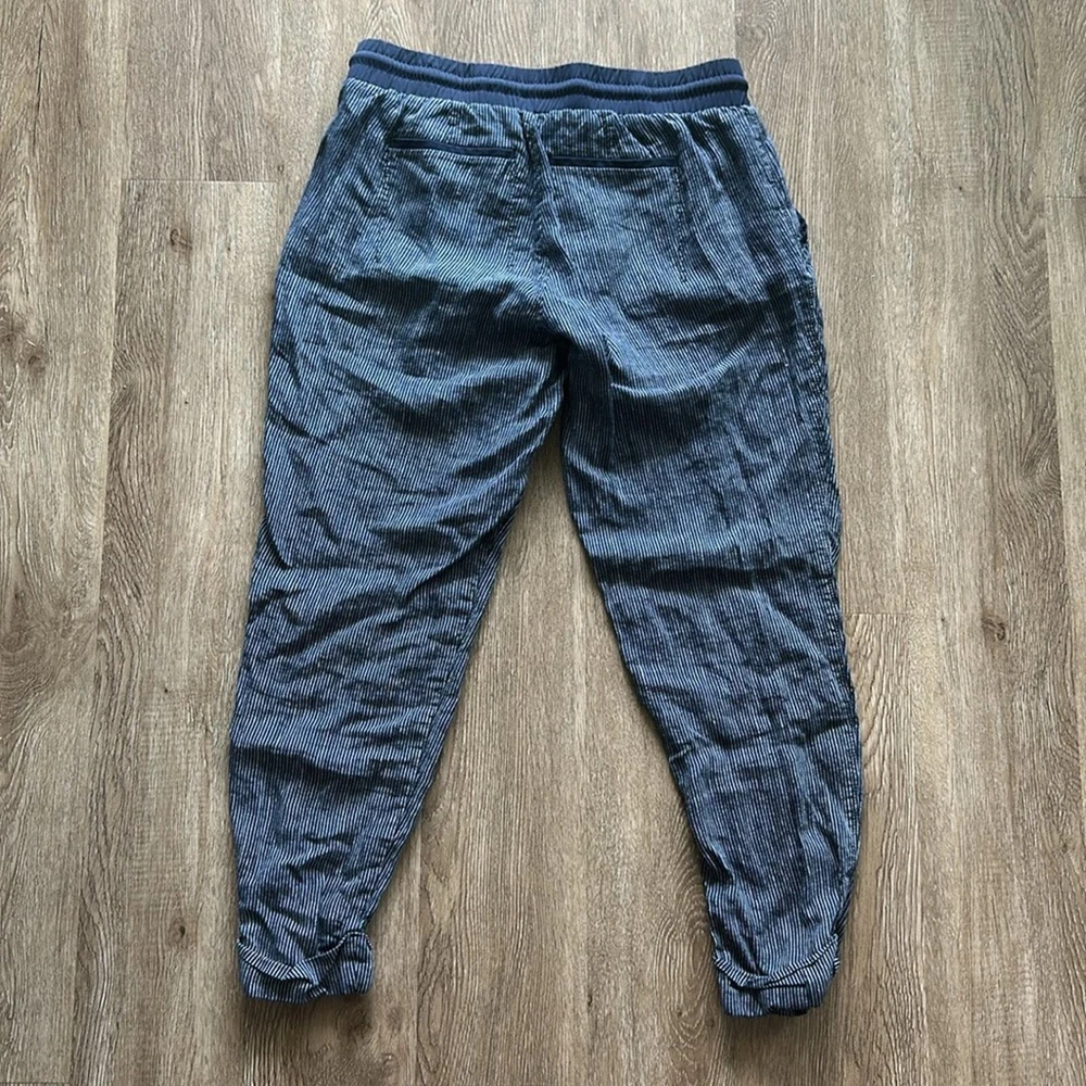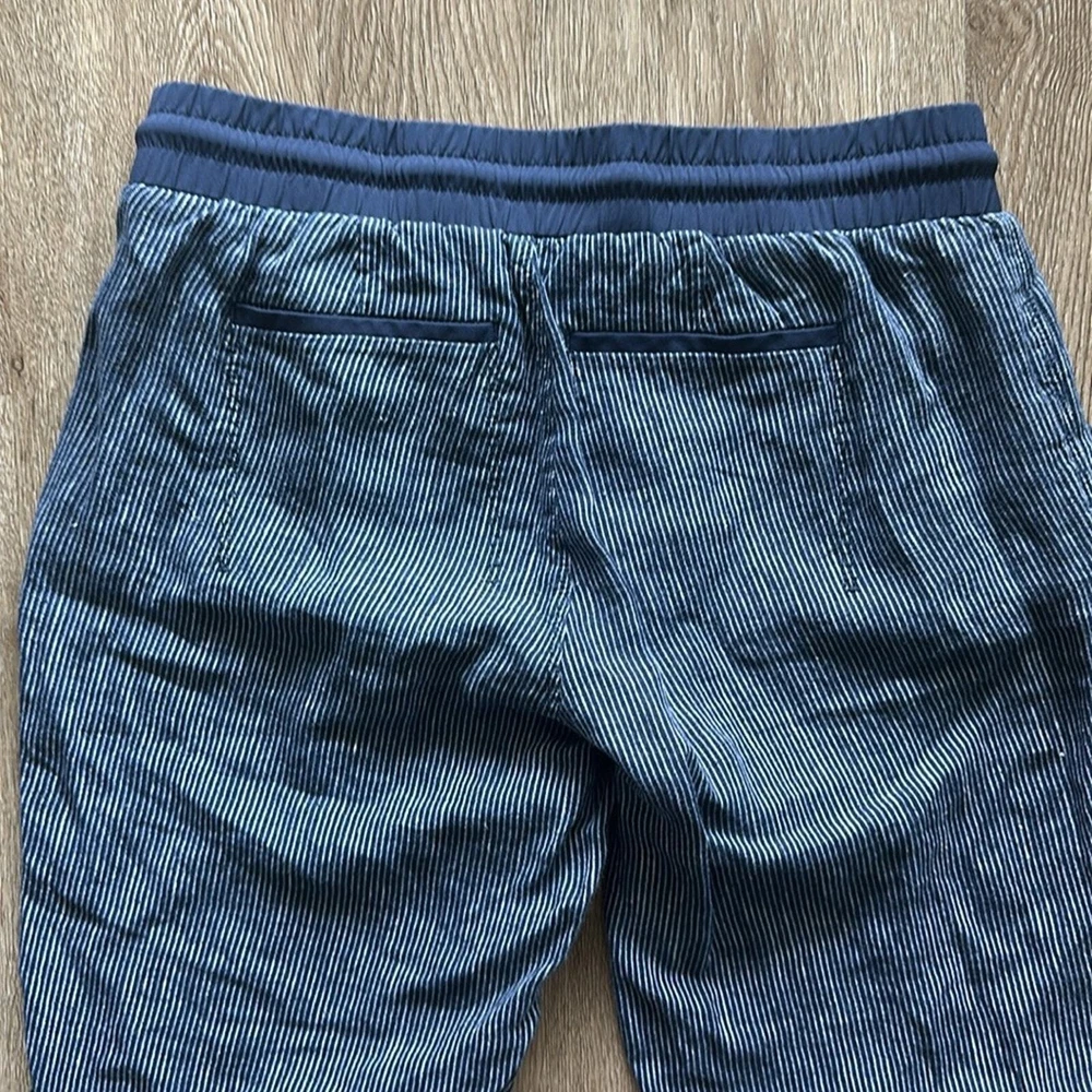 Excellent condition, gently worn Size: 8 Inseam: 25" Color: Blue & White Striped - Pull on - 100% Linen - Two front & back pockets - Cuffed at ankle - Elastic waist - Functional drawstring - Semi fitted - Mid rise