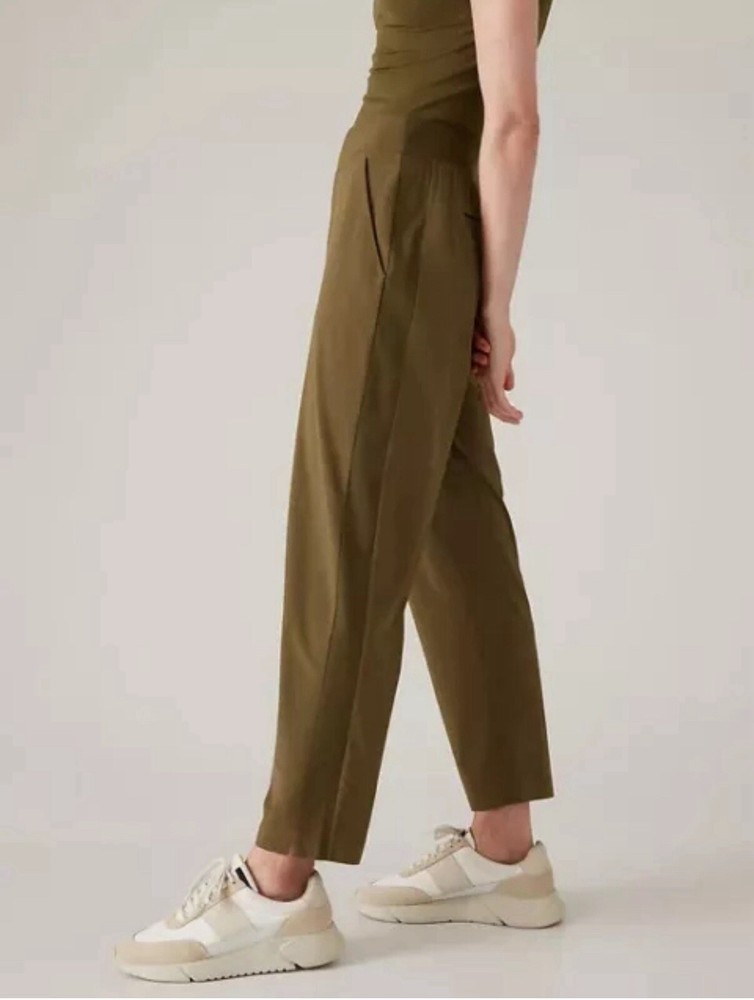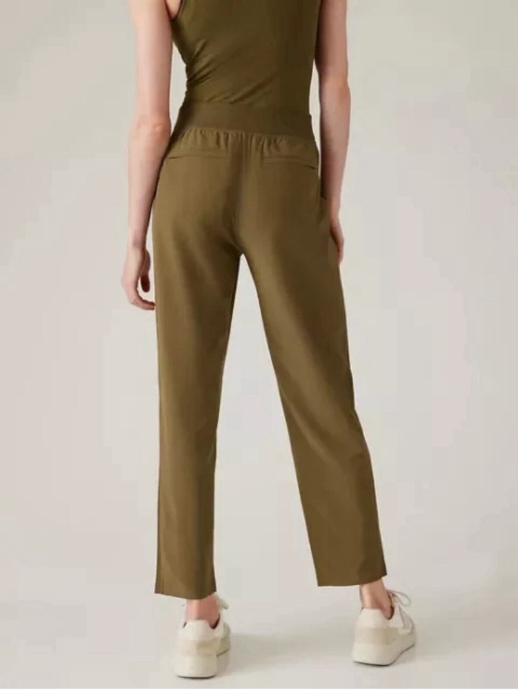 Athleta Brooklyn Mid Rise Ankle Pant, Acacia Olive Pants Size 12 Excellent pre-owned condition Waist across:17” Rise:12” Inseam:28” With ribbed panels at the waist for mobility & comfort, these lightweight pants in our Featherweight Stretch fabric can be dressed up or down as you please. We love them for travel because they don't wrinkle easily." Recycled Polyester/Spandex FEATHERWEIGHT STRETCH™. Silky sleek fabric made from recycled polyester is so lightweight, it feels weightless BREATHABLE. Sweat can travel through the fabric so it can evaporate on the surface WRINKLE-RESISTANT. Packable fabric stays smooth in your bag QUICK-DRYING. Dries in a flash for comfort factor IT FEELS: Ultra-lightweight, silky sleek, stretchy RATED UPF 50+ (Excellent Protection) Machine wash and dry.
