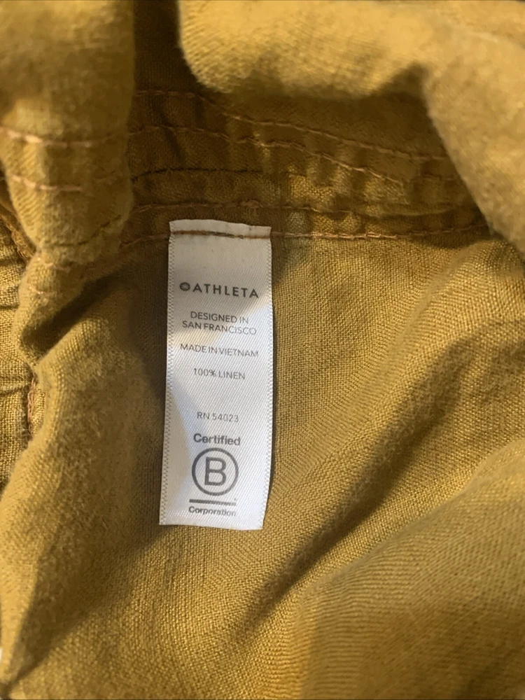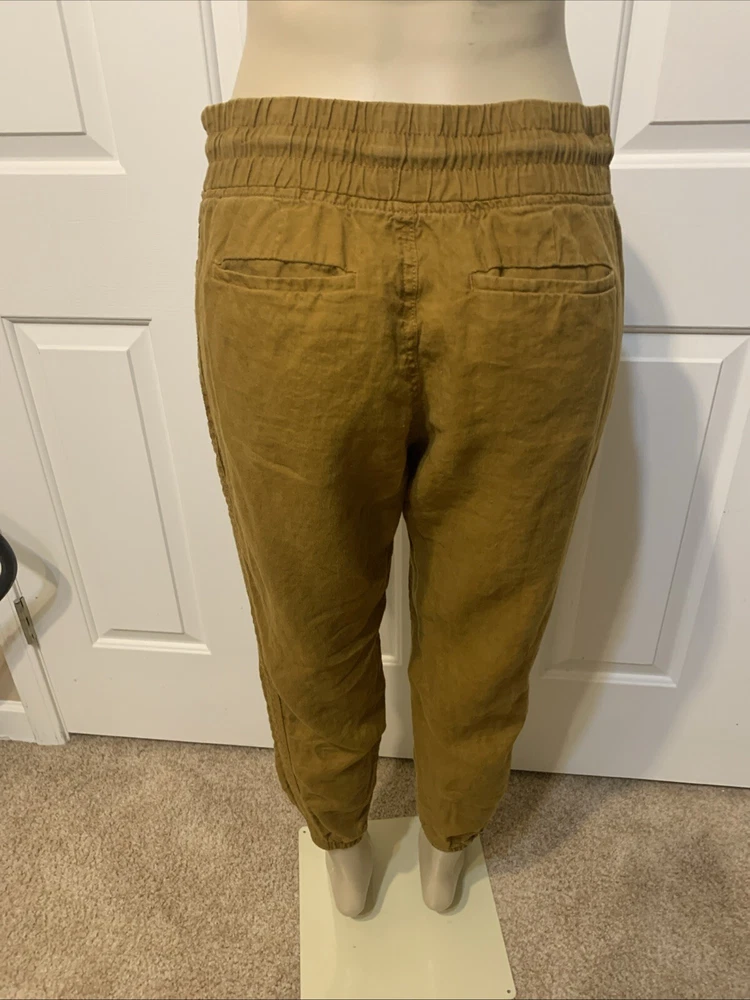 This is a pair of Athleta Cabo Linen Jogger pants in size 8, designed for casual wear. The pants come in a solid brown color and feature a drawstring closure for an adjustable waist. Made from lightweight linen fabric, they have a tapered leg style with a 27-inch inseam. The joggers are perfect for activities like walking, cycling, and hiking during the summer, fall, or spring seasons, offering comfort and style with an elastic waist and pockets for added convenience.