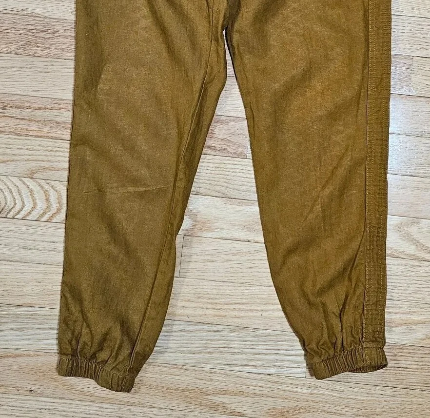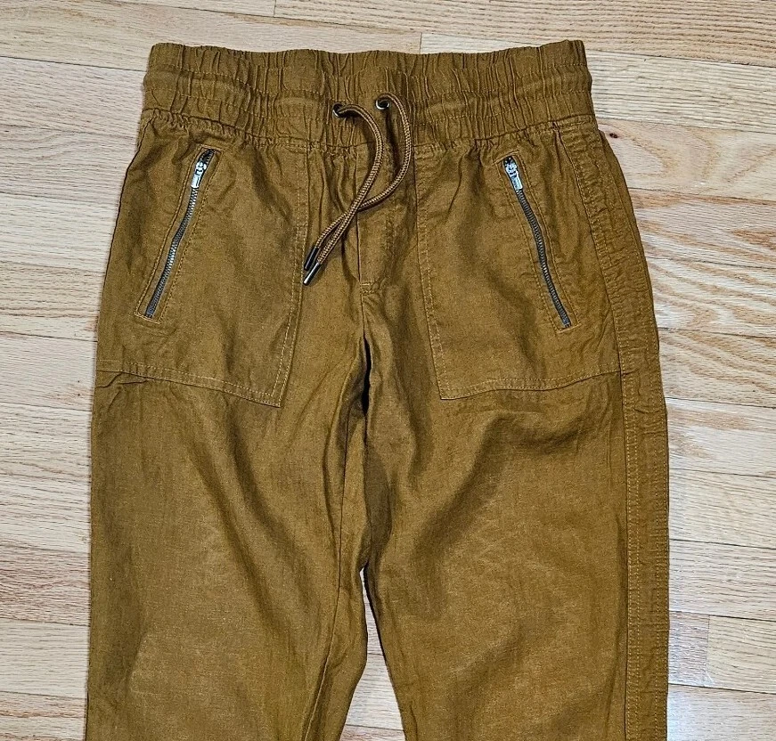 Athleta Cabo Linen Jogger Pants Good pre-owned condition, no flaws 100% linen Color is toasted ocher, I would describe it between mustard yellow and brown Pull on with elastic waist and drawstring Zip pockets Marked a size 4 Approximate measurements 14.5 inches across waist when not stretched, easily stretches to 16.5 inches 10.5 inch rise 27 inch inseam