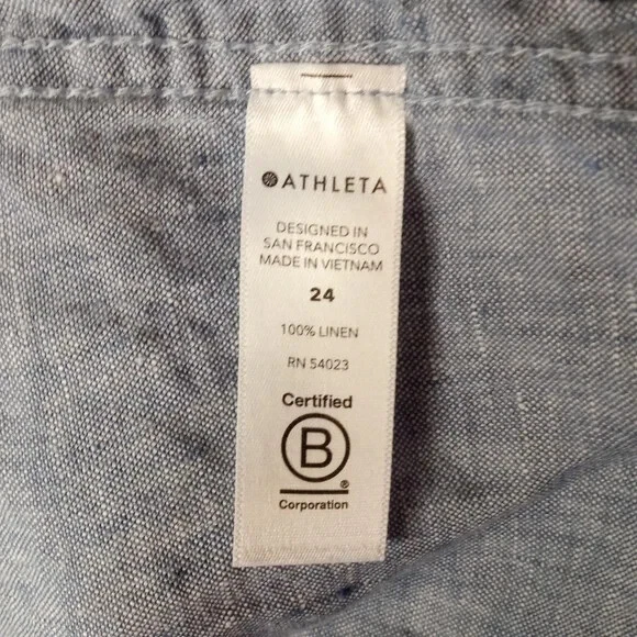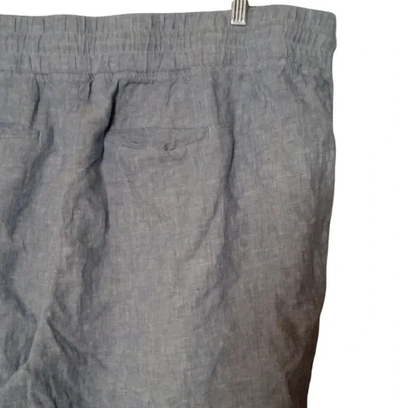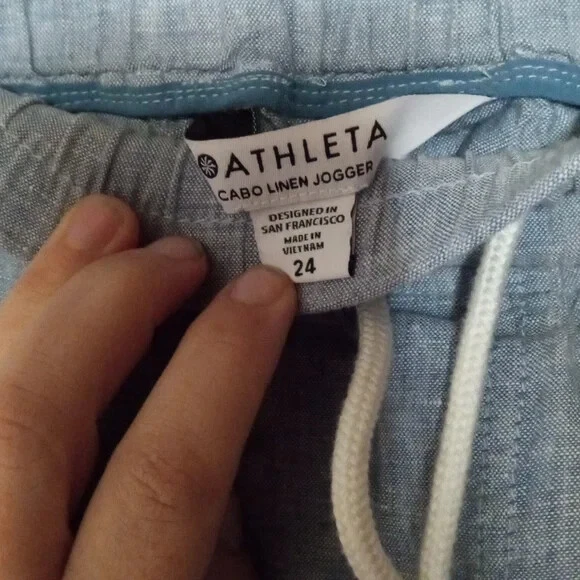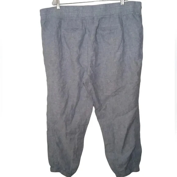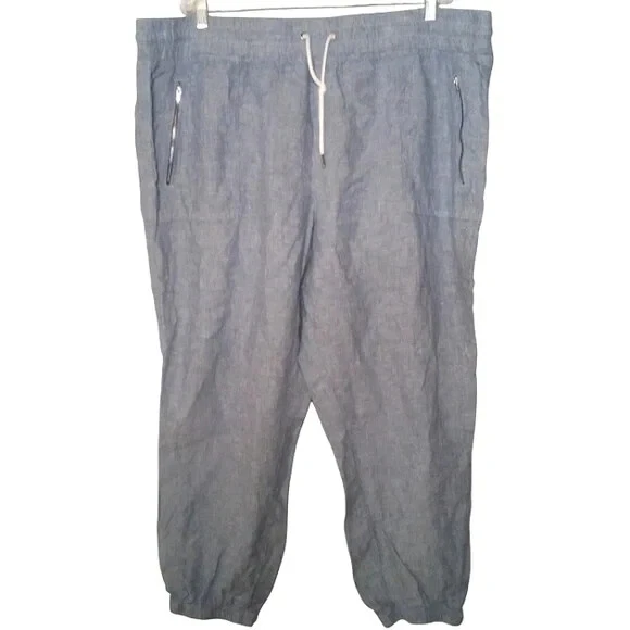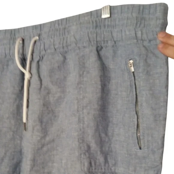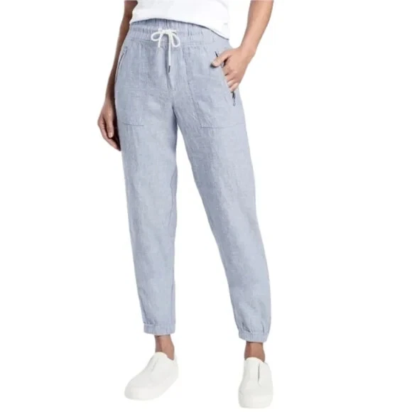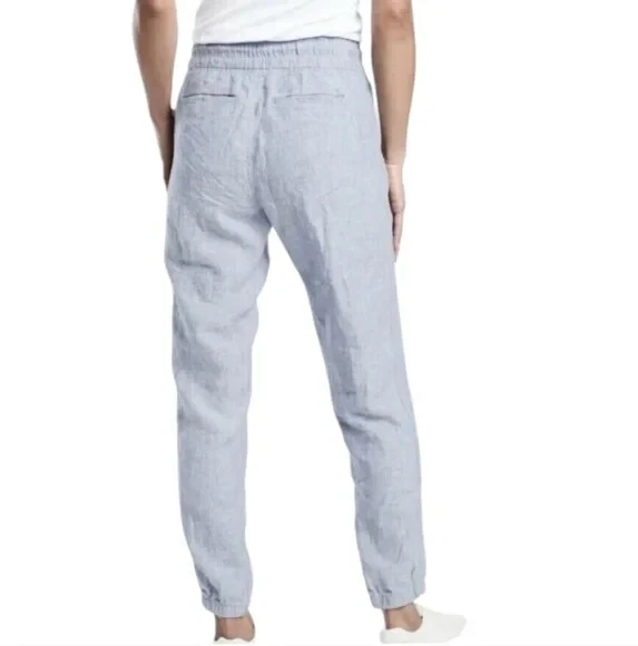 Athleta Cabo Linen Joggers In Chambray Blue Women's Size 24 FOR: Warm-weather travels, resort vacations and to and from the beach FEEL: Subtly textured linen feels light on the skin FAVE: Zip pockets secure your essentials Semi-fitted, skims easily over the body 100% Linen Excellent Pre Owned Condition Waist 23" Rise 16" Inseam 28" Summer, Spring, Lightweight, Contemporary,