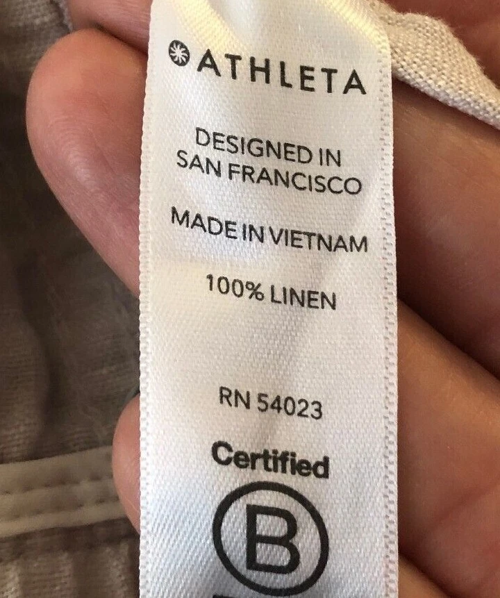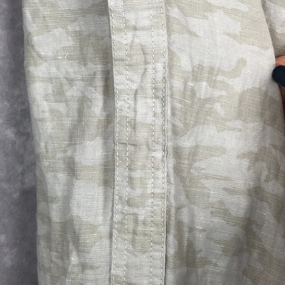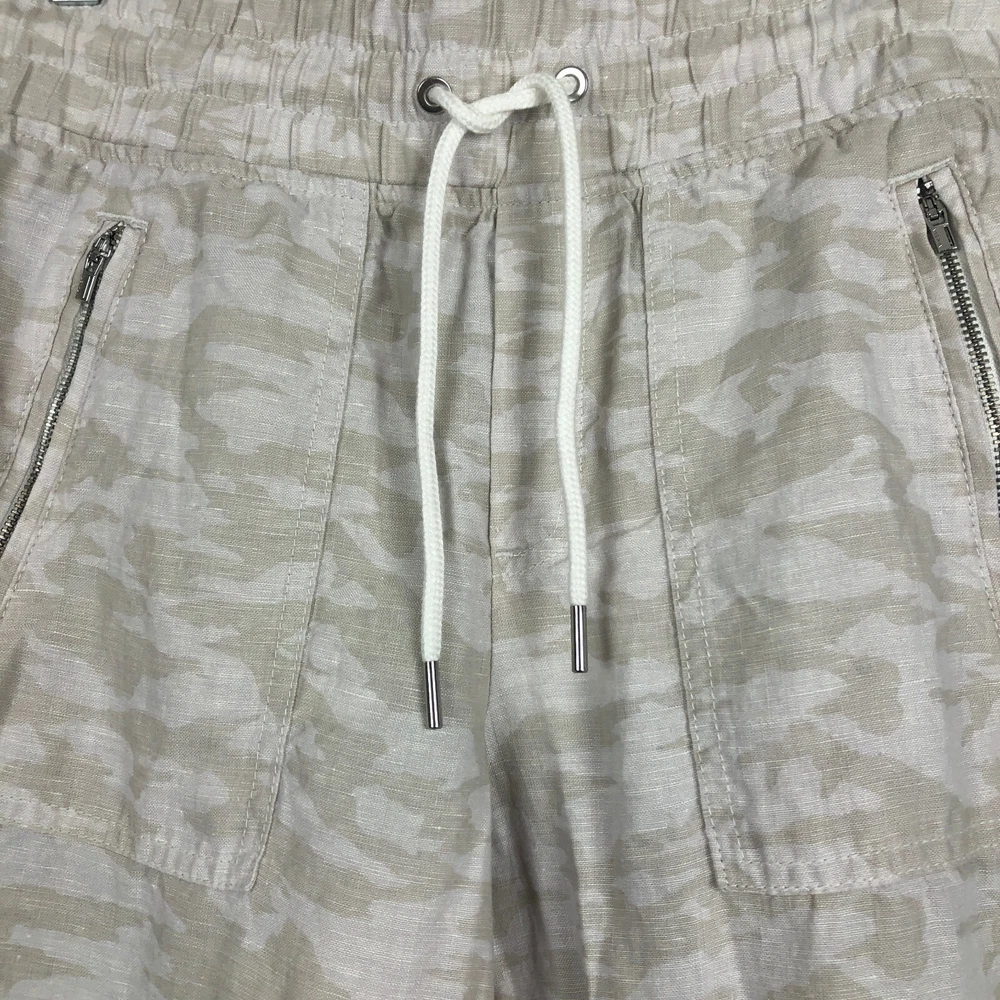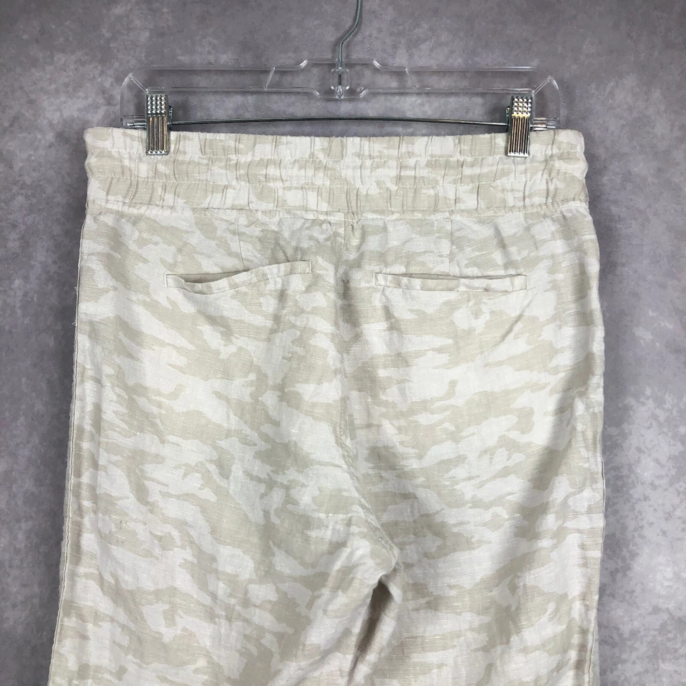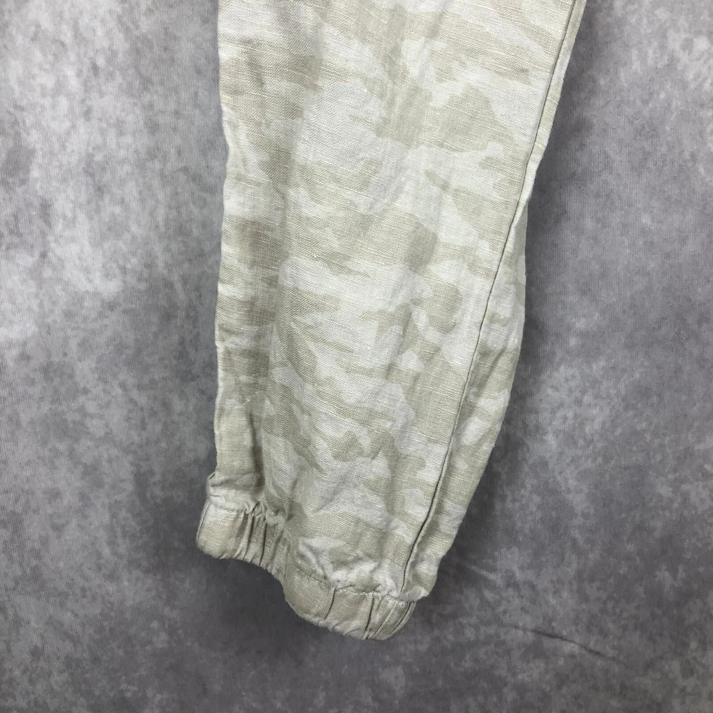 Athleta Cabo Tide Linen Camo Jogger Pants Size 4 Front zipper pockets. Drawstring. Elastic waist band. Back pockets. 100% linen Measures approximately: Waist 30" (unstretched & untied) Inseam 28" Excellent preowned condition. (N)