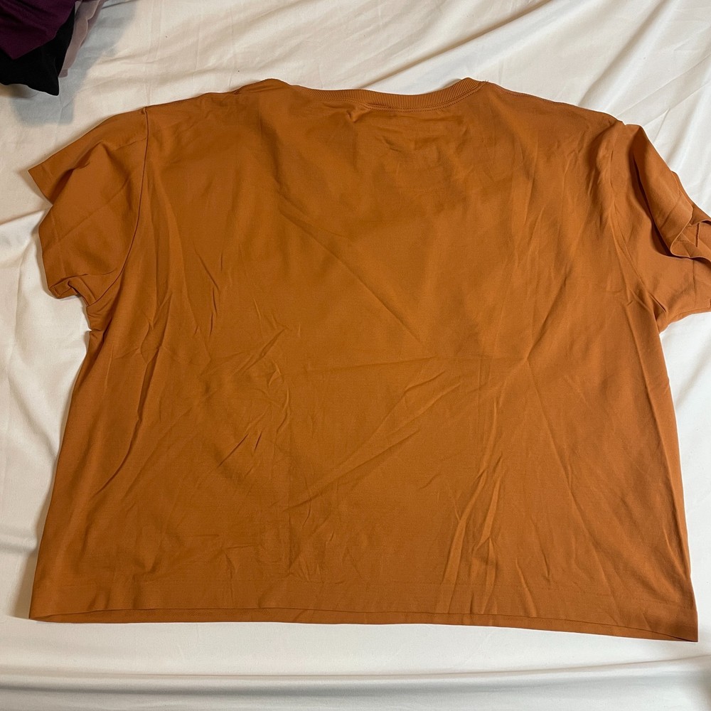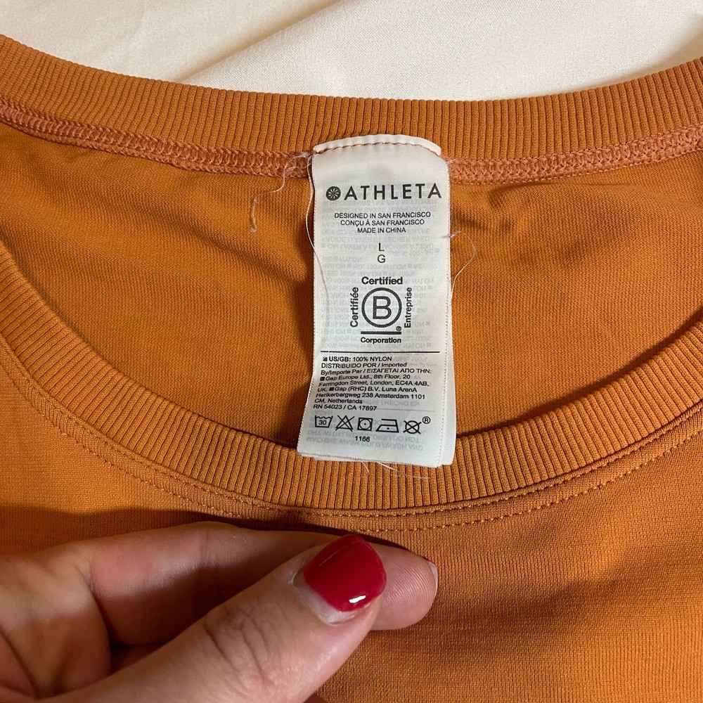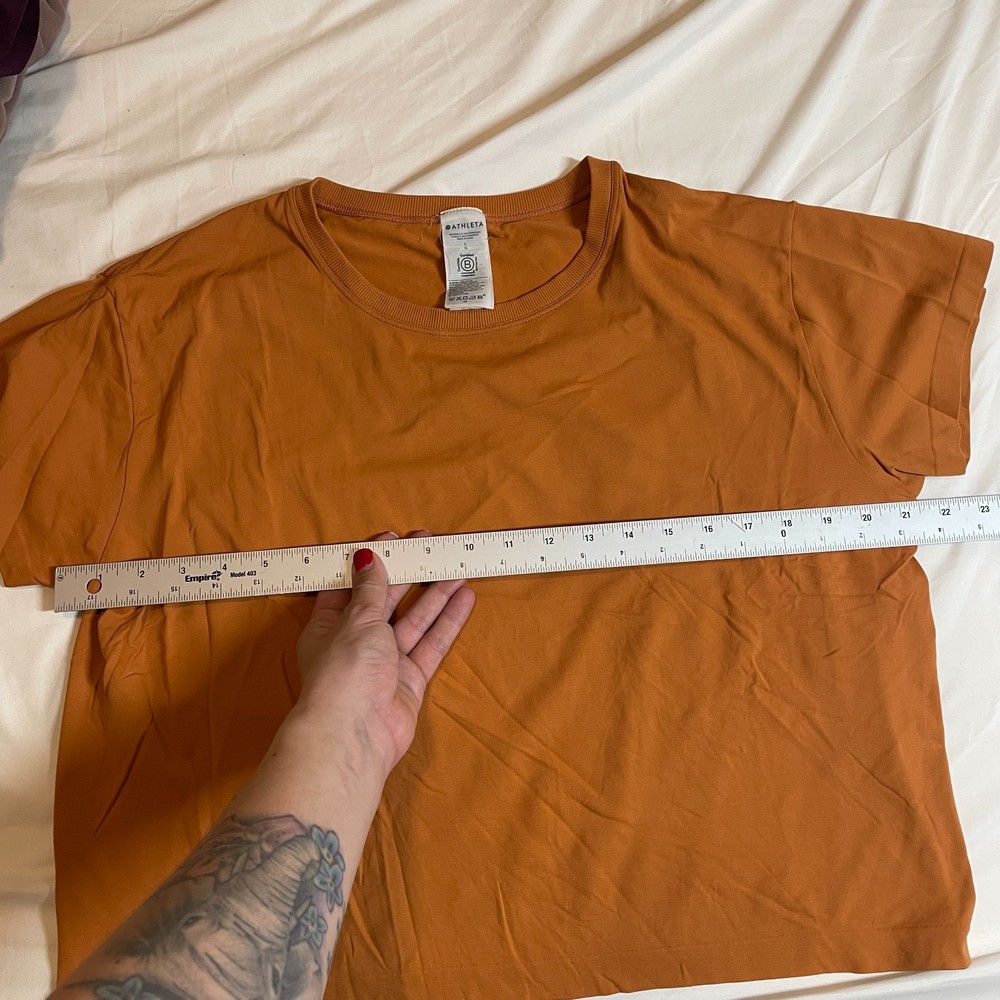 Athleta Cropped T Shirt Women L Crew Orange Athleisure Gym Outdoor Running Excellent Used Condition. This item has no rips, stains or defects. Please see photos for measurements, care tag and material tag.
