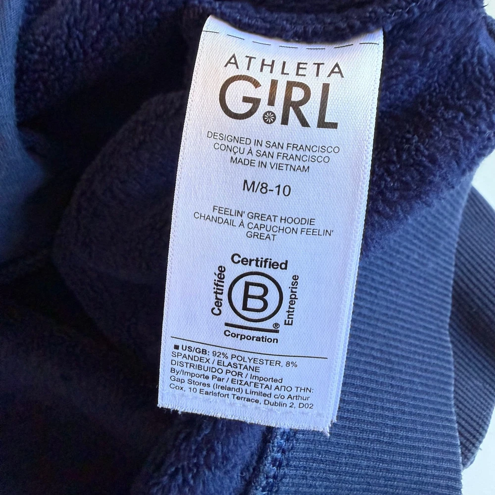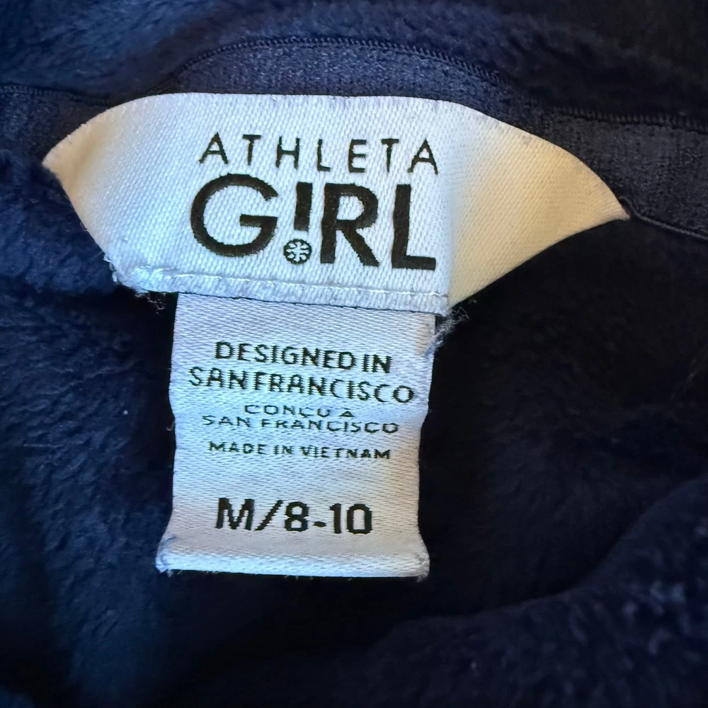 Girls size medium 8-10 Athleta Girl, Feelin Good Hoodie in Navy Blue. Super soft plush fabric. Kanga pocket. Thumb holes. Good/fair condition for paint stain on wrist. See close up photo. Otherwise great shape! So soft and comfy!! C-4577