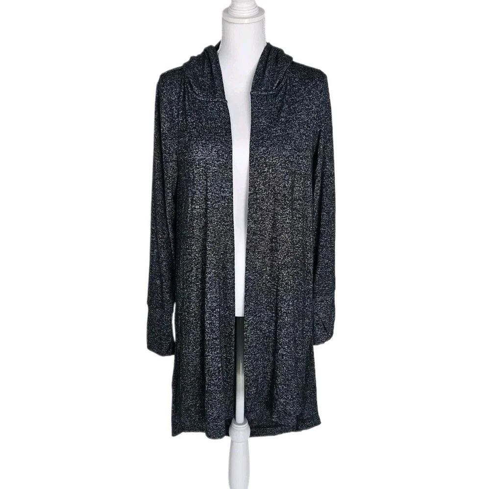 Athleta Harmony Wrap Oversize Waterfall Cardigan Hooded Drape Back Size Small Gray 76% Rayon 21% Polyester 3% Spandex Approximately 38" long Great for fall outfits, all seasons. This oversized waterfall cardigan has thumb holes, a hood, and a beautifully draped back. Could fit size medium. Good preowned condition