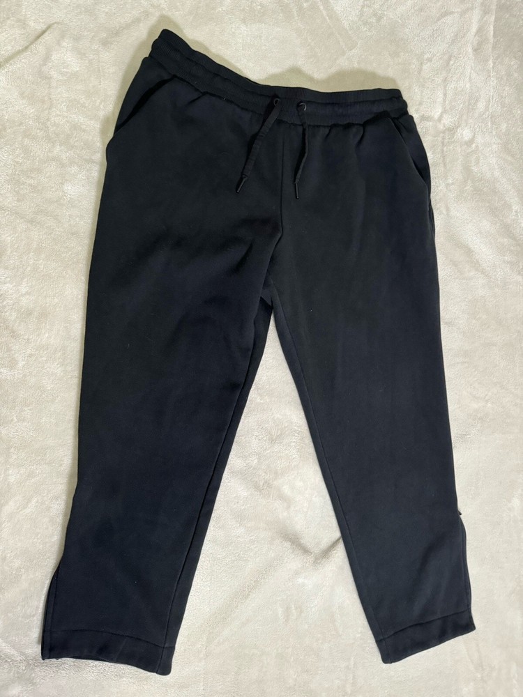 Elevate your casual wardrobe with these Athleta Women's Cozy Karma Zip Pants in black. Featuring a solid pattern and a relaxed fit, these sweatpants are perfect for any casual occasion. The pants have a tapered leg style and a flat front with an adjustable waist and drawstring closure for a comfortable and secure fit. Made with a polyester blend fleece fabric, these pants are machine washable and easy to care for. They also come with several features like pockets, ankle zip, and stretch for added comfort. These pants are perfect for petites and are available in size large. Get ready to stay comfortable and stylish all year round with these Athleta Women's Cozy Karma Zip Pants.