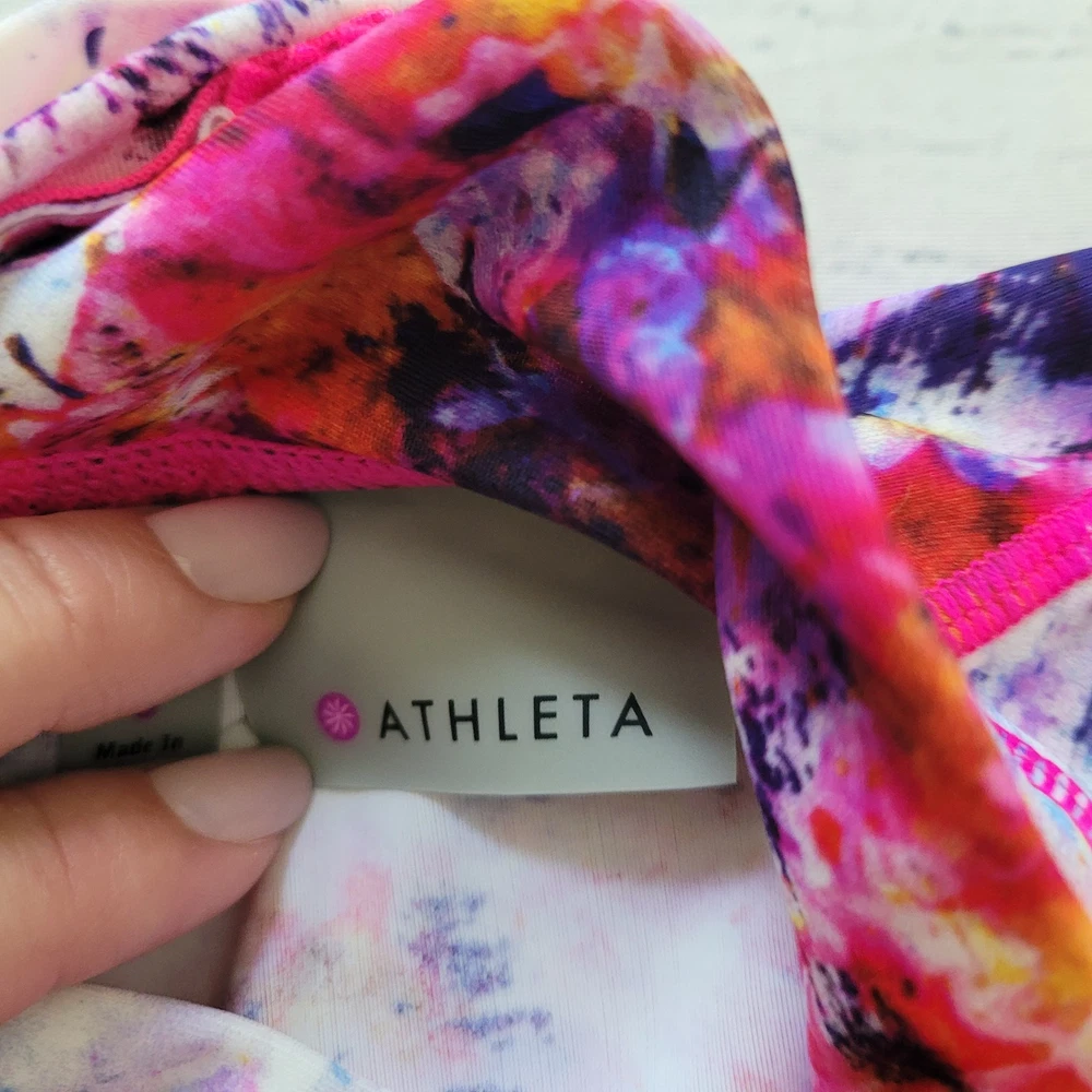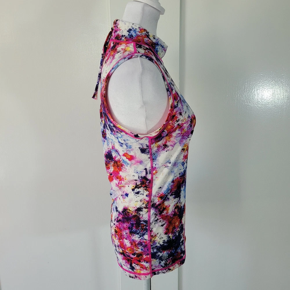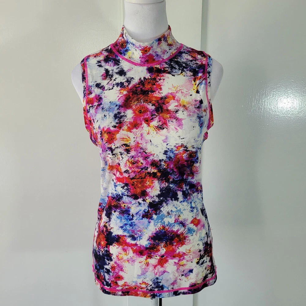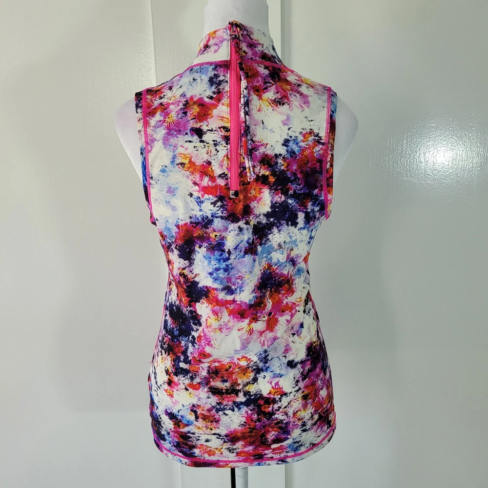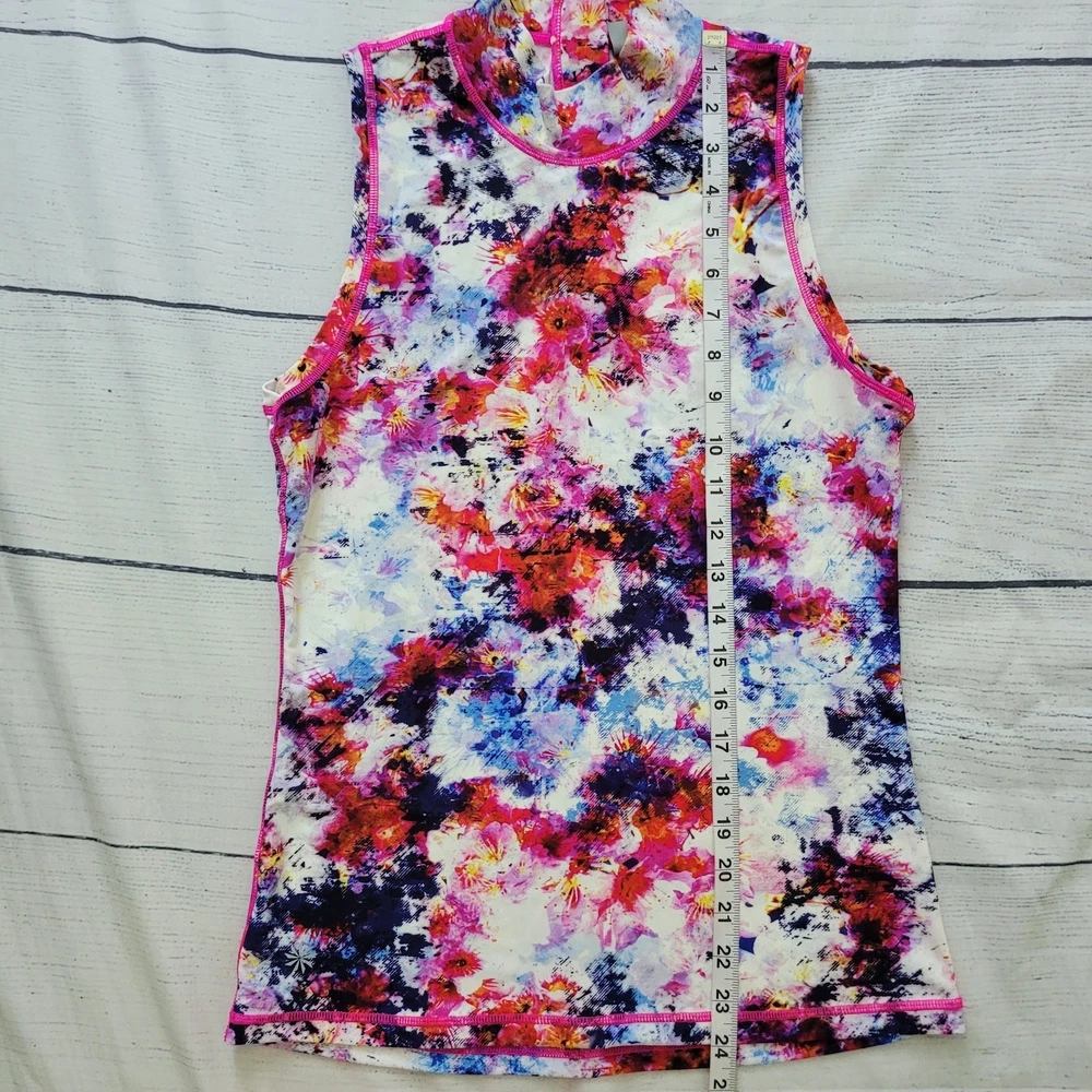 Athleta Size S Hypersonic Rashguard Tank Mock Neck Zipper Back Athletic Top This Athleta Hypersonic tank top is perfect for any active woman. With a mock neck and a zipper back closure, it is both stylish and functional. It is stretchy, breathable, and easy to care for. The watercolor pattern and multicolor design make it perfect for any beach or sports activity. It features compression and a slimming effect. This tank top is suitable for activities such as gym and training, walking, cycling, water sports, hiking, running, and jogging -Materials: nylon, spandex, and lycra -Excellent, pre-owned condition. No visible stains, flaws or tears. No to minimal signs of previous wear. Measurements included in photos - please inquire if more are needed. All offers considered - make one today!