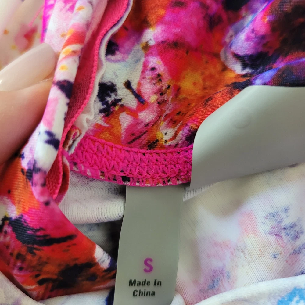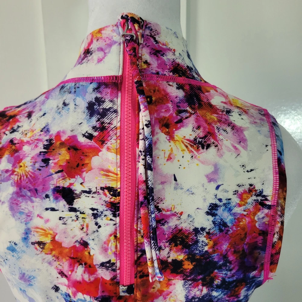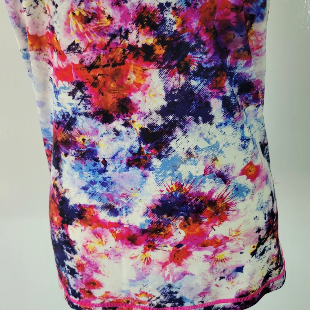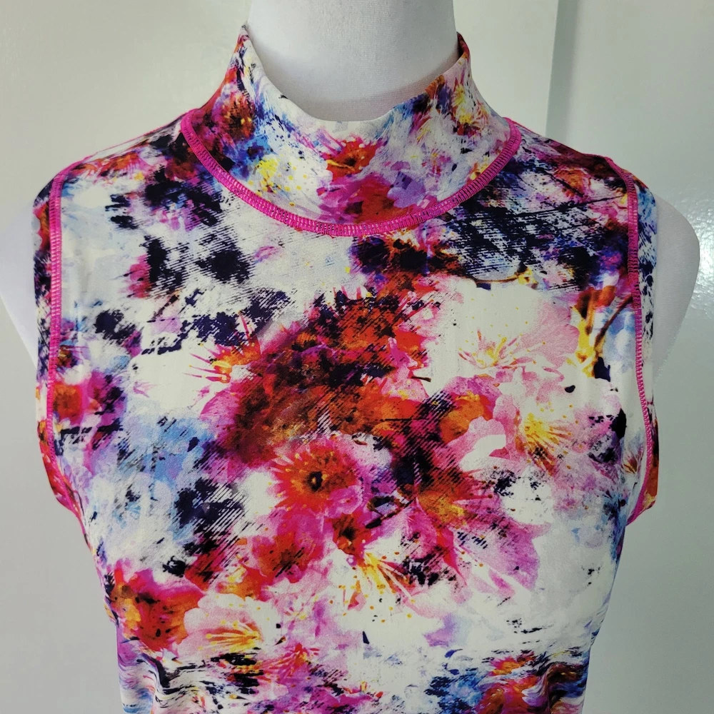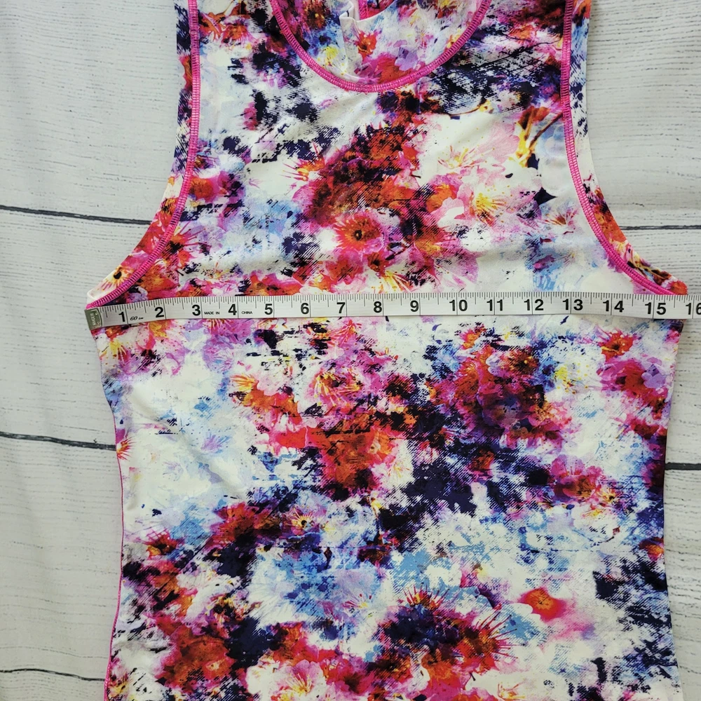 Athleta Size S Hypersonic Rashguard Tank Mock Neck Zipper Back Athletic Top This Athleta Hypersonic tank top is perfect for any active woman. With a mock neck and a zipper back closure, it is both stylish and functional. It is stretchy, breathable, and easy to care for. The watercolor pattern and multicolor design make it perfect for any beach or sports activity. It features compression and a slimming effect. This tank top is suitable for activities such as gym and training, walking, cycling, water sports, hiking, running, and jogging -Materials: nylon, spandex, and lycra -Excellent, pre-owned condition. No visible stains, flaws or tears. No to minimal signs of previous wear. Measurements included in photos - please inquire if more are needed. All offers considered - make one today!