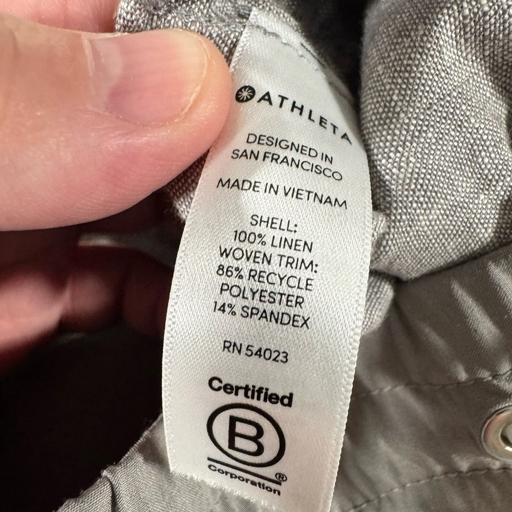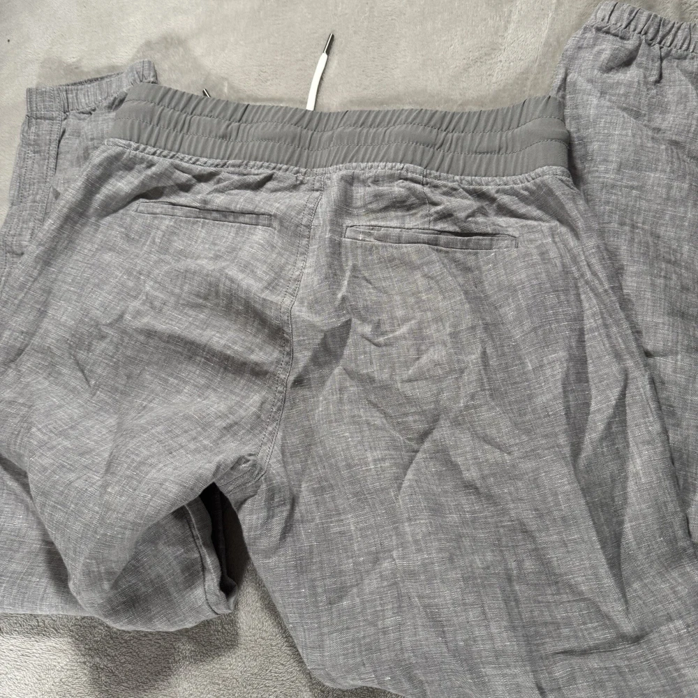 Elevate your casual style with these Athleta jogger pants, perfect for travel and everyday wear. The pants feature an elastic waist with drawstring closure and high-rise design, providing a comfortable fit. The chambray fabric type and solid gray color make them versatile and easy to pair with any top. These pants also come with pockets, making them practical for everyday use. They are breathable, easy to care for, and machine washable. With a tapered leg style and flat front, they give a modern and sleek look. The pants are perfect for beach, Hawaiian, and tropical themes.