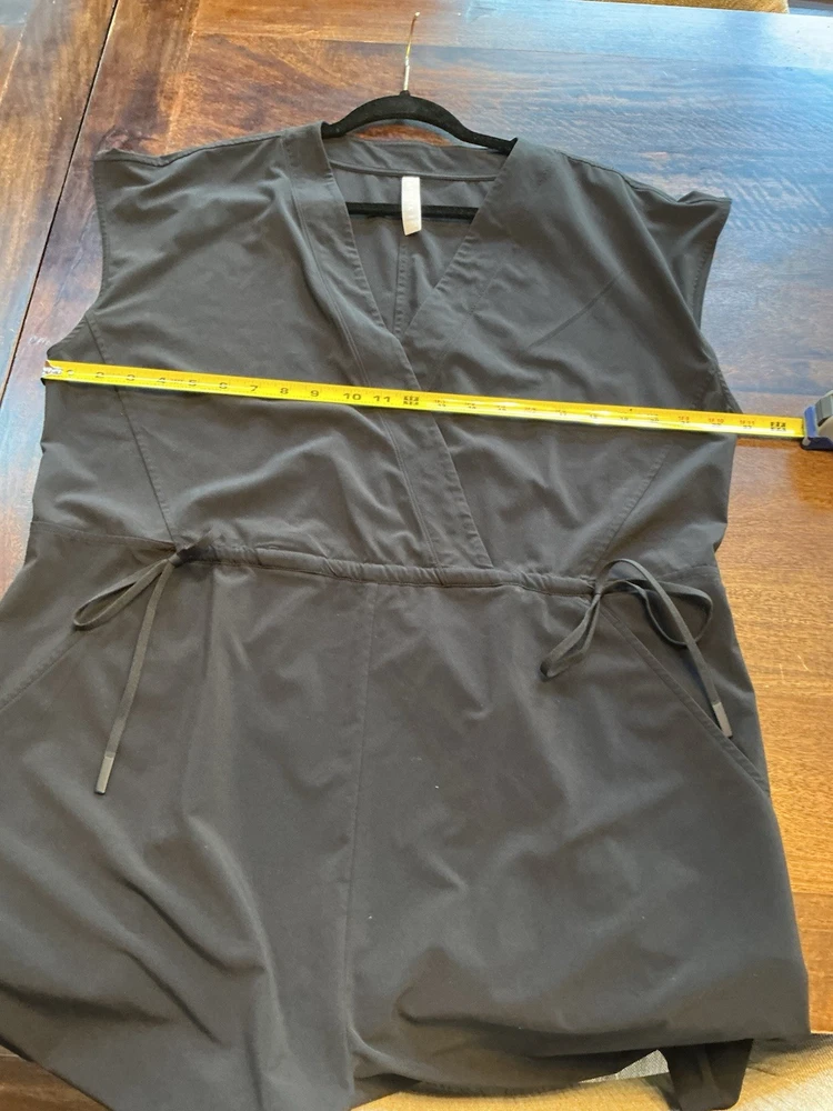 The Athleta Women's Romper Jumpsuit in size XL is a stylish and versatile piece perfect for travel or casual occasions. This black jumpsuit features a V-neck and a hidden vanity button, adding a touch of sophistication to its design. The sleeveless design and solid pattern make it a flattering and comfortable choice for the warmer seasons of summer, fall, and spring. Made by the brand Athleta, this one-piece outfit is machine washable for easy care and maintenance. Adjustable cinched waist to the size that you want two front slant pockets.