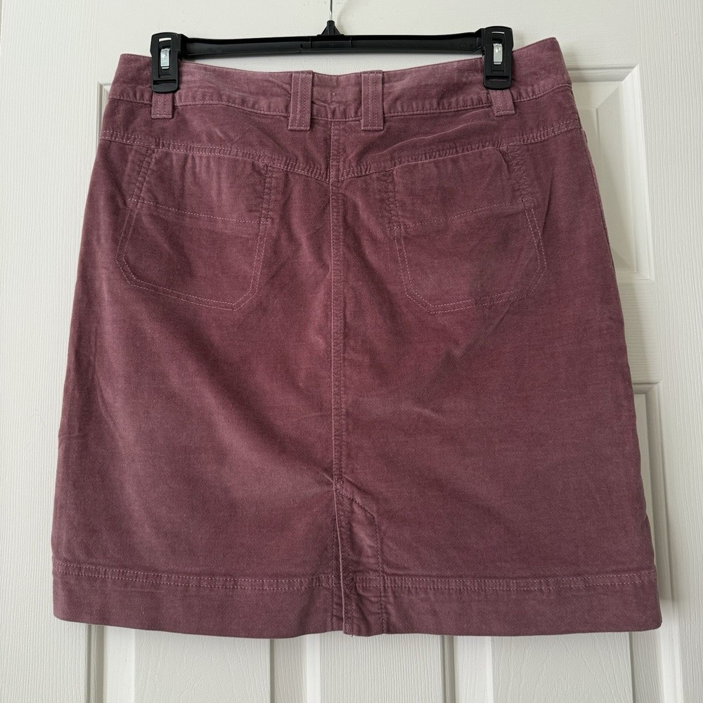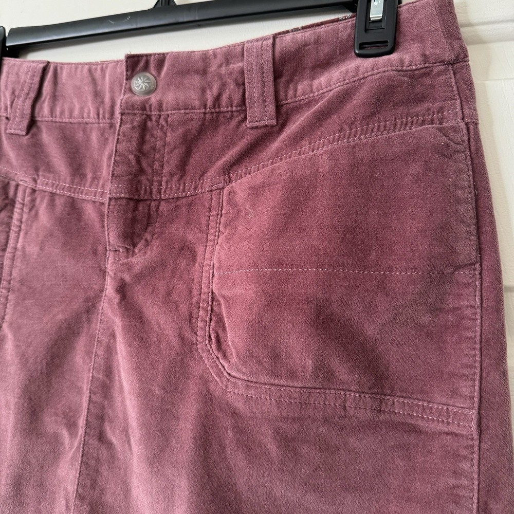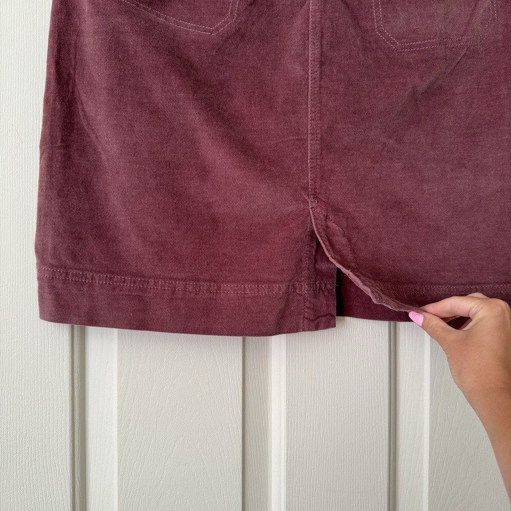Athleta Women's Brushed Washed Velvet A Line Casual Pencil Dema Skirt Size 12 Plum/ Dark purple Front & back pockets Washed velvet gives this jean style skirt a softer edge than classic denim Soft, slightly weathered look, stretch for comfort Kick pleat / back slit for movement Zip front with snap button closure Inner drawstring to adjust waist Washed velvet made from 98% cotton, 2% spandex Smoke free