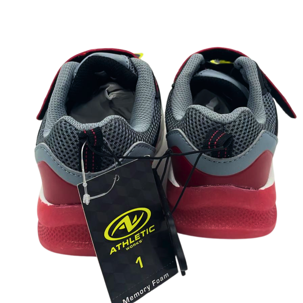 The Athletic Works Boys Light Up Red Black Athletic Shoes are new with tags and feature a hook & loop closure for easy adjustment. These sneakers are designed for boys with a standard shoe width and a colorful theme, perfect for the summer, fall, and spring seasons. Made with breathable mesh upper material, these athletic shoes provide comfort and support for active boys on the go. The red and black color scheme adds a stylish touch to any outfit, making them a great choice for young athletes.