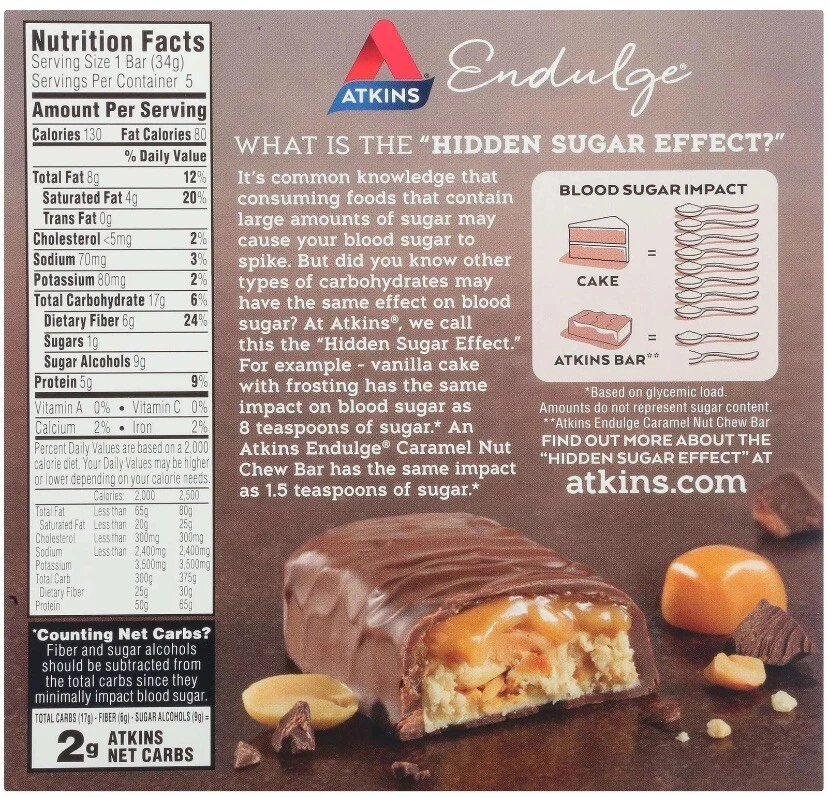 Gender:Unisexgtin13:629721697339Manufacturer Part Number:00637480079020Manufacturer:Atkins Nutritionals, Inc.Features:5 Bars, 1.2 oz (34 g) EachFlavor:CaramelAssembled Product Dimensions (L x W x H):10.88 x 4.63 x 4.75 InchesUPC:629721697339Age Group:AdultBrand:AtkinsNumber of Servings:6Food Form:BarsProduct:Caramel Nut Chew BarFood Aisle:Pantry