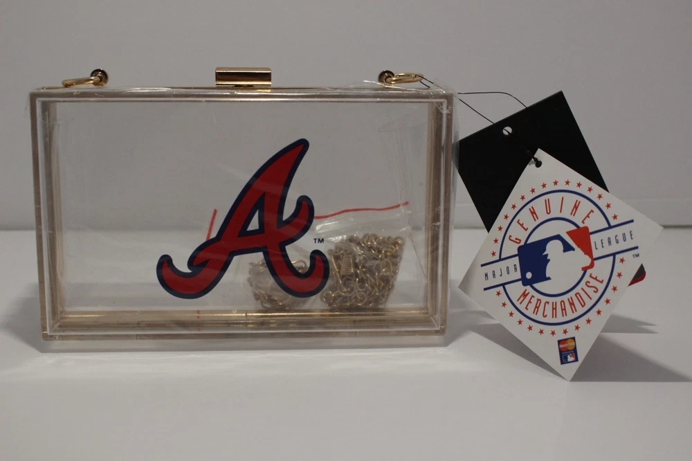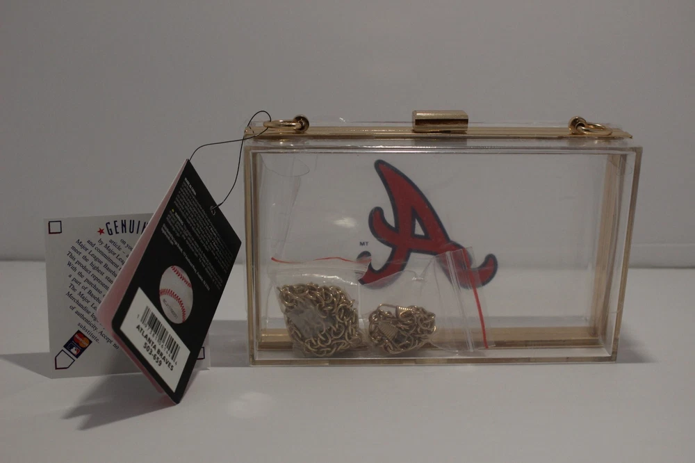 Screen print graphics - Turn lock clasp - Meets most stadium restrictions - 100% plastic - Wipe clean with a damp cloth - Detachable gold shoulder strap chain