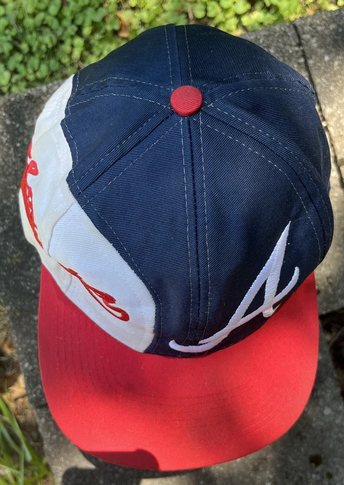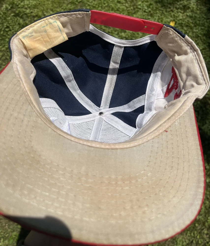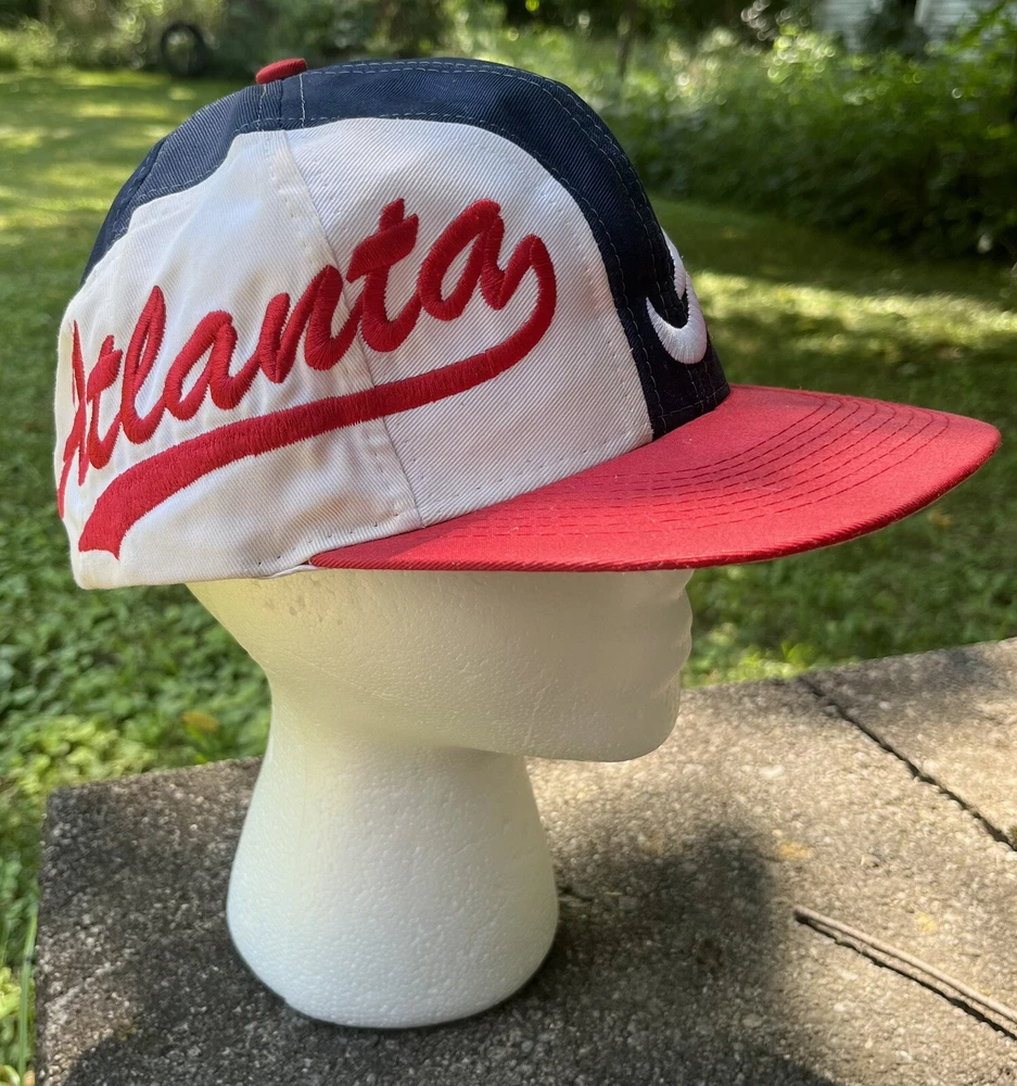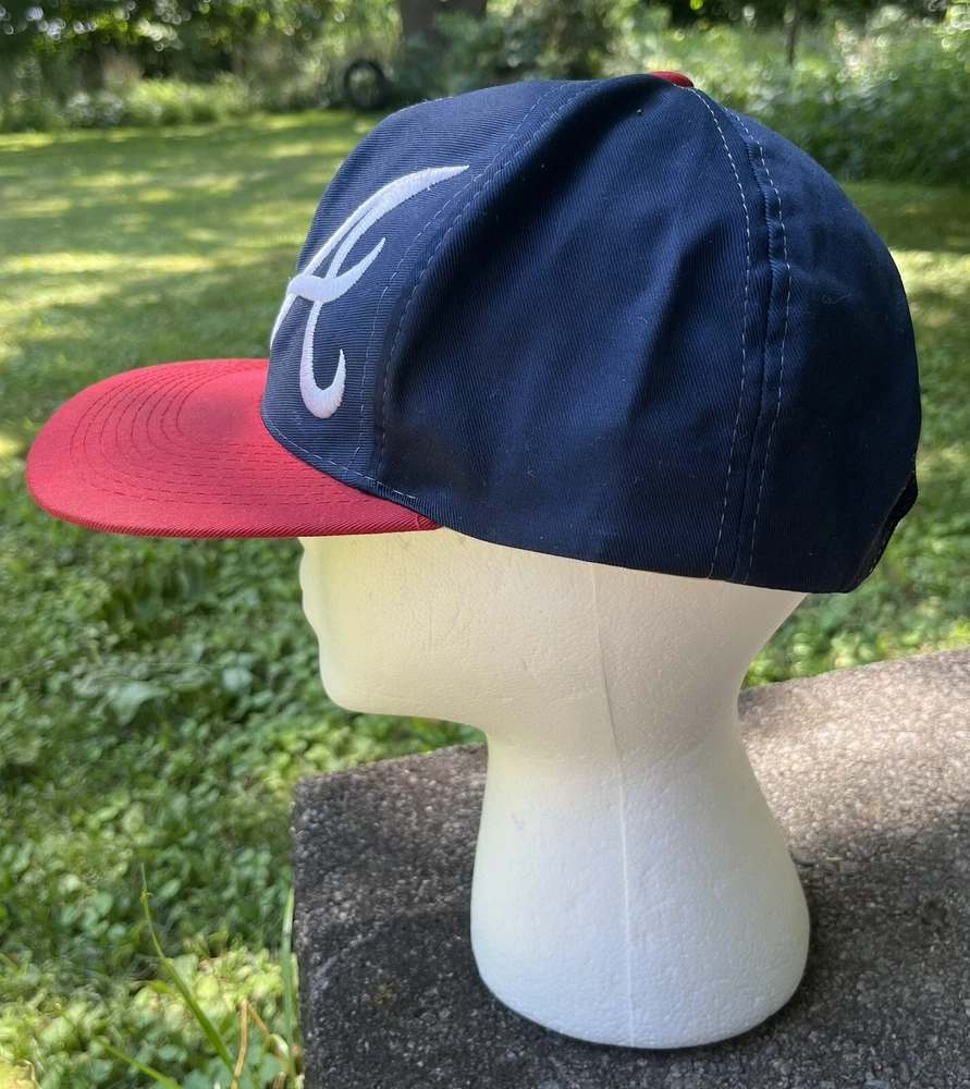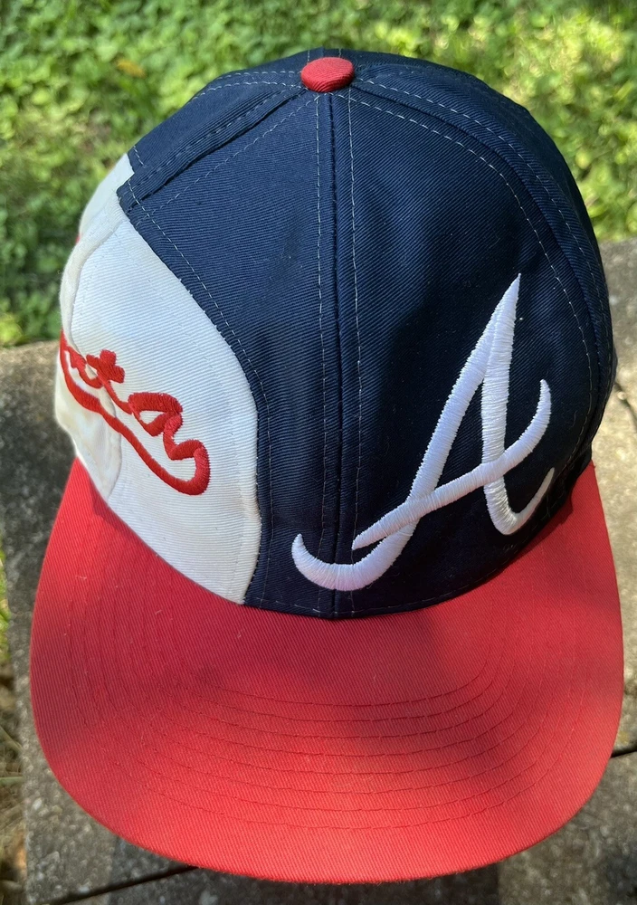 Atlanta Braves Hat Cap Snap Back Logo 7 White Blue Red Spellout Side Logo Could use a good cleaning. I don’t know how to properly clean and don’t want to ruin integrity of the hat. I will assume if you buy this hat, you know how to clean it.