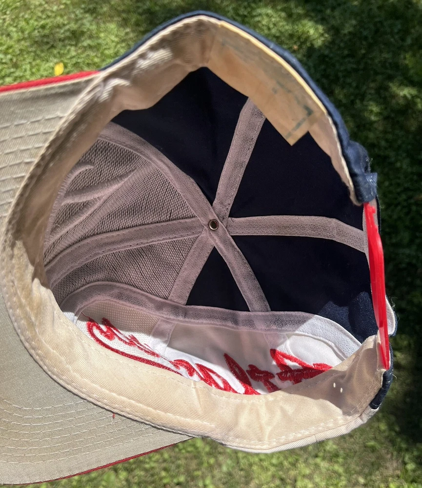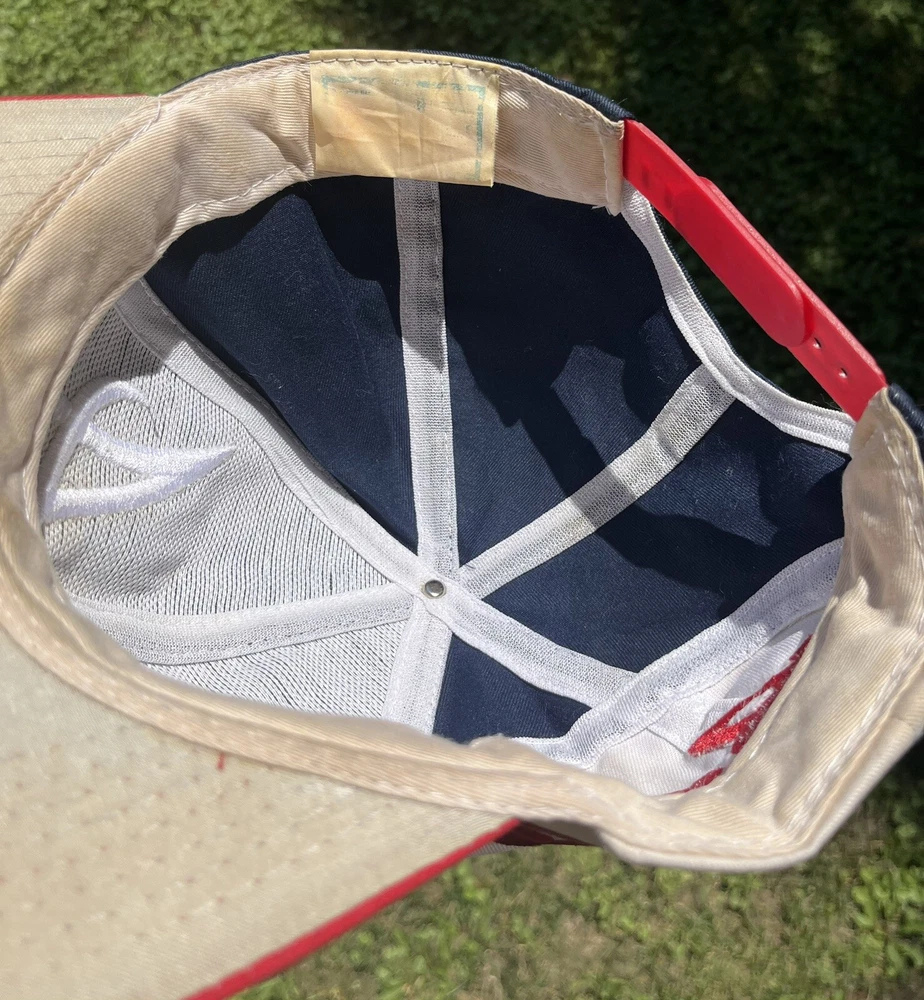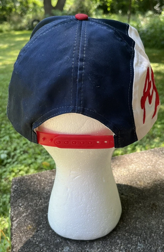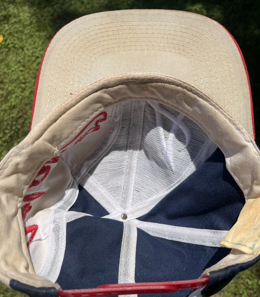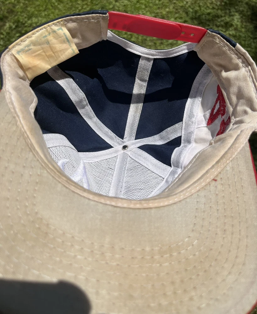Atlanta Braves Hat Cap Snap Back Logo 7 White Blue Red Spellout Side Logo Could use a good cleaning. I don’t know how to properly clean and don’t want to ruin integrity of the hat. I will assume if you buy this hat, you know how to clean it.