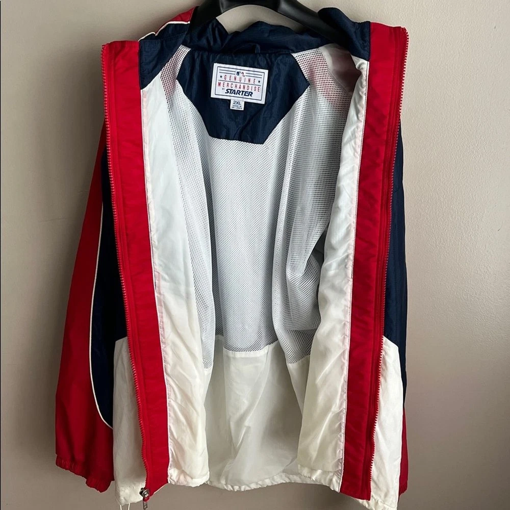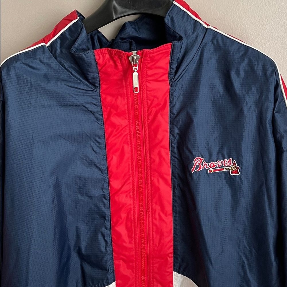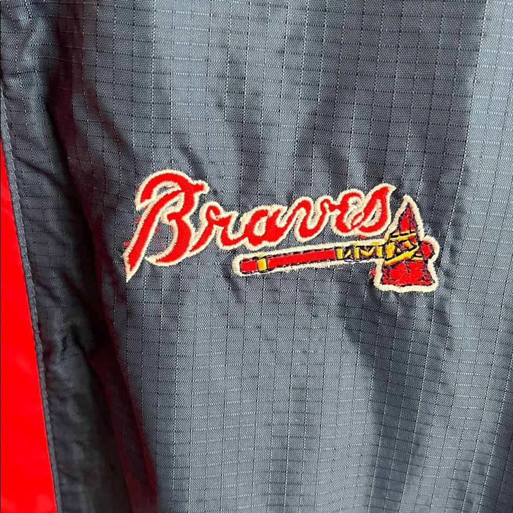Atlanta Braves VTG Starter windbreaker jacket, size 2XL. Full center zip, adjustable bungee waistband and exterior hip pockets. Back velcro-closure vent flap. Braves logo embroidered on chest and name embroidered on back. Laying flat, in approximate inches: 32.25 length 28.5 pit to pit 23.5 shoulder seam to shoulder seam 33 sleeve, measured from base of collar