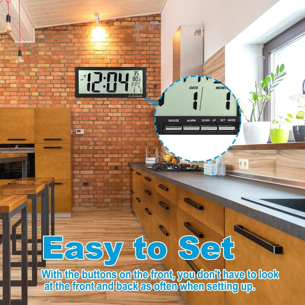 High Precision Atomic Clock – Atomic clock has a built-in receiver that automatically synchronizes itself with the WWVB 60kHz radio broadcast by the National Institute of Standards and Technology (NIST) in Fort Collins, Colorado. The Atomic Clock will always be accurate to within one second as it receives daily WWVB updates. Large Display / Easy to Read - Size:14.6" H x 6.3" L x 0.9" W,about 16" LCD, time numberal size: 4.1” X2". Easy viewing great for the elderly, people with poor eyesight. Easy to Use/Set – After installing the battery it will automatically receive the radio signal WWVB (60k Hz), after receiving the signal then press the [UP] button to select 4 time zones and you are done. Note: In the process of receiving the radio, except for the [DOWN] key (forced to exit the reception) other buttons do not work temporarily, the reception process for a maximum of 7 minutes.(Powered by 3 x AAA batteries,Not included) Multifunctional – 4 time zone to choose (PST, MST, CST, EST); auto daylight saving time (DST); temperature display,12/24 Hour time formats,clear second minute hour and week display,calendar display,dual alarm,snooze,wall mount / tabletop,folderable,etc. Great Gift Idea - It's suitable for living room,bedroom,kitchen,school,classroom,office,gym,library,hospital decor.You can gift it on various occasions such as Thanksgiving Day, Christmas, Halloween, birthdays,House warming etc.Also great gifts for mom,dad,family,elderly,friends. Product Description