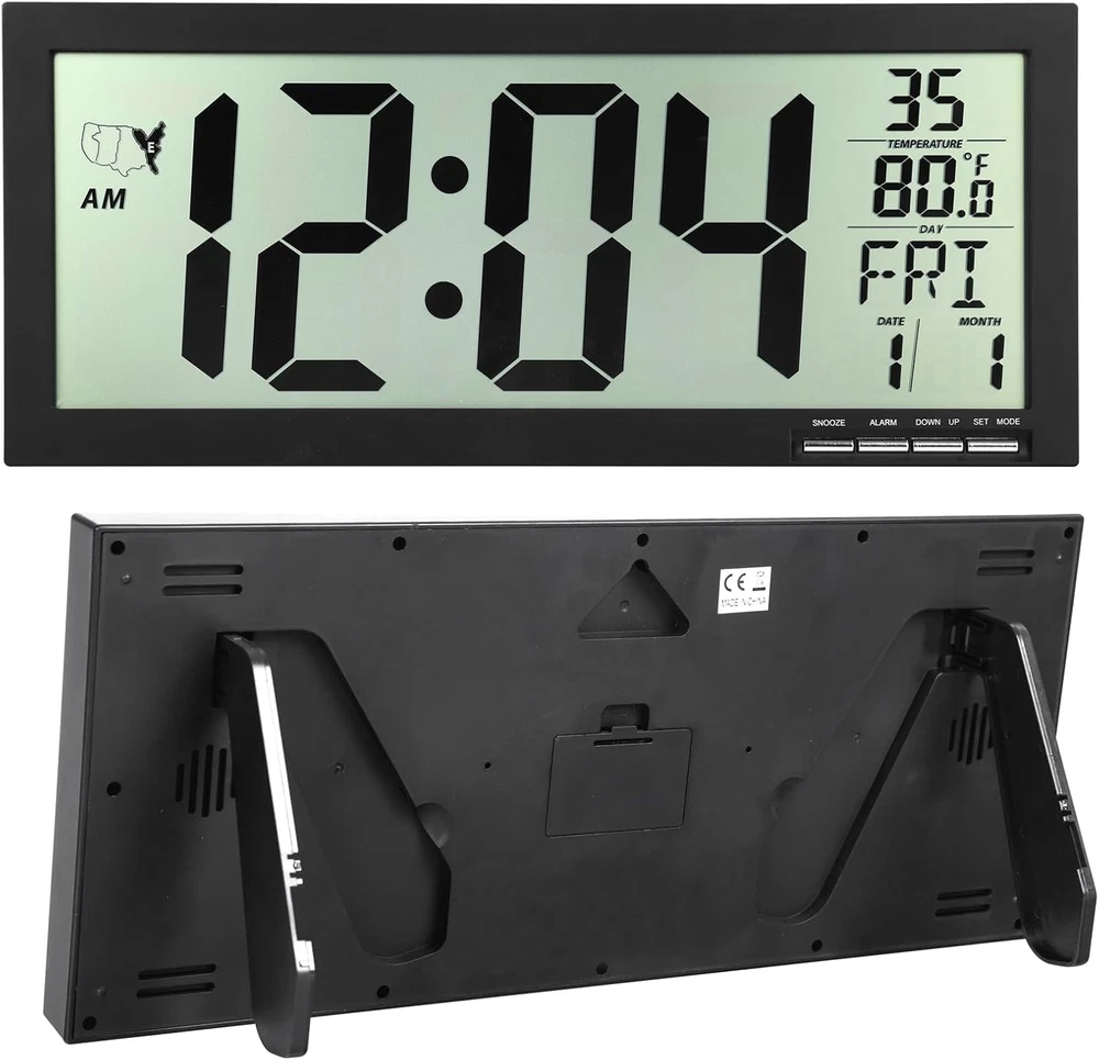Color: Black Clock Form: Multi Display Shape: Rectangular Room Type: Kitchen, Bedroom, Living Room, Classroom, Home Office Mounting Type: Wall Mount & Tabletop Alarm Clock: No Watch Movement: Automatic Special Feature: Large Display, Temperature Display, Alarm, Daylight Saving, Radio Item model number: Digital16Black Frame Material: Acrylonitrile Butadiene Styrene Are Batteries Included: No Theme: Atomic Clock, Radio Controlled UPC: 705353120206 Display Type: Digital Number of Items: 1 Indoor/Outdoor Usage: Indoor Age Range (Description): Adult Power Source: Battery Powered gtin13: 705353120206 Operation Mode: Electrical Item Weight: 1.3 pounds Brand: Does not apply Style: Modern Materials Sourced From: China Product Dimensions: 14.5"W x 6.3"H Type: Does not apply Material: Acrylonitrile Butadiene Styrene (ABS)
