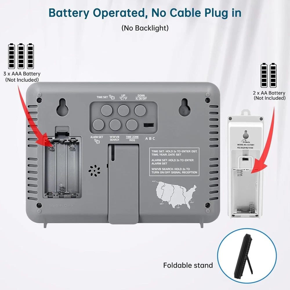 About this item ๐๐ฐ๐ฐ๐๐ฟ๐ฎ๐๐ฒ ๐๐๐ผ๐บ๐ถ๐ฐ ๐๐น๐ผ๐ฐ๐ธ - The atomic clock has a built-in receiver that automatically synchronizes itself with the WWVB radio broadcast, which will update time automatically every midnight to ensure accurate time. It has 4 time zones: EST, CST, MST, PST. ๐๐๐ผ๐บ๐ถ๐ฐ ๐๐น๐ผ๐ฐ๐ธ ๐๐ถ๐๐ต ๐๐ป๐ฑ๐ผ๐ผ๐ฟ ๐ฎ๐ป๐ฑ ๐ข๐๐๐ฑ๐ผ๐ผ๐ฟ ๐ง๐ฒ๐บ๐ฝ๐ฒ๐ฟ๐ฎ๐๐๐ฟ๐ฒ - This atomic clock can display both indoor and outdoor temperature, helps you better manage your daily life. The wireless outdoor sensor monitors and transmits the outdoor temperature to the clock to display. The sensor should be placed within 330 feet and out of direct sunlight or rain. ๐๐ถ๐ด๐ถ๐๐ฎ๐น ๐๐น๐ฎ๐ฟ๐บ ๐๐น๐ผ๐ฐ๐ธ ๐๐ฎ๐๐๐ฒ๐ฟ๐ ๐ข๐ฝ๐ฒ๐ฟ๐ฎ๐๐ฒ๐ฑ - The clock is supported by 3 x AAA battery and outdoor sensor is supported by 2 x AA battery. (Batteries are not included). When batteries of clock or sensor are running low, there would be a low battery symbol appearing on screen and blinking, reminding you to replace new batteries in time. ๐๐ฎ๐ฟ๐ด๐ฒ ๐๐ถ๐๐ฝ๐น๐ฎ๐ ๐๐ถ๐๐ต ๐ง๐ฒ๐บ๐ฝ๐ฒ๐ฟ๐ฎ๐๐๐ฟ๐ฒ, ๐๐ฎ๐ ๐ฎ๐ป๐ฑ ๐๐ฎ๐๐ฒ - Two temperature modes switchable (Celsius and Fahrenheit). When click button, both indoor and outdoor temperature exchange mode at the same time. There are also two display modes of time selectable: Standard Time and Military Time. ๐๐จ๐ง๐ข ๐๐ฆ๐ง ๐ฎ๐ป๐ฑ ๐๐น๐ฎ๐ฟ๐บ โ With DST on, clock will go forward or fall back one hour automatically in daylight saving time. When DST or alarm is on, there would be a corresponding icon staying on screen. Both of them could be turned off manually if for no need. Atomic Clock Indoor Outdoor Temperature Self-Setting Digital 4 Time Zones DST Product Description Get Started Quickly 1. Adjust the outdoor temperature link channel of clock and outdoor sensor to be same๏ผlike A-A, B-B, C-C. 2. Install batteries (3xAAA for clock and 2xAA for outdoor sensor) and choose your time zone. 3. Outdoor temperature starts to connect first, once finished, clock starts to search for WWVB signal. 4. Put clock to a place with good signal for better reception and outdoor sensor to a safe place outside within 330feet/100m. 5. Clock updates time automatically when signal received successfully. Tips: In most areas, a signal can only be received at night. If your clock does not receive WWVB signal in daytime, please wait overnight and it will be set in the morning. Outdoor temperature range: -40โ ~ 158โ (-40ยฐC to 70ยฐC). Indoor temperature range: 32โ ~ 122โ (0ยฐC to 50ยฐC). When clicking to change the temp display unit, indoor and outdoor will change simultaneously. The outdoor sensor should be placed within 300ft/100m and out of direct sun light or rain. This atomic is a wall clock and table clock. There are hangging holes on the clock back, you can hang it on wall easily. There is also a folding stan on the back, so it can also be used as a desk clock. Previous page Return Policy: We offer a 30 day return policy from the receiving date. Please contact us for a Return Label. Please use our return label provided by us because it will go back to our supplier. Feedback: Your satisfaction is very important to us! If you have any problem with your order, please contact us and we will do our very best to make you satisfied. As long as you are happy with your purchase, please leave a positive feedback for us. We will always leave you a positive feedback in return. If you have any problem with your purchase, please do not leave a negative feedback. Please Contact us ... and your issue will be solved quickly and positively We are a small family-owned business trying to make it, not a huge company that doesn't care ... We will ALWAYS do our best for you