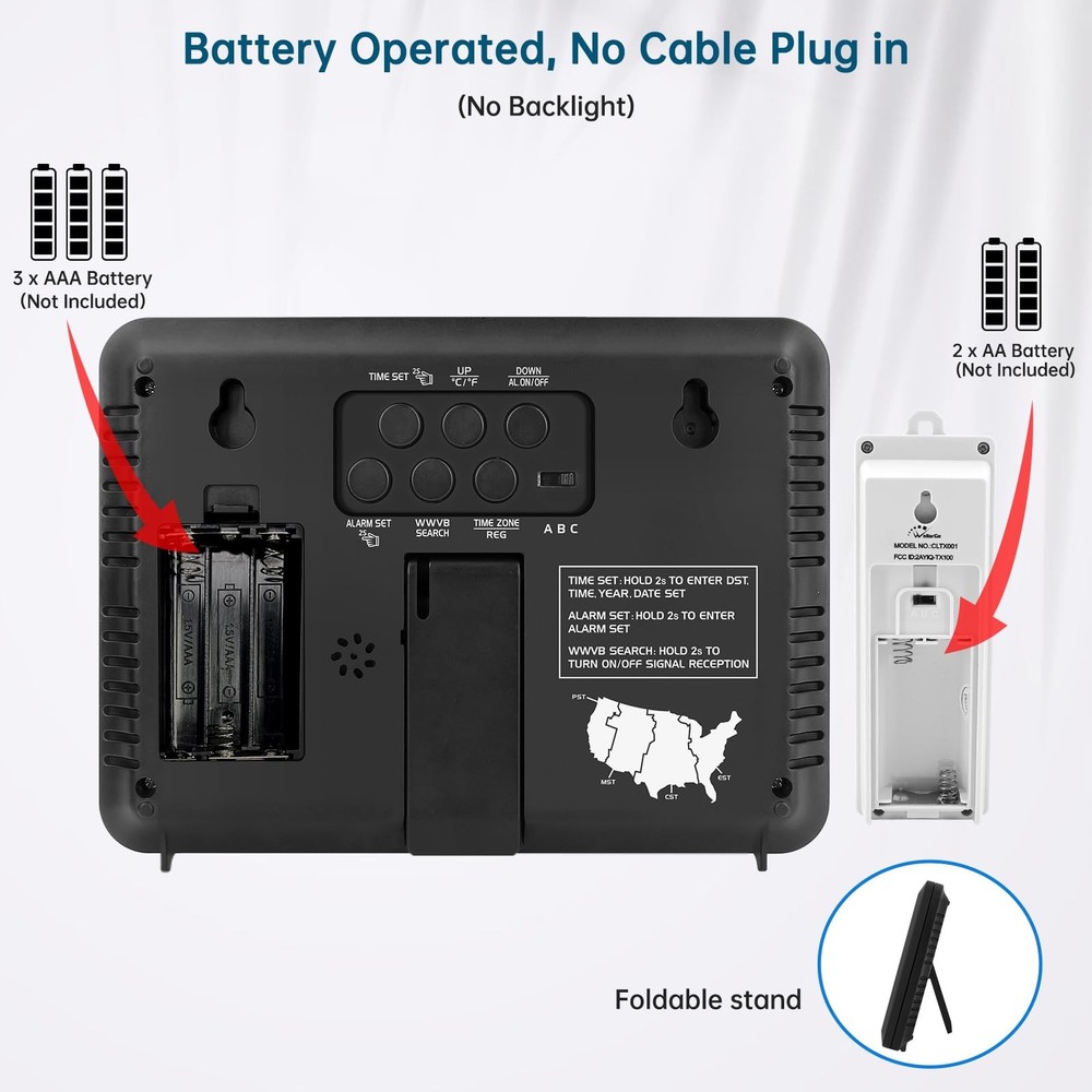 ๐๐ฐ๐ฐ๐๐ฟ๐ฎ๐๐ฒ ๐๐๐ผ๐บ๐ถ๐ฐ ๐๐น๐ผ๐ฐ๐ธ - The atomic clock has a built-in receiver that automatically synchronizes itself with the WWVB radio broadcast, which will update time automatically every midnight to ensure accurate time. It has 4 time zones: EST, CST, MST, PST. ๐๐๐ผ๐บ๐ถ๐ฐ ๐๐น๐ผ๐ฐ๐ธ ๐๐ถ๐๐ต ๐๐ป๐ฑ๐ผ๐ผ๐ฟ ๐ฎ๐ป๐ฑ ๐ข๐๐๐ฑ๐ผ๐ผ๐ฟ ๐ง๐ฒ๐บ๐ฝ๐ฒ๐ฟ๐ฎ๐๐๐ฟ๐ฒ - This atomic clock can display both indoor and outdoor temperature, helps you better manage your daily life. The wireless outdoor monitors and transmits the outdoor temperature to the clock to display. The should be placed within 330 feet and out of direct sunlight or rain. ๐๐ถ๐ด๐ถ๐๐ฎ๐น ๐๐น๐ฎ๐ฟ๐บ ๐๐น๐ผ๐ฐ๐ธ ๐๐ฎ๐๐๐ฒ๐ฟ๐ ๐ข๐ฝ๐ฒ๐ฟ๐ฎ๐๐ฒ๐ฑ - The clock is supported by 3 x AAA battery and outdoor is supported by 2 x AA battery. (Batteries are not ). When batteries of clock or are running low, there would be a low battery symbol appearing on screen and blinking, reminding you to replace new batteries in time. ๐๐ฎ๐ฟ๐ด๐ฒ ๐๐ถ๐๐ฝ๐น๐ฎ๐ ๐๐ถ๐๐ต ๐ง๐ฒ๐บ๐ฝ๐ฒ๐ฟ๐ฎ๐๐๐ฟ๐ฒ, ๐๐ฎ๐ ๐ฎ๐ป๐ฑ ๐๐ฎ๐๐ฒ - temperature modes switchable (Celsius and Fahrenheit). When click button, both indoor and outdoor temperature exchange mode at the same time. There are also display modes of time selectable: Standard Time and Military Time. ๐๐จ๐ง๐ข ๐๐ฆ๐ง ๐ฎ๐ป๐ฑ ๐๐น๐ฎ๐ฟ๐บ โ With DST on, clock will go forward or fall back hour automatically in daylight saving time. When DST or alarm is on, there would be a corresponding icon staying on screen. Both of them could be turned off manually if for no need.
