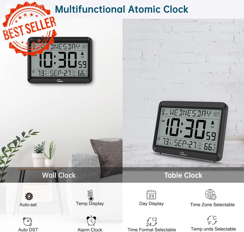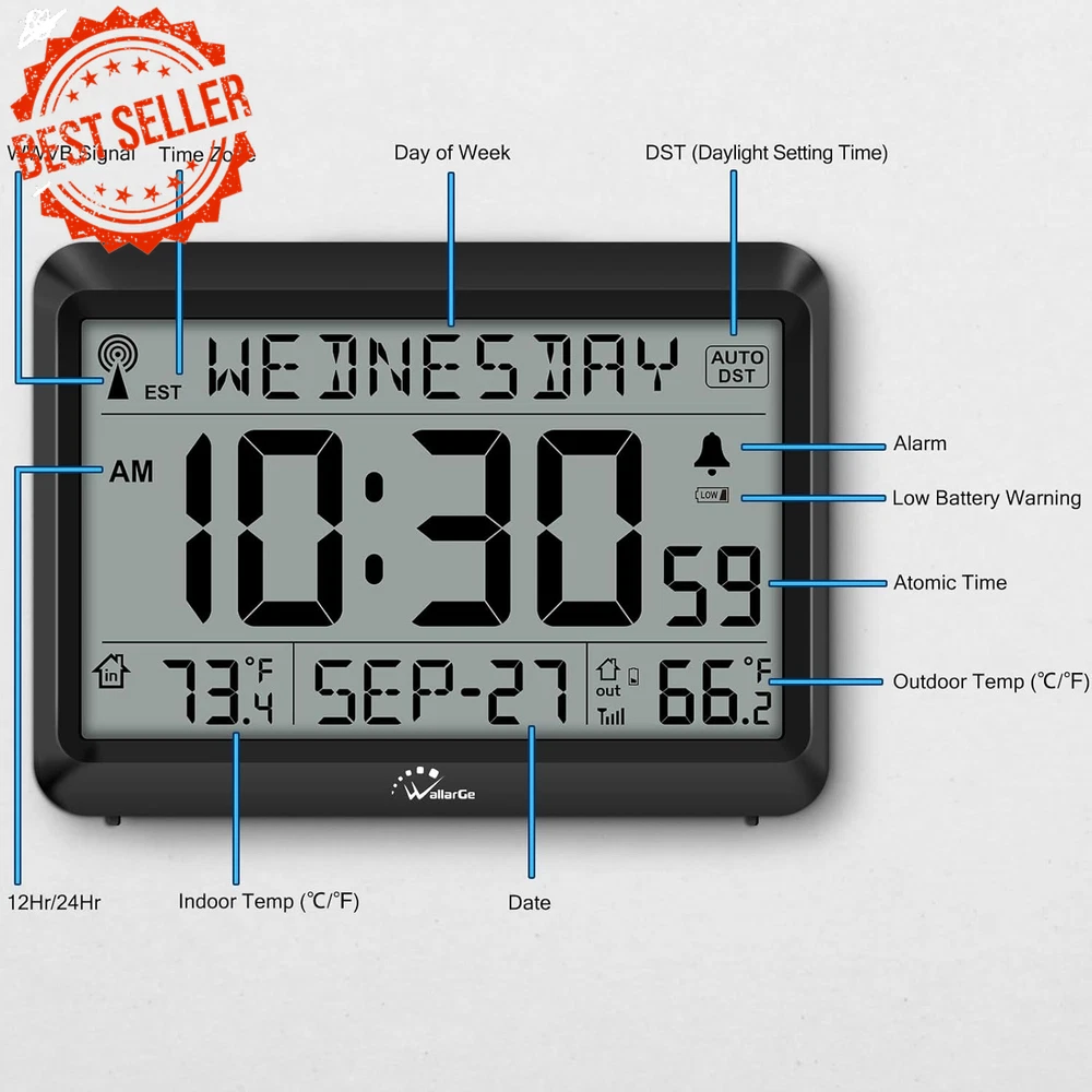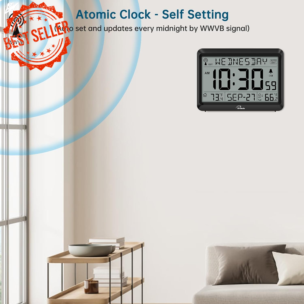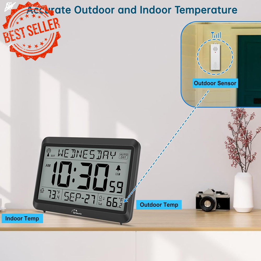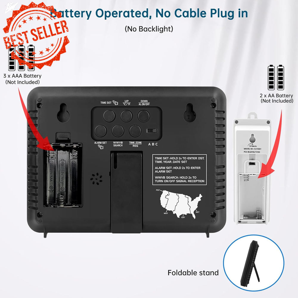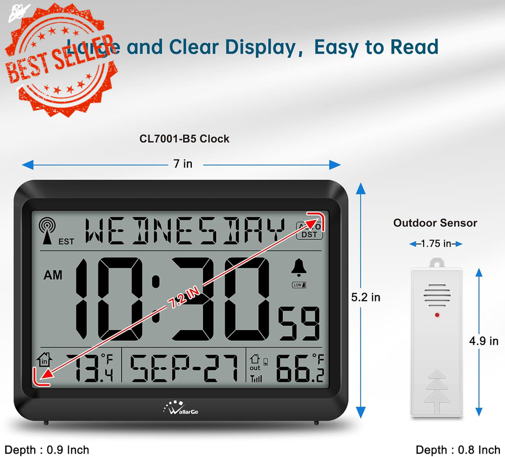 Fast Shipping On All Items 30 Days Money Guarantee Customer Support Excellent Service 100% Satisfaction Satisfaction Guaranteed Atomic Clock with Indoor/Outdoor Temp, Self-Setting, 4 Time Zones, DST Specification Item model number CL7001-B5 Style Modern Are Batteries Included No Power Source Battery Powered Color Black Product Dimensions 7"W x 5.2"H Country of Origin China Watch Movement Automatic Item Weight 12.7 ounces Operation Mode Atomic Theme Plain Frame Material Acrylonitrile Butadiene Styrene Age Range (Description) Adult Alarm Clock Yes Mounting Type Wall Mount Special Feature Temperature Display, Alarm Display Type Digital Shape Rectangular Size 8.5INCH 5.2 "h x 7.0 "h. Weight: 12.7 oz Item Description Atomic Clock with Indoor/Outdoor Temperature and Digital Alarm β Battery Operated Keep your home on time with the Atomic Clock featuring automatic synchronization and a variety of helpful functions. With its ability to update itself via WWVB radio signals, this clock ensures accurate timekeeping every day. Its built-in features, like temperature display and easy-to-use settings, make it perfect for both home and office use. Key Features: π°οΈ Accurate Atomic Timekeeping Automatically synchronizes with the WWVB radio broadcast every midnight, ensuring precise time across four U.S. time zones (EST, CST, MST, PST). The clock updates automatically, ensuring you stay on time without any manual adjustments. π‘οΈ Indoor and Outdoor Temperature Display Conveniently display both indoor and outdoor temperatures. The wireless outdoor sensor transmits data up to 330 feet , giving you up-to-date weather information at a glance. The temperature can be shown in either Celsius or Fahrenheit , and the sensor works in a wide range of temperatures (from -40β to 158β outdoors and 32β to 122β indoors). π Battery Operated The clock runs on 3 AAA batteries , while the outdoor sensor uses 2 AA batteries (batteries not included). When the battery is low, a battery indicator will blink, reminding you to replace them. π Time and Date with Optional Alarm The clock displays both the current time (12-hour or 24-hour format) and the date , and comes with an optional alarm . It also supports Auto DST , which adjusts for daylight saving time without manual intervention. When DST or alarm is active, corresponding icons will appear on the screen. π Wall or Desk Mountable Versatile design allows for easy mounting on a wall or use as a desk clock. It includes a foldable stand for easy placement on a flat surface and hanging holes for wall mounting. How to Set Up: Install Batteries : Place 3xAAA batteries into the clock and 2xAA batteries into the outdoor sensor. Set Time Zone : Select your time zone (EST, CST, MST, PST). Sync Outdoor Temperature : Set the clock to any channel (A, B, or C) and set the sensor to the same channel. This will allow the outdoor temperature to appear within 3 minutes. Place the Clock and Sensor : Place the clock in an area with good signal reception. Put the outdoor sensor within 330 feet of the clock and out of direct sunlight or rain for optimal performance. Additional Information: Display Modes : Choose between Standard Time and Military Time . Temperature Unit Switching : Easily toggle between Celsius and Fahrenheit for both indoor and outdoor readings. Waterproof Outdoor Sensor : While the sensor is waterproof, it is recommended to avoid placing it directly in rain or intense sunlight to prolong its life. Package Includes: 1 x Atomic Clock 1 x Outdoor Sensor 2 x AA Batteries for the Sensor (not included) 3 x AAA Batteries for the Clock (not included) Stay perfectly synced and informed with this Atomic Clock with Temperature Display , designed for ease of use and reliable performance. Ideal for home, office, or any space where accurate time and temperature readings are essential! About us We offer the best prices around on high quality products. Our E-store includes media such as books, movies, music and games while offering electronics, toys, sporting apparel, clothing, tools, general home, garden items and more. Shipping We are always working hard to ensure your package arrives as soon as possible. Please understand that some factors like weather, high postal traffic, and the performance of shipping companies are outside of our control. We offer free shipping to the lower 48 states and ship within 2-3 business days of payment, usually sooner. We do not accept P.O. Boxes. Please provide a physical address. For shipping outside of the continental USA, we only use eBay's Global Shipping Program.The item is shipped to KY and then sent to the rest of the world. International customers are responsible for all duties and taxes. Continue to check out to calculate costs for shipping the item to your country. Messages regarding eBay's Global Shipping Program MUST be directed at eBay EXCLUSIVELY. Returns We offer a 30-Day Return Policy on items in which you are not completely satisfied with. You have the option of a full-refund or an exchange of the item. No returns are available on items shipped outside of the USA Satisfaction We try over very best to make sure every customer is completely satisfied. If there's a problem, message us! We're happy to help. Payment Options Shop With Confidence