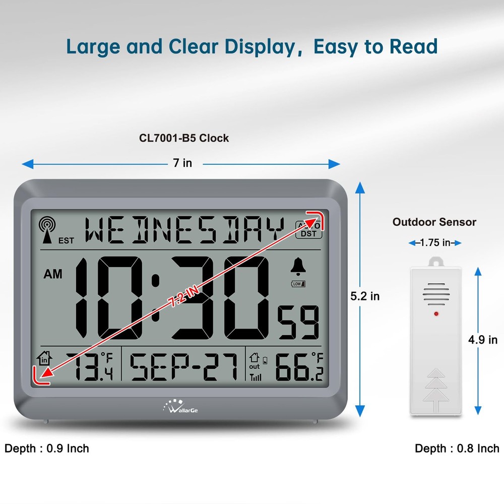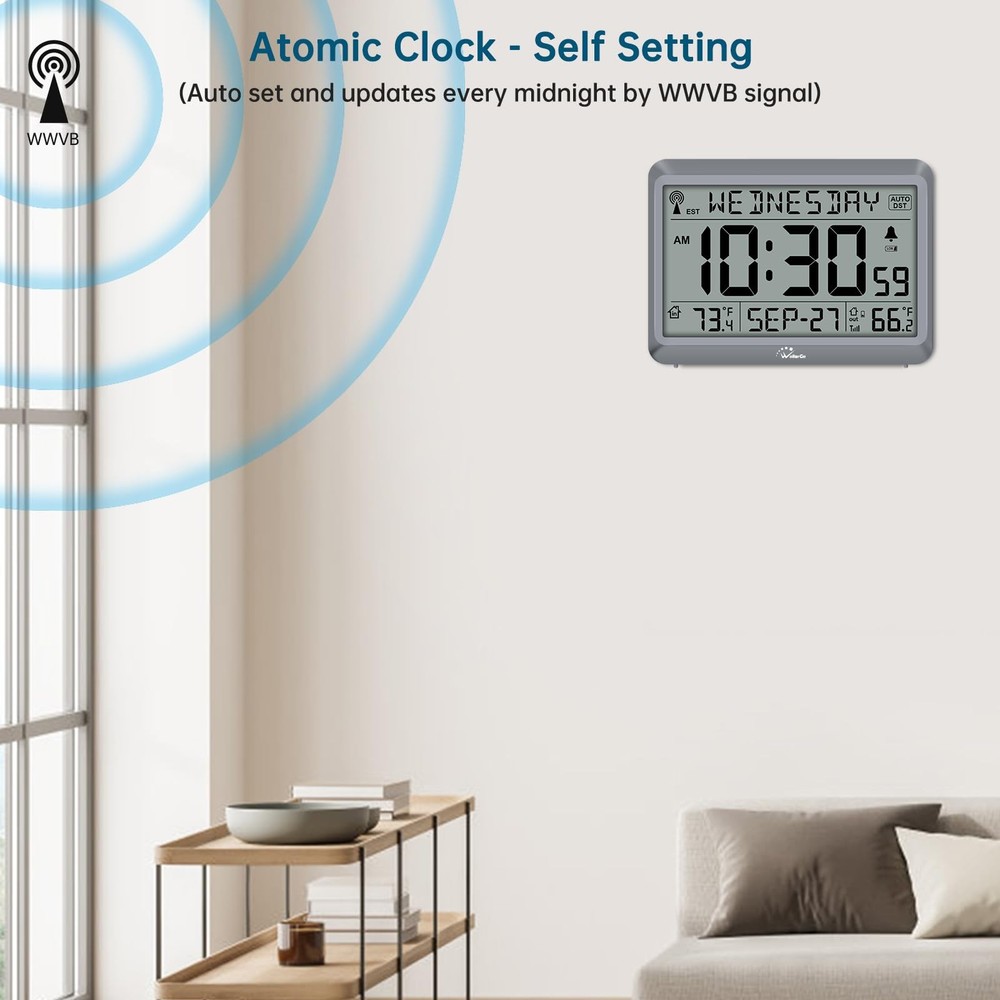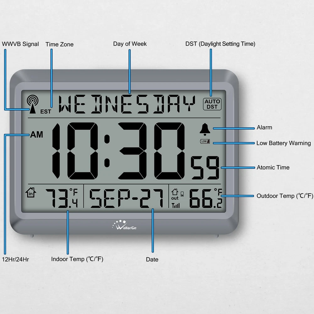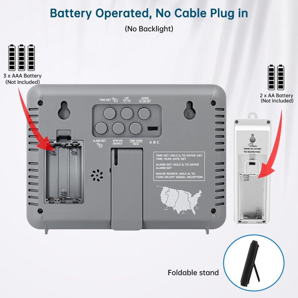 atomic clock with indoor outdoor temperature ๐๐ฐ๐ฐ๐๐ฟ๐ฎ๐๐ฒ ๐๐๐ผ๐บ๐ถ๐ฐ ๐๐น๐ผ๐ฐ๐ธ - The atomic clock has a built-in receiver that automatically synchronizes itself with the WWVB radio broadcast, which will update time automatically every midnight to ensure accurate time. It has 4 time zones: EST, CST, MST, PST. ๐๐๐ผ๐บ๐ถ๐ฐ ๐๐น๐ผ๐ฐ๐ธ ๐๐ถ๐๐ต ๐๐ป๐ฑ๐ผ๐ผ๐ฟ ๐ฎ๐ป๐ฑ ๐ข๐๐๐ฑ๐ผ๐ผ๐ฟ ๐ง๐ฒ๐บ๐ฝ๐ฒ๐ฟ๐ฎ๐๐๐ฟ๐ฒ - This atomic clock can display both indoor and outdoor temperature, helps you better manage your daily life. The wireless outdoor monitors and transmits the outdoor temperature to the clock to display. The should be placed within 330 feet and out of direct sunlight or rain. ๐๐ถ๐ด๐ถ๐๐ฎ๐น ๐๐น๐ฎ๐ฟ๐บ ๐๐น๐ผ๐ฐ๐ธ ๐๐ฎ๐๐๐ฒ๐ฟ๐ ๐ข๐ฝ๐ฒ๐ฟ๐ฎ๐๐ฒ๐ฑ - The clock is supported by 3 x AAA battery and outdoor is supported by 2 x AA battery. (Batteries are not ). When batteries of clock or are running low, there would be a low battery symbol appearing on screen and blinking, reminding you to replace new batteries in time. ๐๐ฎ๐ฟ๐ด๐ฒ ๐๐ถ๐๐ฝ๐น๐ฎ๐ ๐๐ถ๐๐ต ๐ง๐ฒ๐บ๐ฝ๐ฒ๐ฟ๐ฎ๐๐๐ฟ๐ฒ, ๐๐ฎ๐ ๐ฎ๐ป๐ฑ ๐๐ฎ๐๐ฒ - temperature modes switchable (Celsius and Fahrenheit). When click button, both indoor and outdoor temperature exchange mode at the same time. There are also display modes of time selectable: Standard Time and Military Time. ๐๐จ๐ง๐ข ๐๐ฆ๐ง ๐ฎ๐ป๐ฑ ๐๐น๐ฎ๐ฟ๐บ โ With DST on, clock will go forward or fall back hour automatically in daylight saving time. When DST or alarm is on, there would be a corresponding icon staying on screen. Both of them could be turned off manually if for no need.