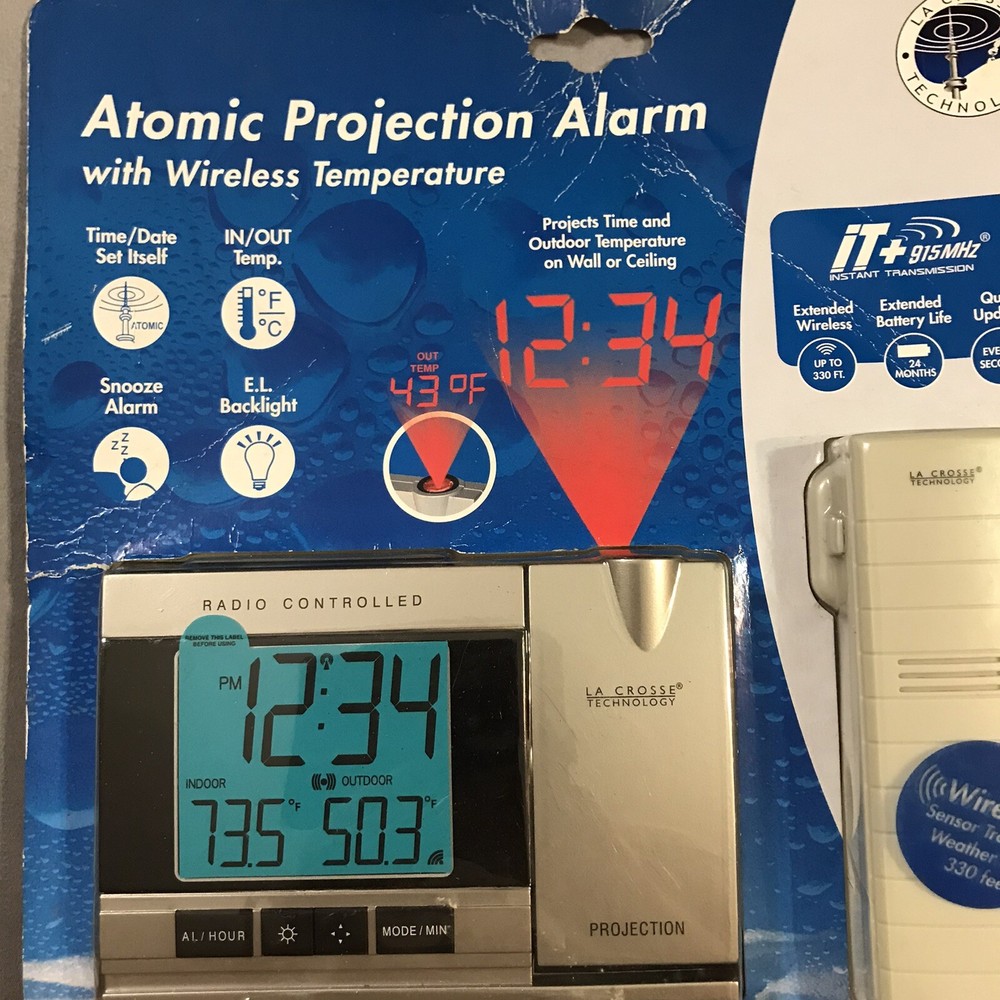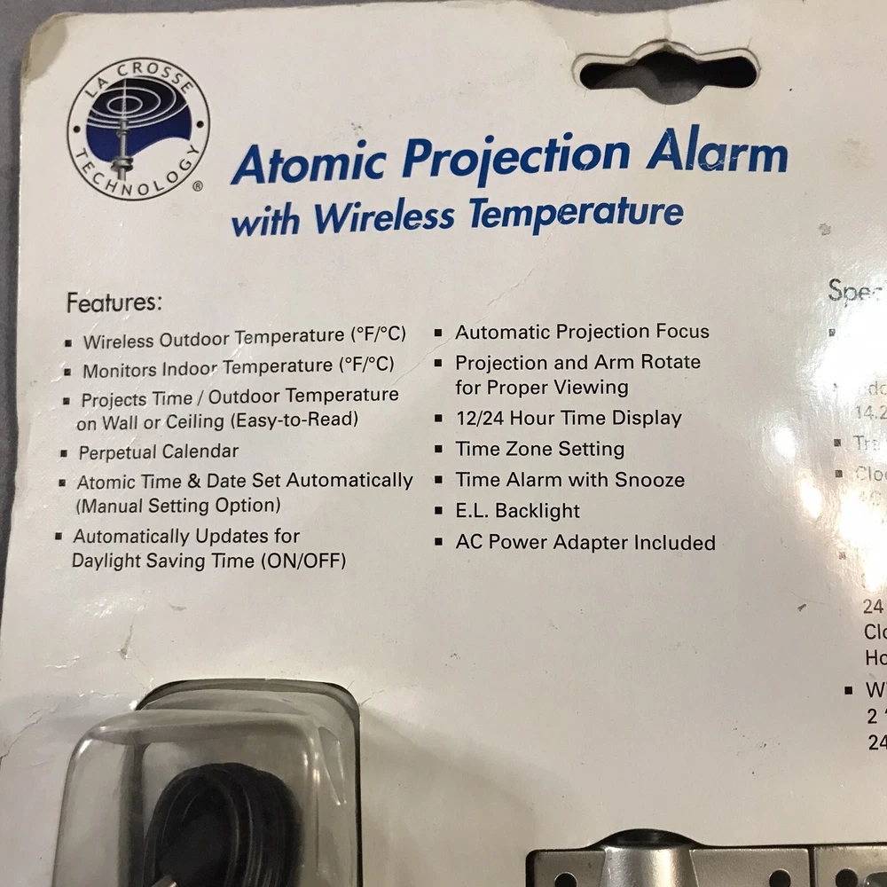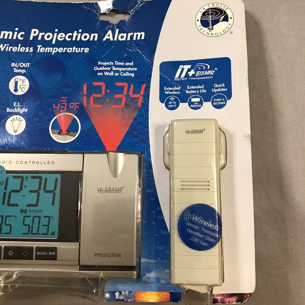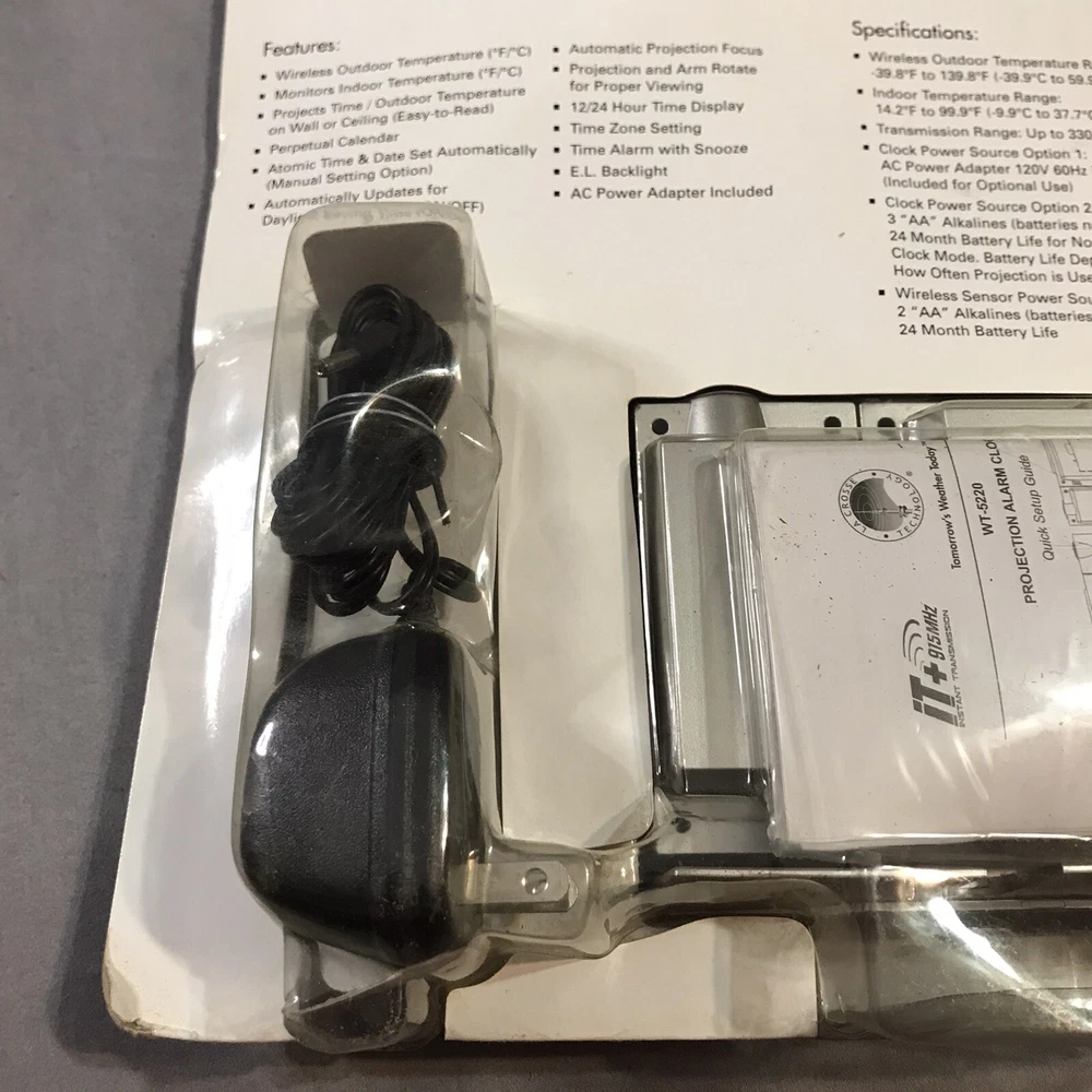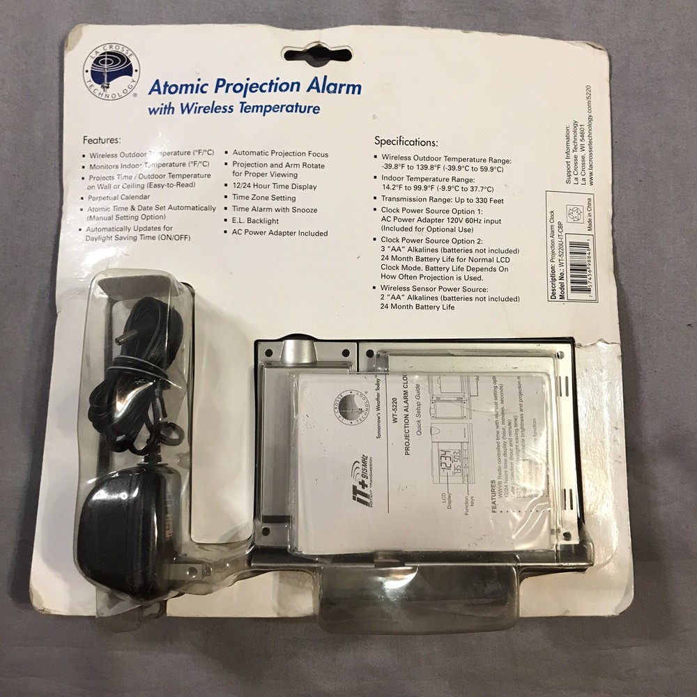 Atomic Projection Alarm Wireless Temperature Projection 5220 Box has caught some dust/dirt inside from sitting in garage. Item is still new in box. Please see pictures.