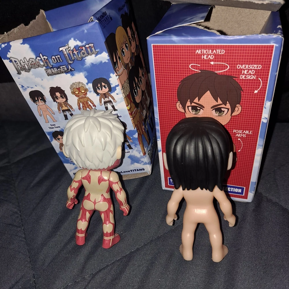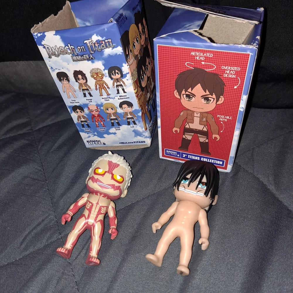 PLEASE CHECK OUT MY OTHER HUNDREDS OF FUNKO POP LISTINGS!:) >Review pictures, and if you have any questions, just shoot me a message. I can combine shipping if you purchase multiple items. FASTEST SHIPPING SERVICE!!!! WILL SHIP WITH COMPLETE PROFESSIONAL CARE !!!!! :) This set of vinyl figures feature two popular characters from Attack on Titan - the Armored Titan and Eren Titan Form. Both figures are made by the well-known brand Kawaii Titan and are perfect for fans of the science fiction and horror genre. The Armored Titan stands at 5 inches tall and is highly detailed, while the Eren Titan Form figure stands at 4 inches tall and captures the character's angry expression perfectly. This set is a must-have for collectors of sci-fi and horror memorabilia, and is sure to be a great addition to any collection.