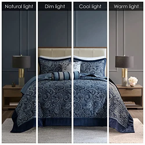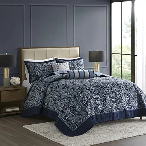 Return Policy Fast Delivery Trusted seller Aubrey Reversible Quilted Bedspread Set, Solid Reverse Summer Breathable, Lightweight All Season Bedding Layer, Matching Shams, Bedspread Queen(102"x118"), Navy 5 Piece Product Description 100% Microfiber The Aubrey 5 Piece Reversible Jacquard Bedspread Set provides a classic update for your bedroom. The quilted bedspread and shams offer beautiful details with a navy flange and soft silver piping. The reverse is a rich navy color, while two decorative pillows feature pleating and embroidery details. Set include: 1 Bedspread: 102"W x 118"L, 2 Standard Shams: 20"W x 26"L + 2"D , 1 Decorative Pillow: 18"W x 18"L, 1 Decorative Pillow: 6.5"D x 18"L Care Instructions: Machine Washable. Spot Clean Pillows Shipping Returns Payment Shipping Shipping is FREE to all addresses other than APO/PO boxes in the lower 48 states. All our stock ships from US-based warehouses. Shipped via USPS or UPS (depending on location and package weight) Unless stated otherwise, all orders will ship within 24-72 hours of your payment being processed. Check our feedback to see the great reviews of FAST shipping we offer. Returns Seller does not accept returns Payment We currently accept payment via eBay managed payments only. Once payment is cleared, we will dispatch your shipment within 1-3 business days. Please refer to the "Shipping" tab for more information regarding shipping speed to your destination.