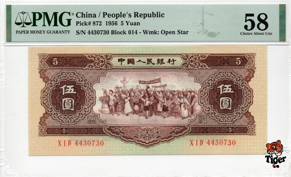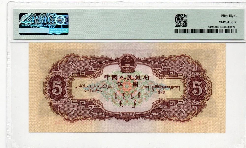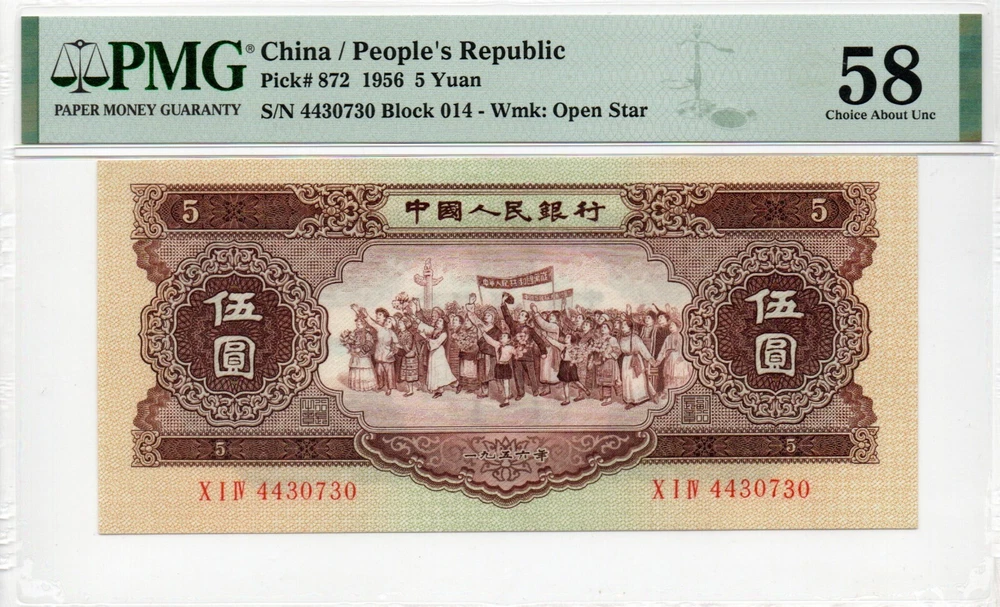 Auction Preview! China Banknote 1956 5 Yuan, PMG 58, SN:4430730 黄5元!