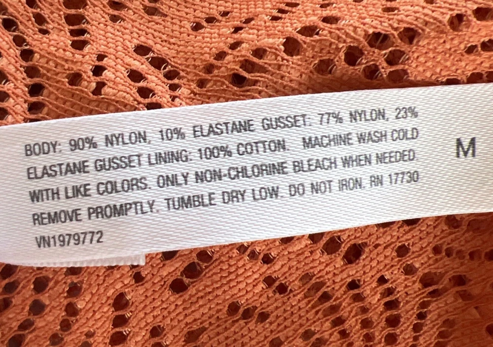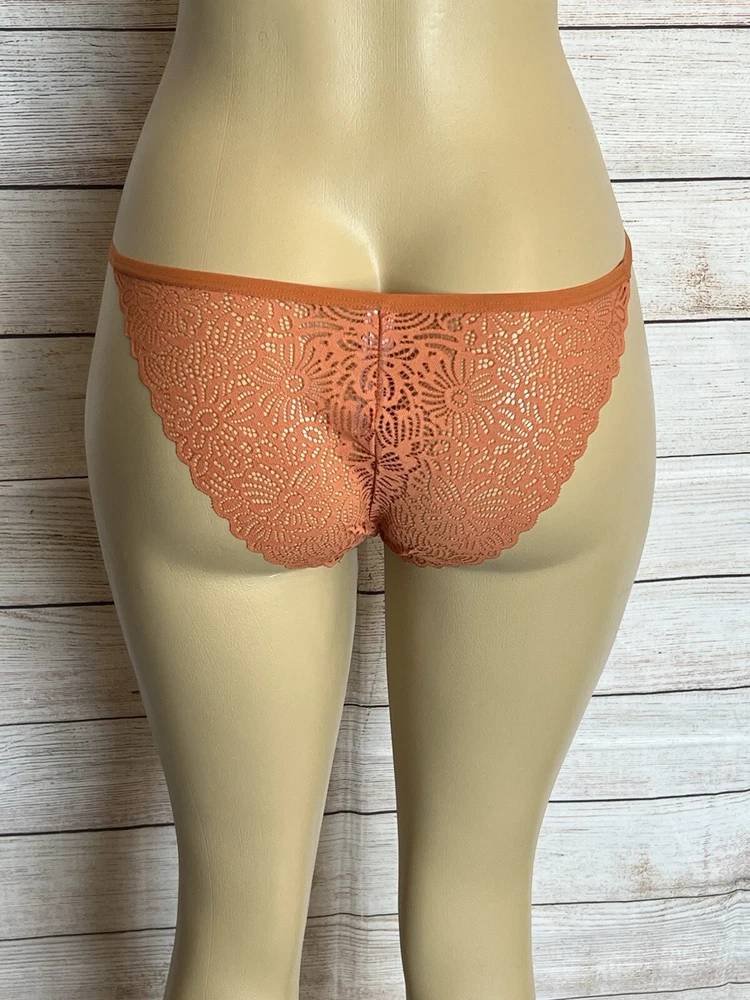 This is a women's orange lace tanga cheeky panty by Auden in size M. Made of lightweight nylon lace, this panty features a floral pattern and offers stretch for comfort. It is machine washable and designed with a compression area at the waist. The brand is Auden, and the country of manufacture is Sri Lanka.