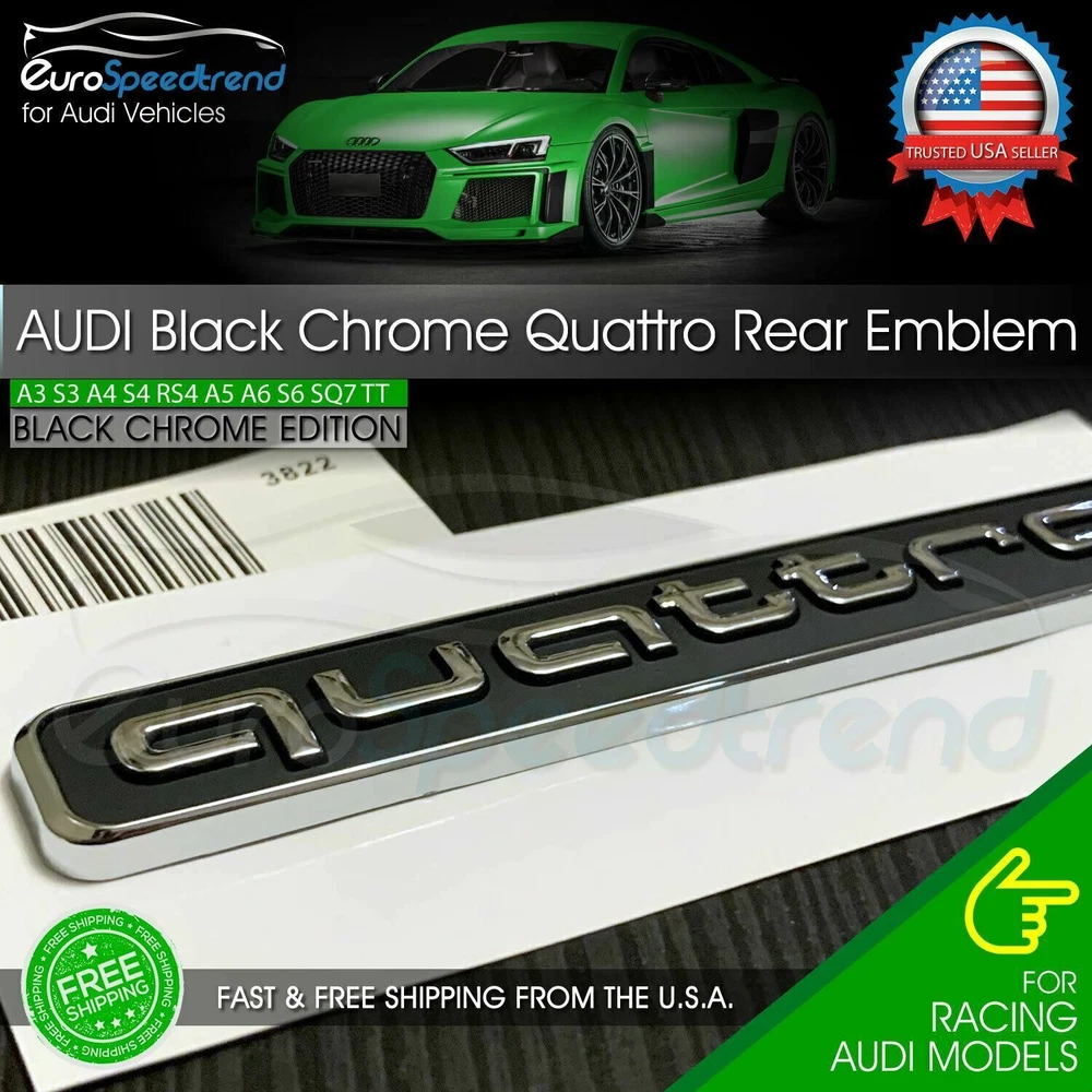 Freshen up the look of your beloved Audi with our Premium Quality OEM Chrome Black "QUATTRO" Badge Rear Trunk Emblem for most Audi Sport Models. It will make your already sporty Audi even more special and personalized. Please refer to the recommended vehicles list below. NOTE: This is for OEM Chrome Black "QUATTRO", if you need the ALL GLOSS BLACK "QUATTRO" CLICK HERE. NOTE: This is for OEM Chrome Black "QUATTRO", if you need the OEM RED Black "QUATTRO" CLICK HERE. NOTE: This is for OEM Chrome Black "QUATTRO", if you need the Modified Smaller RED BLACK "QUATTRO" CLICK HERE. NOTE: This is for OEM Chrome Black "QUATTRO", if you need the Modified Smaller CHROME "QUATTRO" CLICK HERE. Recommended Vehicles 2006-2019 Audi A3/S3 2005-2019 Audi A4/S4 2008-2019 Audi A5/S5 2002-2019 Audi A6/S6 2012-2019 Audi A7/S7/RS7 2001-2019 Audi A8/S8 2011-2019 Audi Q3/SQ3 2009-2019 Audi Q5/SQ5 2006-2019 Audi Q7 2001-2019 Audi TT Item Specs Material: Premium Quality Chrome Black “QUATTRO” Badge Measurement: Direct OEM Fitment - 3.75" x .5" / 95.25mm x 12.7mm Durable: Extremely durable Simple Install: Self-adhesive for simple install Painless Installation: Just peel and stick, no residue or damage Easy Installation • Completely clean and dry the surface before applying • Slowly peel off the back sheet off the decal and apply • Please allow 24 hours for it to completely cure Purchase 1x Premium Quality OEM Chrome Black “QUATTRO” Badge Rear Trunk Emblem