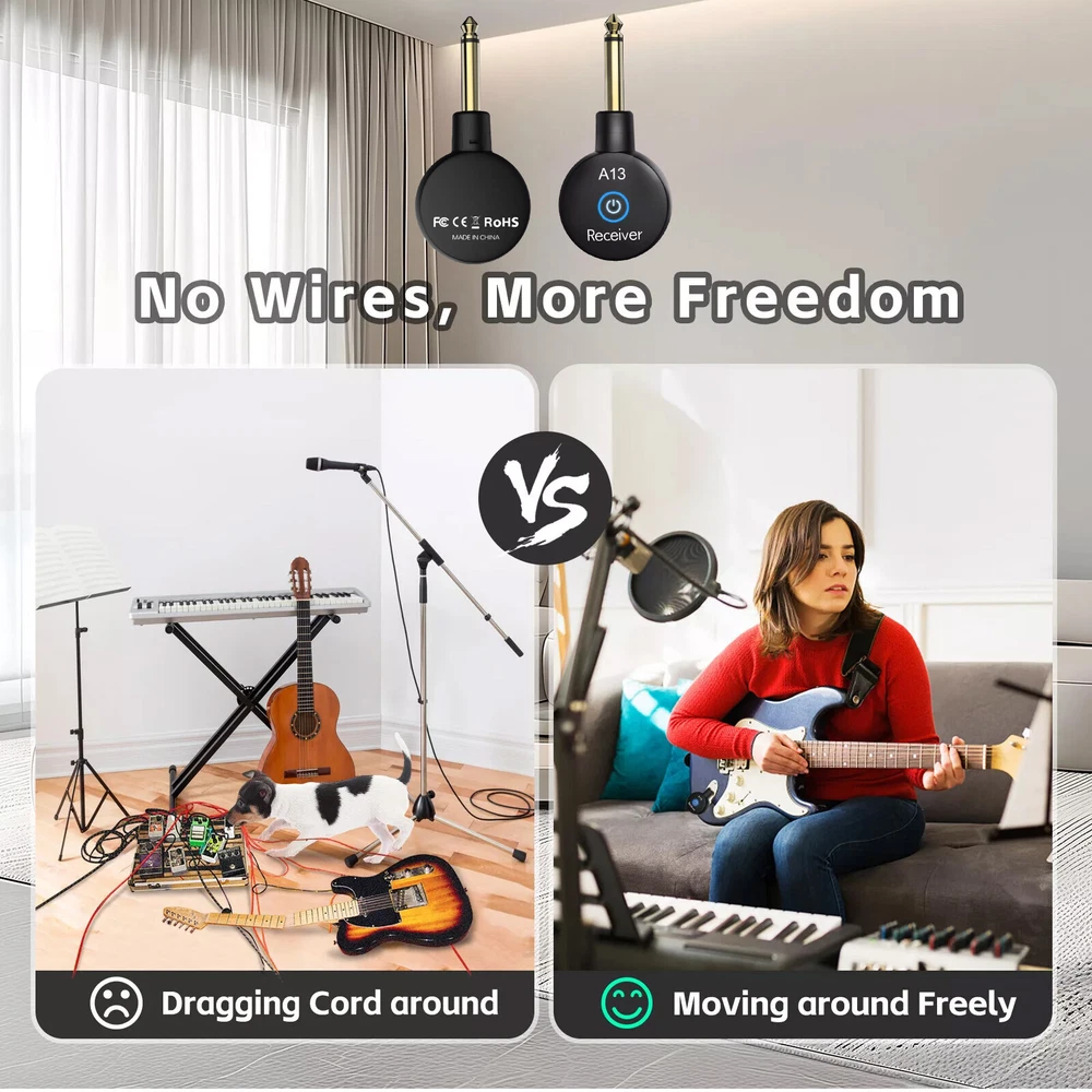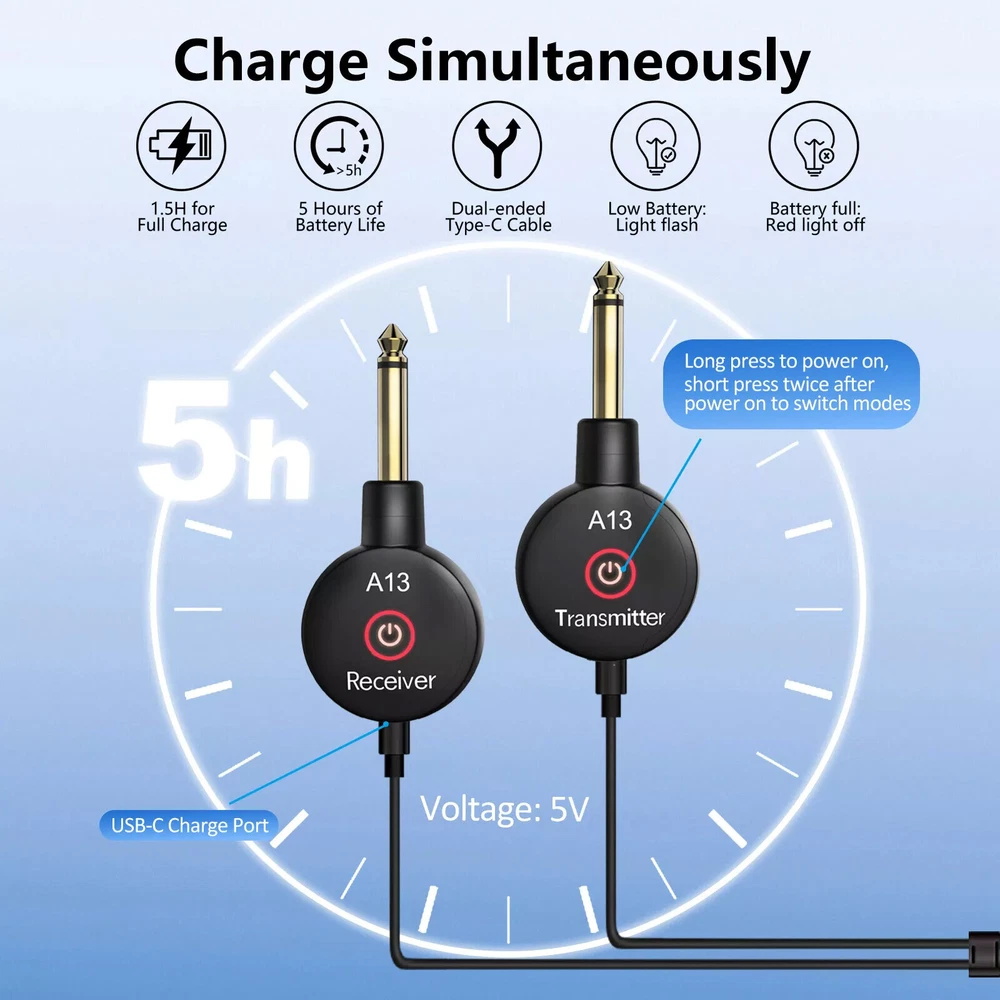 Description Clear Quality Signal Transmission] 2.4GHz digital wireless signal transmission with 24-bit/48KHz uncompressed conversion. High frequency which less than 4ms latency, no lag or no signal loss. effective range is about 100 feet. High quality restore the original guitar sound. [Rechargeable Wireless Guitar System] Built-in rechargeable lithium battery, working time is up to 5 hours after fully charged, and comes with a Dual-ended Type-C Charging Cable for convenient recharging, which ensures good performance for your every show. [Suitable for Variety of Occasions] This wireless transmitter and receiver system is compatible with all devices that have a 6.35mm (1/4") jack, including electric guitars, violins, basses, effect pedals, keyboards, and electronic instruments like the electric saxophone. INGPARTNER A13 wireless guitar system is designed for wireless connection to electronic instruments.This wireless guitar transmitter receiver has the characteristics of low delay, low noise, low interference, fast charging, long working time and high transmission. INGPARTNER A13 wireless guitar system in order to meet your requirements for perfect sound quality and best use experience, we have been working hard, so our guitar wireless transmitter receiver mission is to provide you with better stage performance, so that you can enjoy the best music experience! Wireless guitar makes strumming easy and happy, the wire winding pull, make playing the mood is not good.Wireless guitar transmitter receiver will be a best gift, throw away the cable, embrace the freedom of music, let yourself surrounded by 30 meters of surprise! Friendly Tips: 1.Due to the light and screen difference, the item's color maybe slightly different from the pictures. Please understand. 2.Please allow 1-2cm differences because of the manual measurement. Payment 1. We only accept payment through Payoneer. 2. Please make sure you have a valid account prior bidding. 3. Please pay for your item within 7 days after you order. Shipping 1. Buyer take responsibility in import / tax cost (not included in item price) 2. Pls contact with us to confirm extra cost if you need to upgrade the shipping option 3. If there's any concern about shipping, pls contact with us for further confirmation Return Policy 1. Refund or Replacement request is available within 30 days after parcel received and returning the item as the same condition as received. Please contact us to request a return authorization. Your name, auction number, and reason for return should be included in the message. 2. All items returned must contain all original packaging materials. Please repack the item carefully. Items returned will be tested and a new replacement will be shipping to buyer punctually. 3. In the event that a suitable replacement is not available then a refund will be issued. Shipping, handling and insurance fees are non-refundable. 4.If the item was found non-defective, the item will be sent back to buyer at buyer's expense. Items returned without authorization will be refused and returned to sender/buyer. 5. Buyer pay the shipping cost if the item damaged artificially, or buyer say "not like it", "size/color was different per they imaginary", etc. Contact us Please contact us via ebay message any time, all questions will be replied within 12 working hours. Customer Support Online : 9:00am - 22:00pm (GMT +8) Everyday