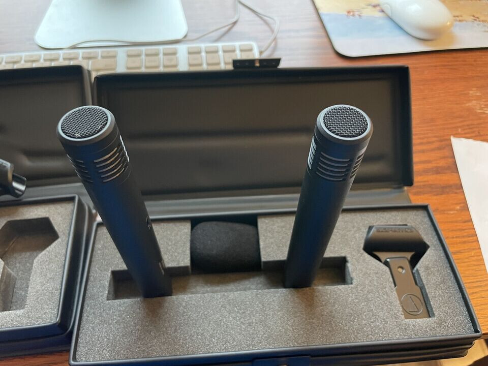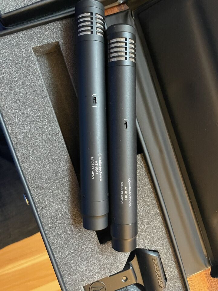 Used pair of Audio Technica AT4041 cardioid small diaphragm condenser microphones. Comes with cases clips and wind screens.