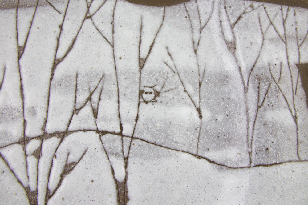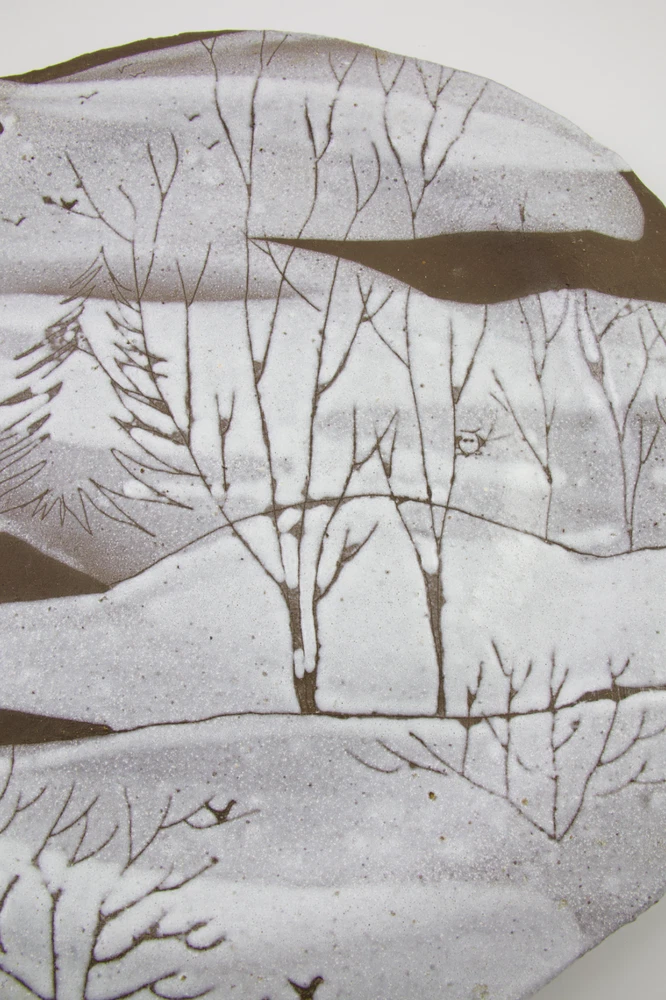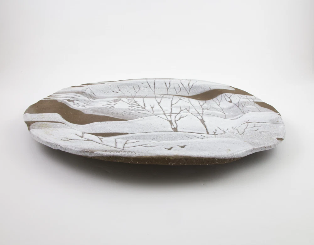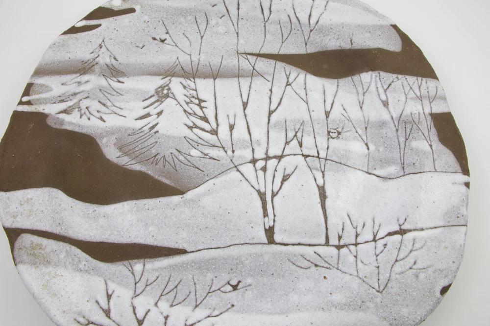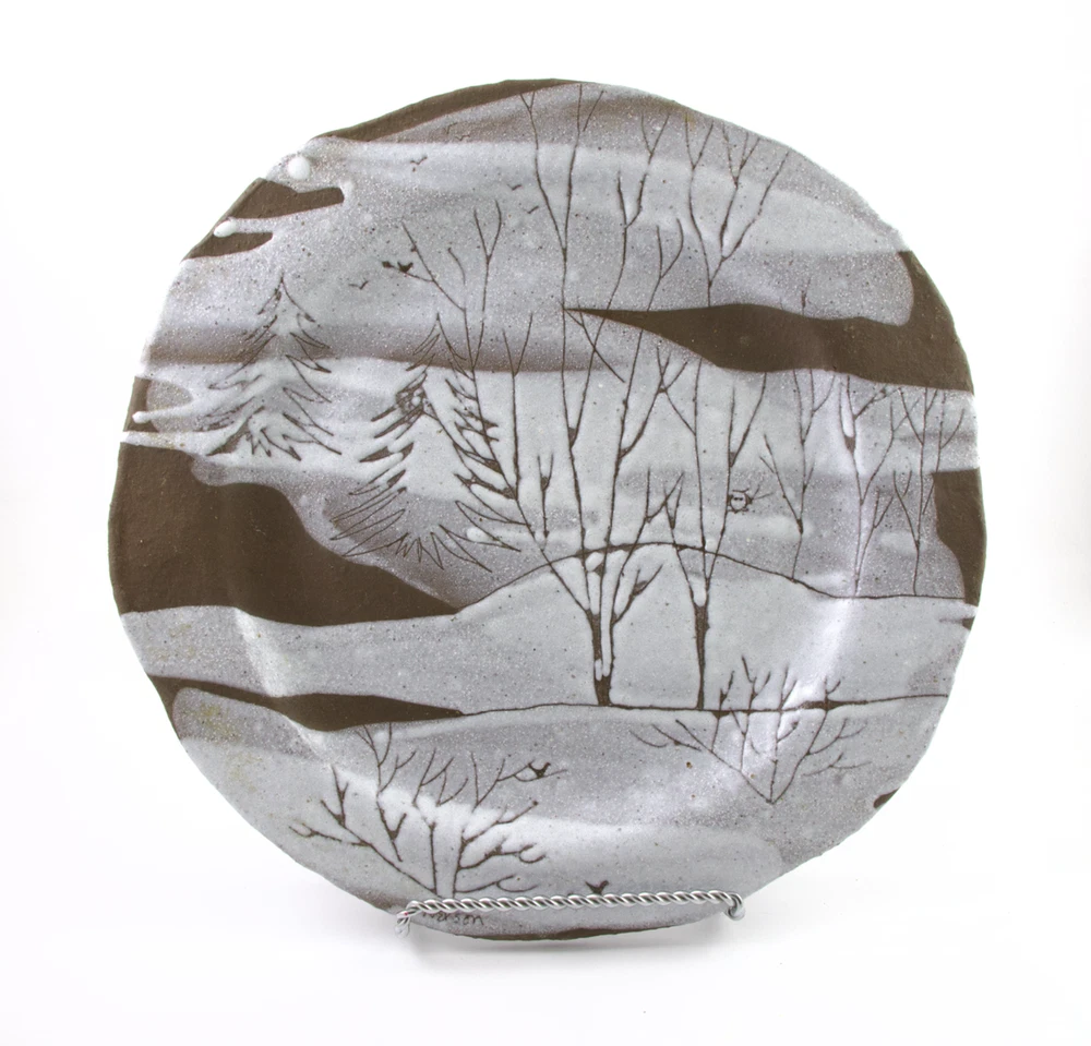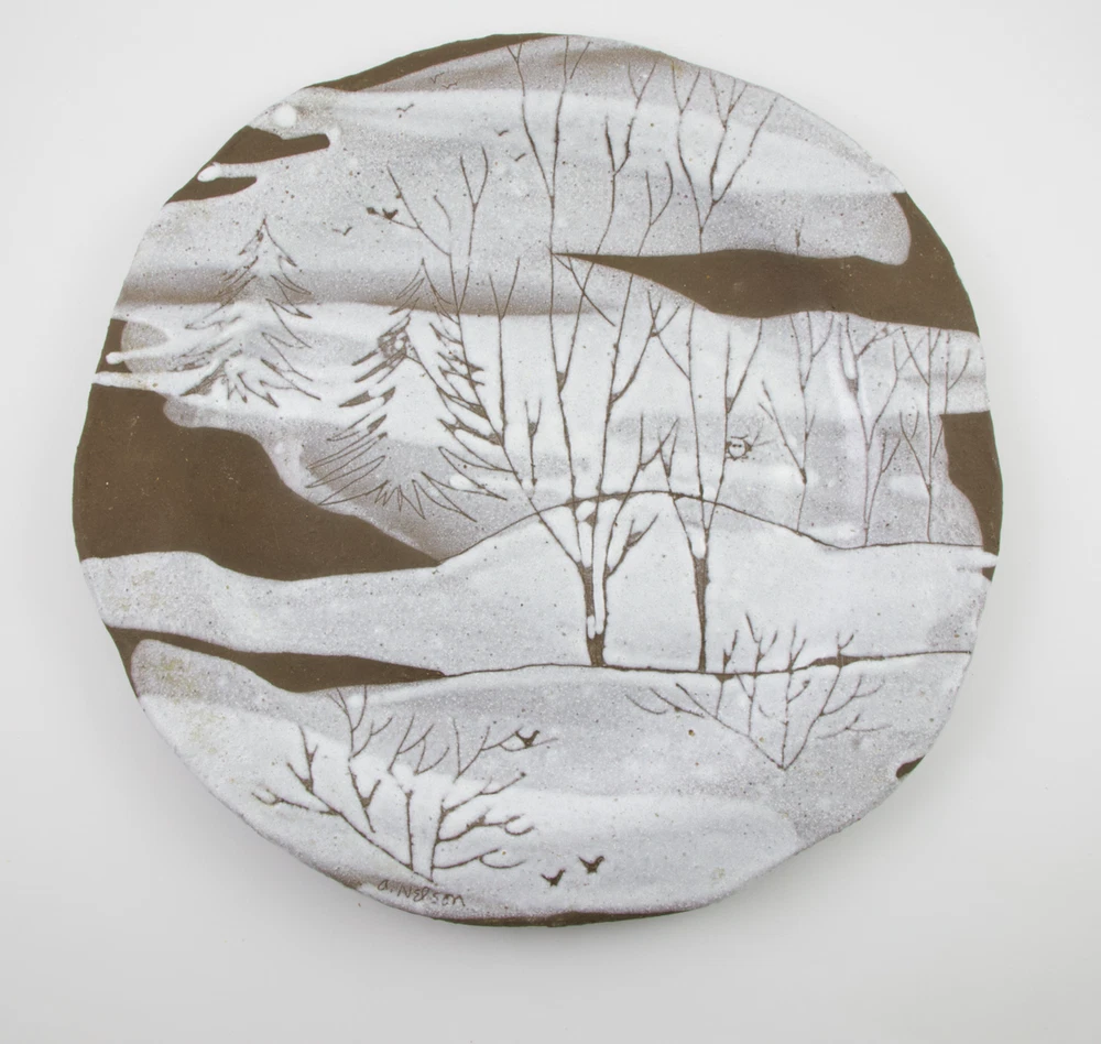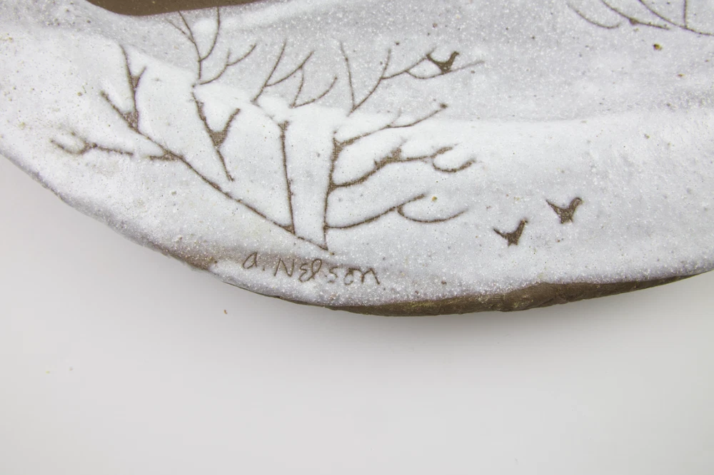 Shape: Round Backstamp: Incised Handmade: Yes Vintage: Yes Country/Region of Manufacture: United States Type: Plate/Platter Finish: Glossy & Matte Pattern: Winter Forest Color: Brown & White Origin: America Production Technique: Pottery Seller Notes: “See Below For Details” Material: Clay Brand: Audrey Nelson Style: Mid-Century Modern