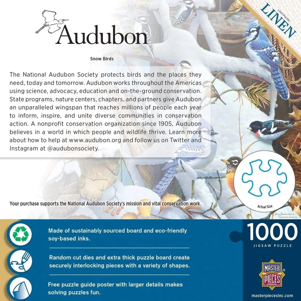 This MasterPieces 19.25" x 26.75" 1000pc Audubon Puzzle is full of colorful beautiful songbirds of North America and sponsored by the National Audubon Society. Winter birds foraging for food. Audubon Snow Birds 1000 Piece Jigsaw Puzzle Masterpieces 19.25 X 26.75 Inches This MasterPieces 19.25" x 26.75" 1000pc Audubon Puzzle is full of colorful beautiful songbirds of North America and sponsored by the National Audubon Society. Winter birds foraging for food. Product Attributes: Weight (lbs.) : 1.25 lb UPC: 705988721168 Brand: MasterPieces