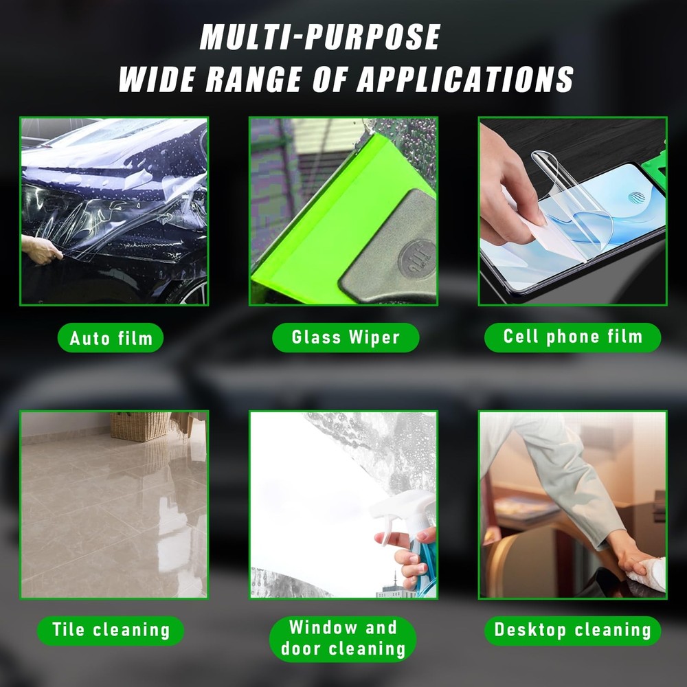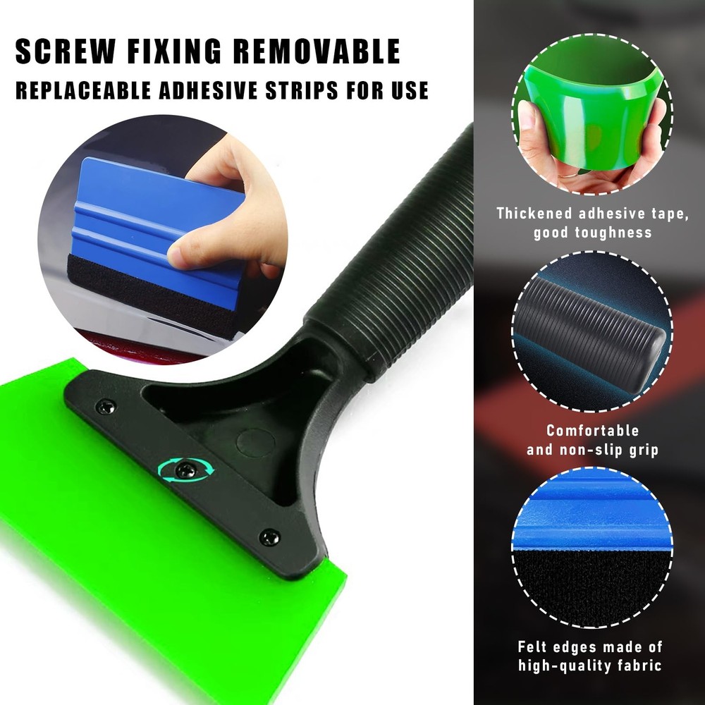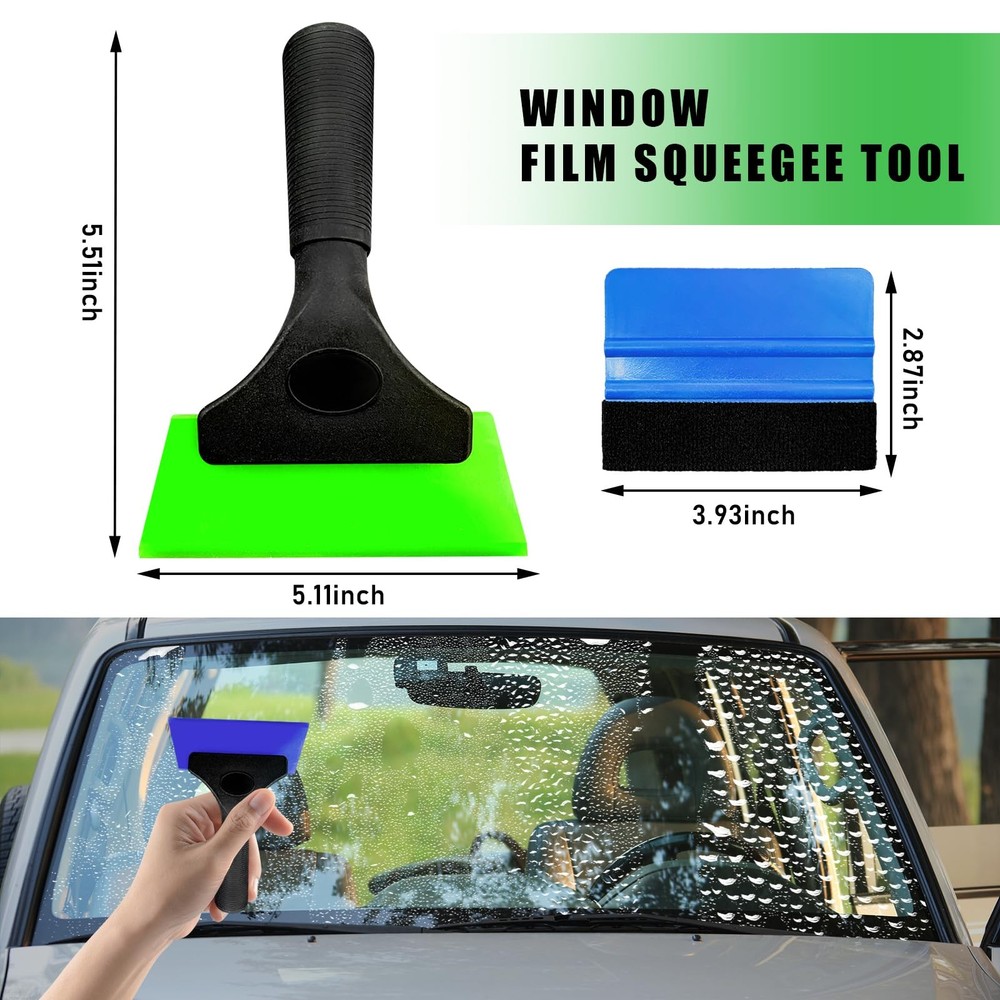 Speification: Material: Plastic Color: Green, Blue, Red Quantity: 2 PCS Weight: 0.34 lb Small Squeegee Size: 5.5 x 5.1 inches Felt Squeegee Size: 3.9 x 2.9 inches Fit Type: Most Cars More details of this window tint kit: -The squeegee for vinyl is beautiful and practical. -Easily removing decals yet surface-friendly, easily replaced. -Double edged felt squeegee, economical yet durable, sharp yet flexible. 【Good Material】: The tool kit contaims rubber squeegee and felt squeegee. This felt squeegee is made of high-quality polyethylene with felt, ensuring its durability for long-term use. The rubber squeegee is made of thermoplastic rubber stripe and plastic handle. A non-slip design has been added to the handle, and the rubber adhesive strip is tough, bendable and not easy to break. 【Smooth & Scratch Free】: The versatile felt squeegee, designed for vinyl applications, excels at tasks like water removal, dust cleaning, and air bubble elimination, ensuring a flawless and scratch-free window tinting installation. Felt edge squeegee made of high quality fabric felt edges,is greatly reduce scratches and marks on the surface on vinyl surface when install. 【Multi Function】: This multi-function window tint and vinyl wrap kit is perfect for a wide range of projects. Whether you're working on carbon fiber vinyl wrap, glass film installation, window tinting, wallpaper smoothing, or decals, this car wrap kit is suitable for various applications. From homes and garages to offices and warehouses, it is a good tool kit for any setting. 【Easy to Use】: These vinyl wrap tools are thoughtfully designed for easy operation and ensure exceptional results every time. Furthermore, its compact size and specialized design make navigating tight gaps and corners effortless. Whether you're tackling a professional project or embarking on a DIY endeavor, these tint tools guarantee the success of your smoothing tasks. 【Wide Application】: Portable and versatile, it can be used not only on window film but also as an auxiliary tool on any smooth surface, such as wall decals, posters, paint protection film, wallpaper installation, decals, and wrap film. Aditionally, it can be used as a water wiper for glass.