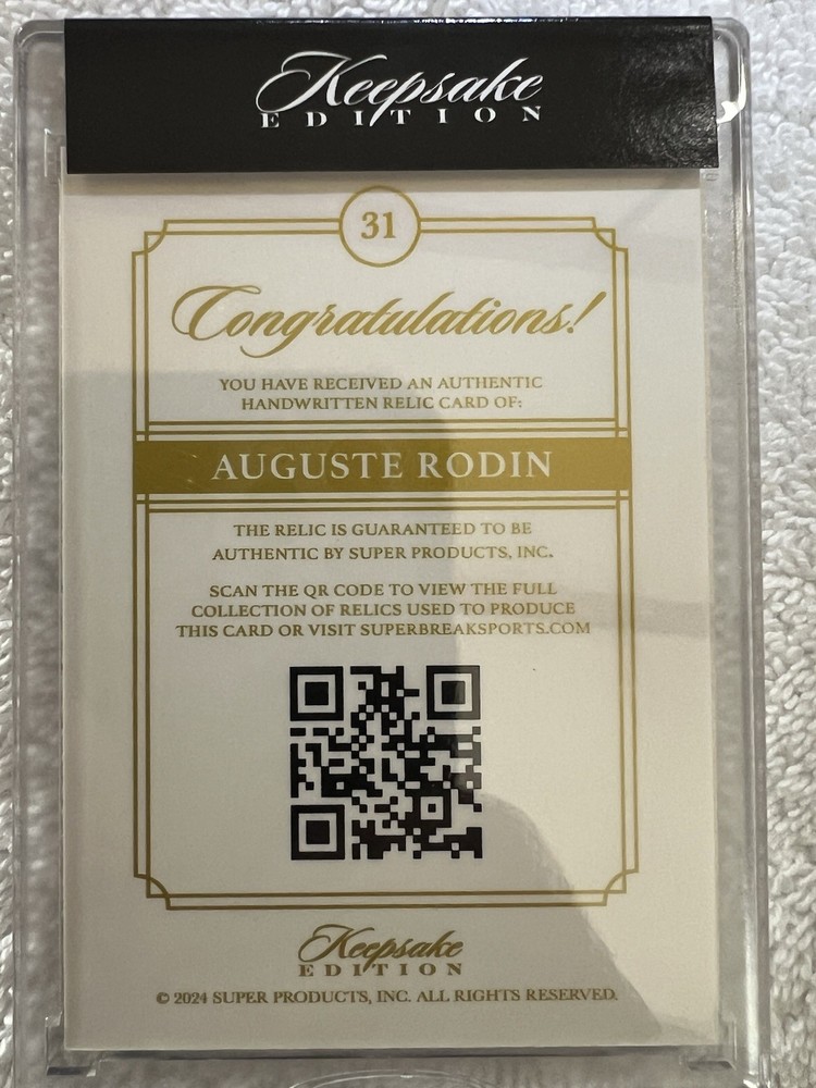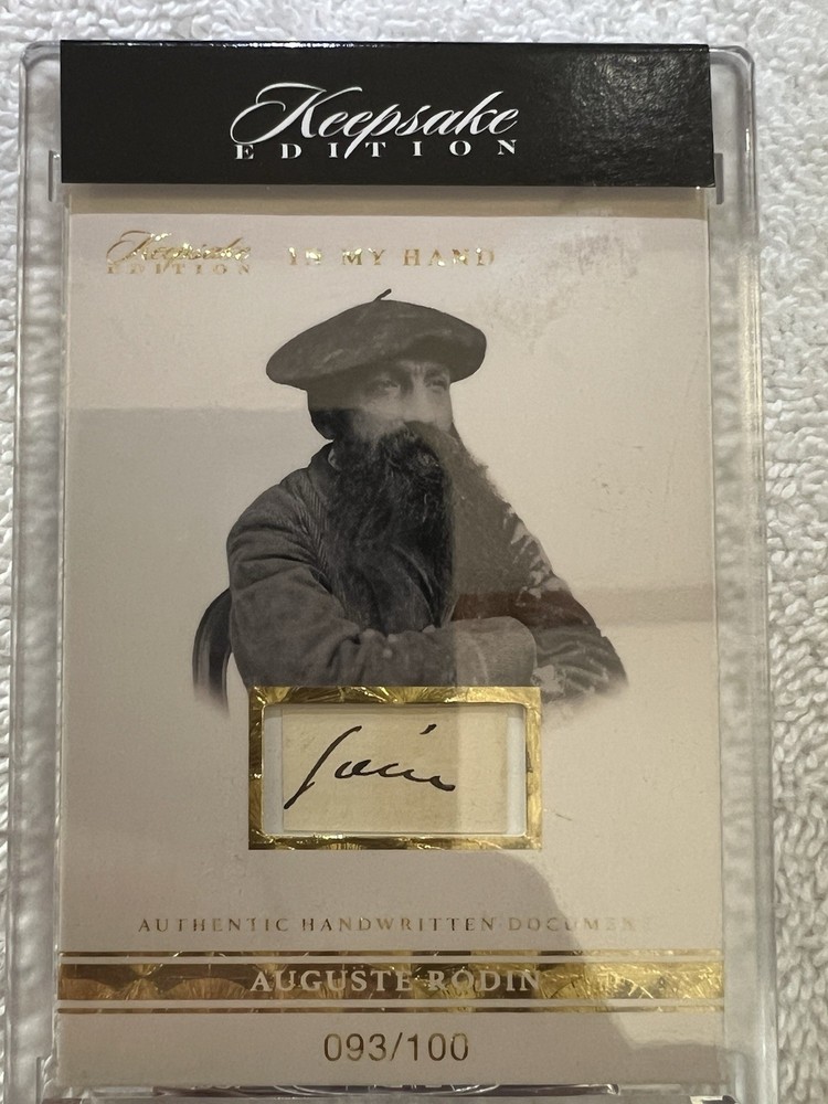 Delve into the world of art and collectibles with the Auguste Rodin 2024 Keepsake Handwritten Edition, card number 93, out of a limited series of just 100. This unique non-sport trading card features the distinguished sculptor Auguste Rodin, capturing the essence of his artistic legacy. Crafted with care by Super Products Inc, it is a treasure for enthusiasts and collectors alike. The card hails from the exclusive "In my hand edition," and as an ungraded piece, it promises an authentic and untouched charm. Its handwritten features add a personal touch, emphasizing its rarity and making it a standout addition to any collection. Cherish this keepsake edition that celebrates the vision and creativity of a renowned artistic figure.