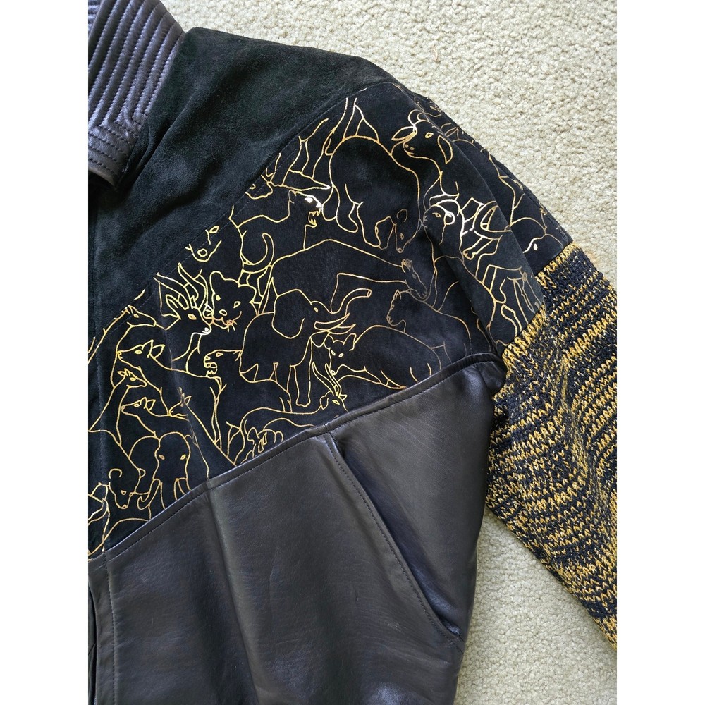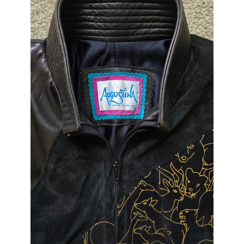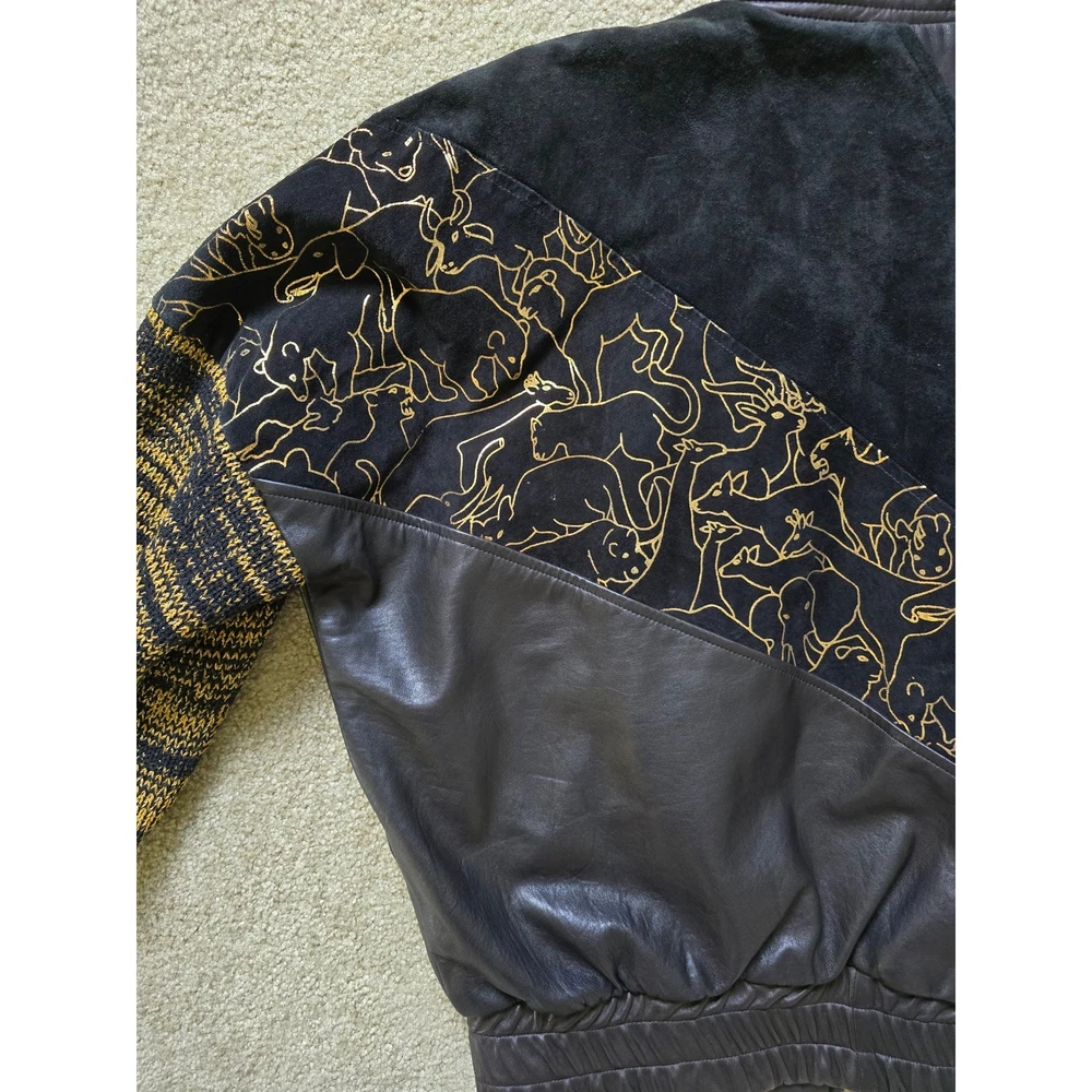 Augustina Carmel By The Sea Leather Bomber Jacket Wearable Art, Gold Jungle Animals, Gold/Black Knitted Sleeves, Super Soft Leather, Suede Leather, Padded Shoulders, Pockets. Truly a unique one of a kind piece! Good Pre-Owned Condition --there is some wear to the suede leather part around the shoulders and part of the gold trim is missing from the one animal outline. Please note photos! Pit to Pit 26" Sleeve Length from Shoulder 23" Length from Shoulder 23"