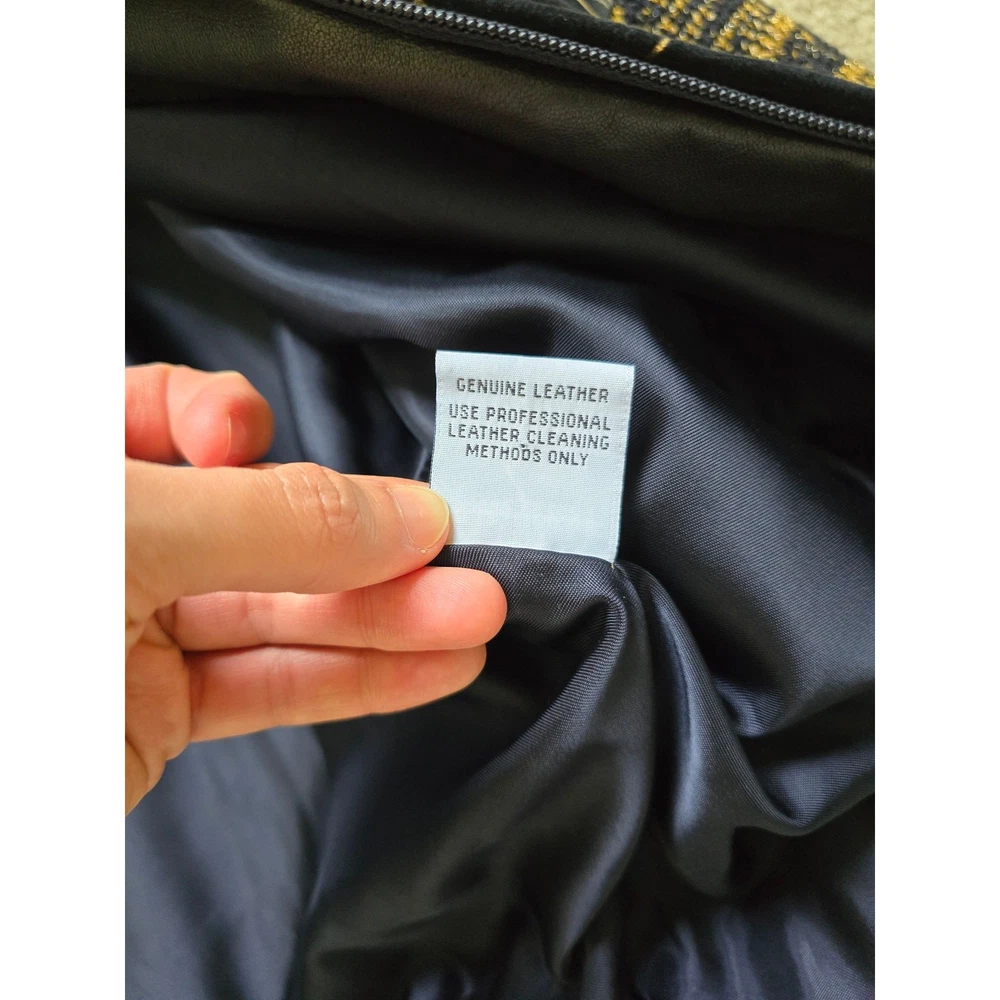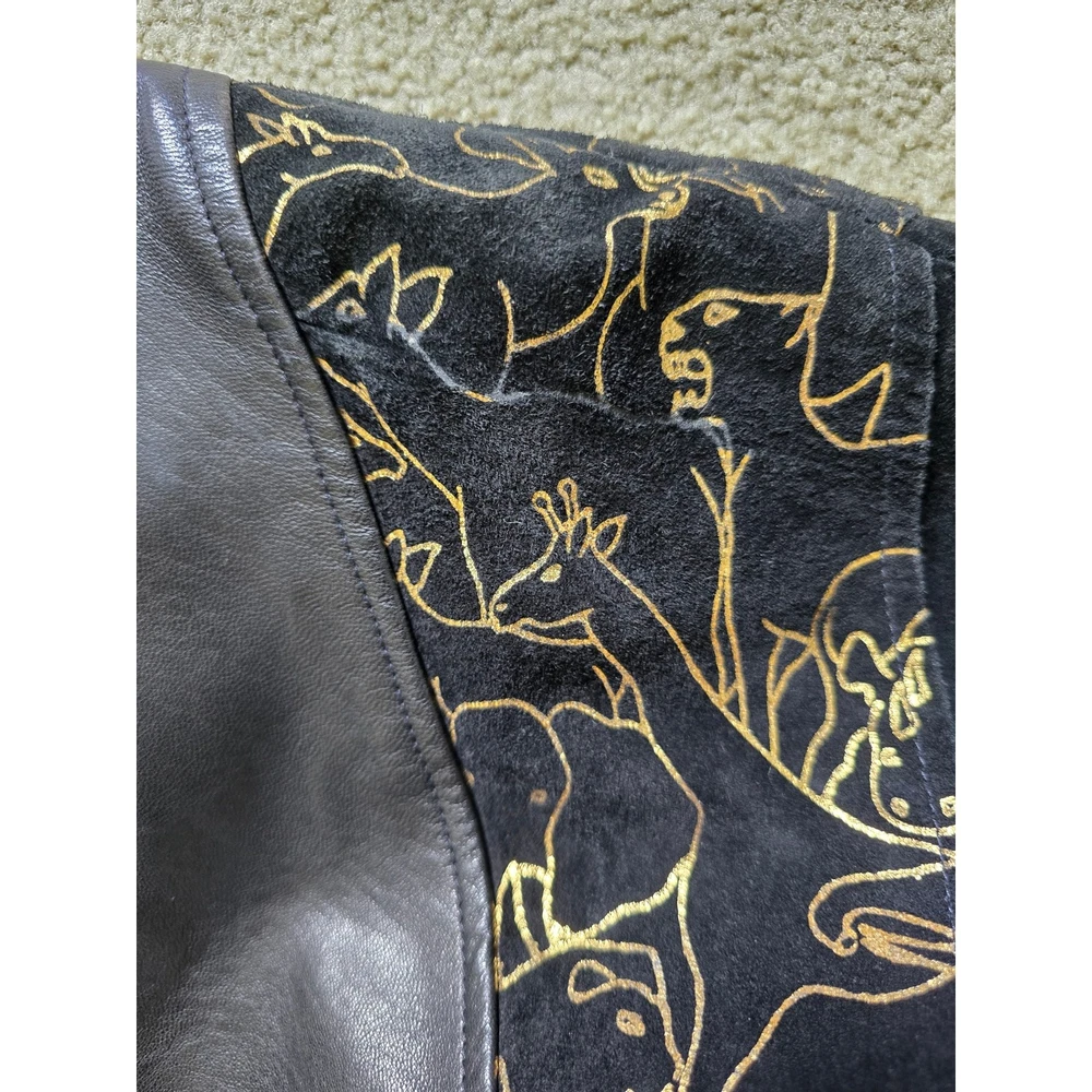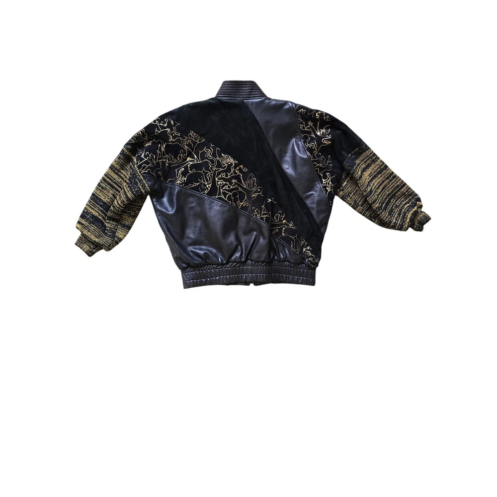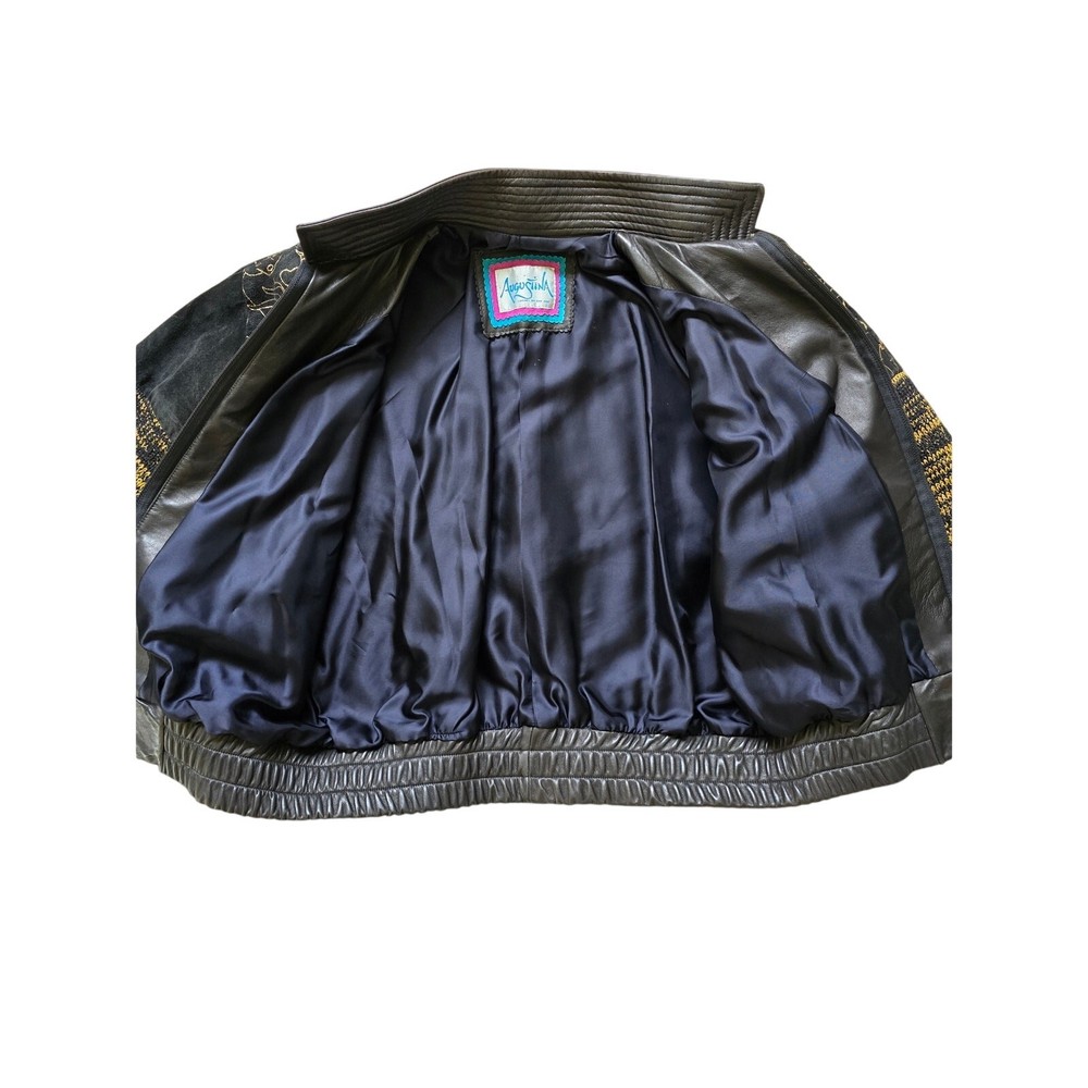Augustina Carmel By The Sea Leather Bomber Jacket Wearable Art, Gold Jungle Animals, Gold/Black Knitted Sleeves, Super Soft Leather, Suede Leather, Padded Shoulders, Pockets. Truly a unique one of a kind piece! Good Pre-Owned Condition --there is some wear to the suede leather part around the shoulders and part of the gold trim is missing from the one animal outline. Please note photos! Pit to Pit 26" Sleeve Length from Shoulder 23" Length from Shoulder 23"