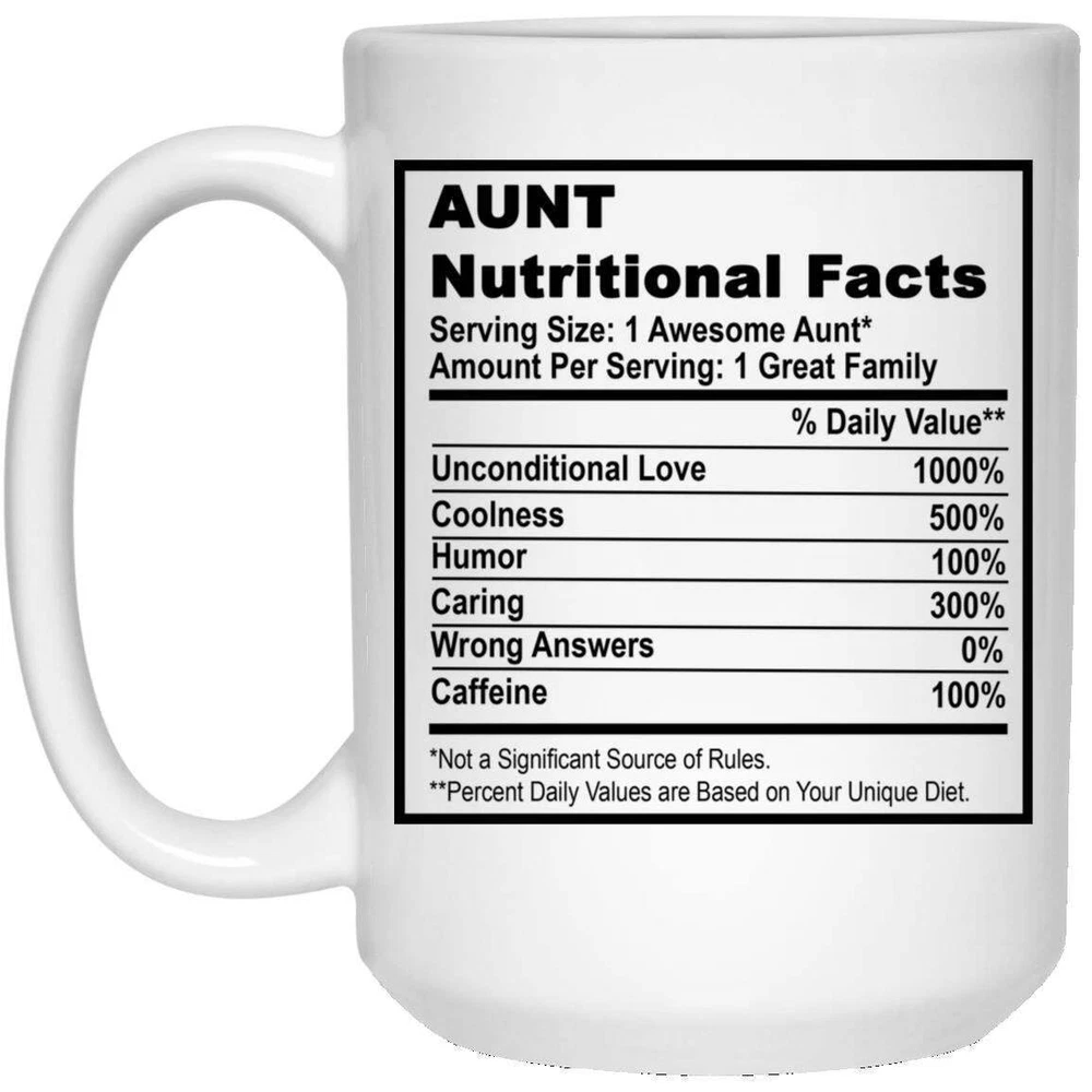 Aunt Nutritional Facts Coffee Mug Nutritional Facts Funny Coffee Mug Funny Gift Product Details.. This high quality 11oz. ceramic white mug has a premium hard coat that provides crisp and vibrant color reproduction sure to last for years. Perfect for all hot & cold beverages. The highest quality printing possible is used. It will never fade no matter how many times you wash it. Material: 100% Ceramic. Print both sides. Dishwasher and Microwave Safe. High Gloss + Premium White Finish. Printed in the U.S.A. Personalized & Custom. We support personalized and custom mug to add custom, when placing an order, you can add notes to the "order note" in shipping address section. Also you can contact us directly via message. Shipping Info. Ready to ship in 1 to 2 business days, All products are made-to-order and proudly printed in the United States. Shipped by USPS and DHL, You will receive your order in 5-7 days. Replace & Refund. All products are defective during shipping broken, chipped will be replaced free of charge. You are not satisfied with the product, we will refund 100% money to you. If any other issues arise, please do not hesitate to message, we would be more than happy to assist you.