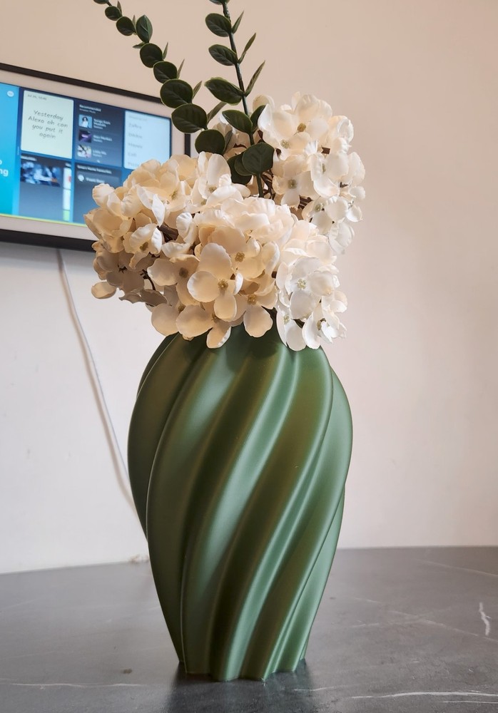 Bring modern elegance into your home with this spiral vase , a made-to-order piece that blends contemporary design with sustainable craftsmanship. Each vase is 3D printed to order , ensuring you receive a freshly made, unique item every time. Crafted from eco-friendly PLA bioplastic, the vase is lightweight, durable, and designed with a smooth spiral twist pattern that creates movement and style from every angle. Features: Made to Order – Each vase is freshly printed just for you, not mass-produced. Modern Spiral Twist Design – A sculptural form that stands out in any room. Eco-Friendly PLA – Biodegradable material made from renewable resources. Customisable Colours – Choose from a variety of finishes to suit your décor. Multi-Purpose – Perfect for dried flowers, pampas grass, or as a standalone decorative piece. Lightweight & Durable – Easy to move while strong enough for daily use. 📏 Approximate Dimensions: 240 H x W 155 mm 210 H x W 136 mm 180 H x W 116 mm 150 H x W 97mm This vase is ideal for coffee tables, shelves, desks, or dining areas. It also makes a thoughtful, one-of-a-kind gift for housewarmings, weddings, or birthdays.. Shipping Your vase will be dispatched within 24 - 48 hours of cleared payment Guaranteed next day delivery service via Royal Mail Special Delivery available for an additional fee.