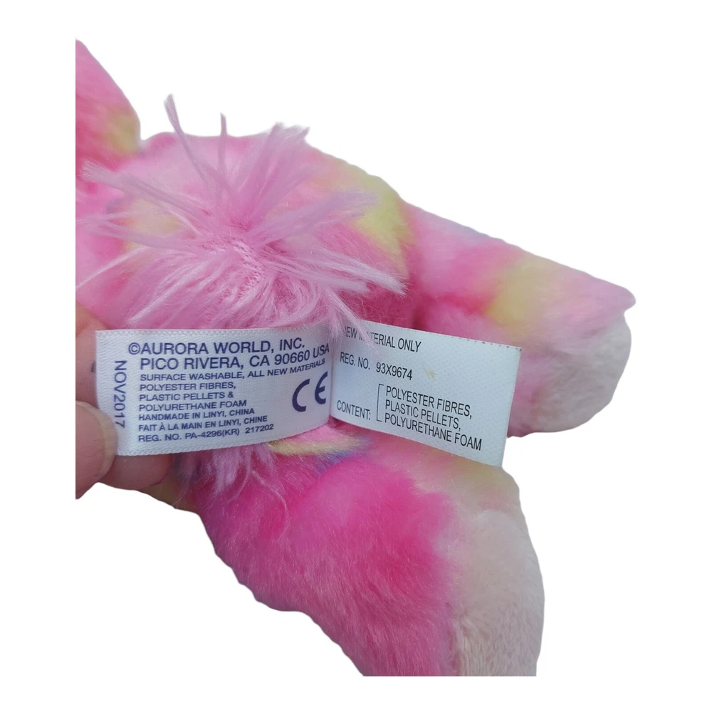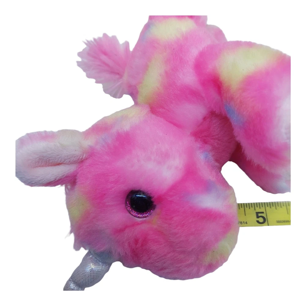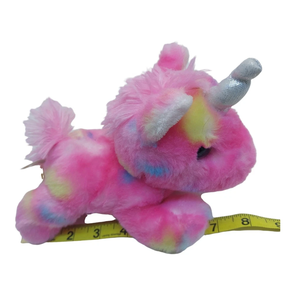 Aurora Pink multi-colored Plush Stuffed Animal 8" laying down