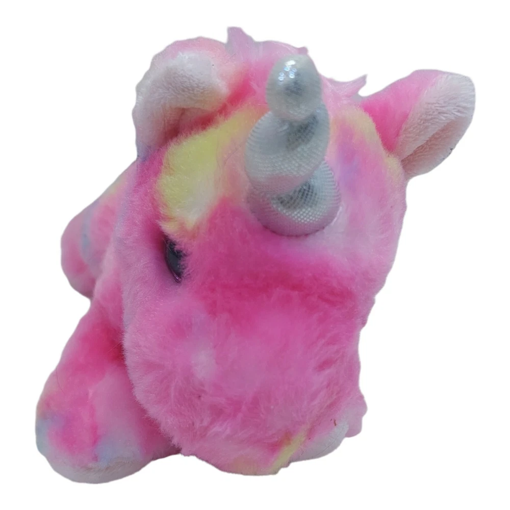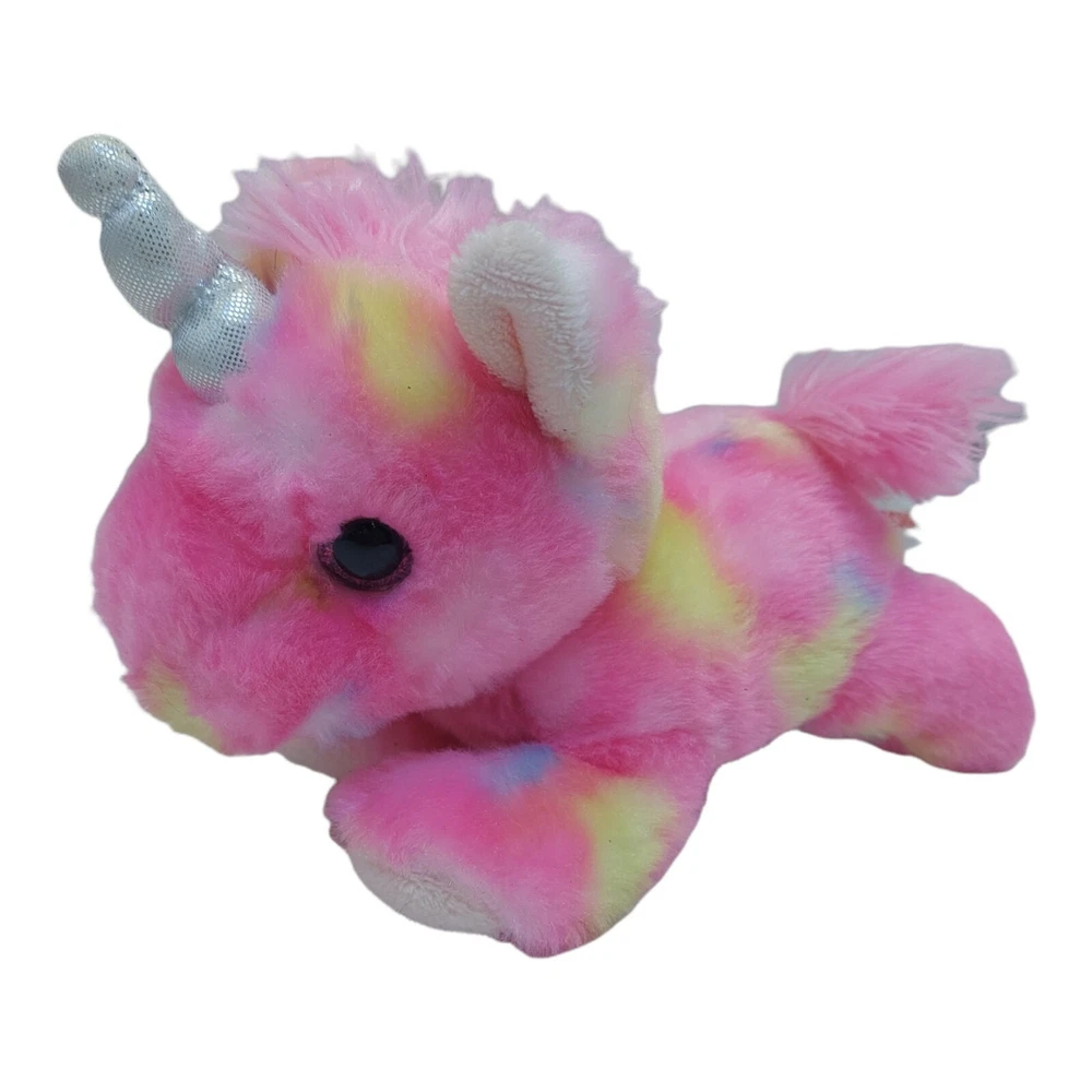 Aurora Pink multi-colored Plush Stuffed Animal 8" laying down.